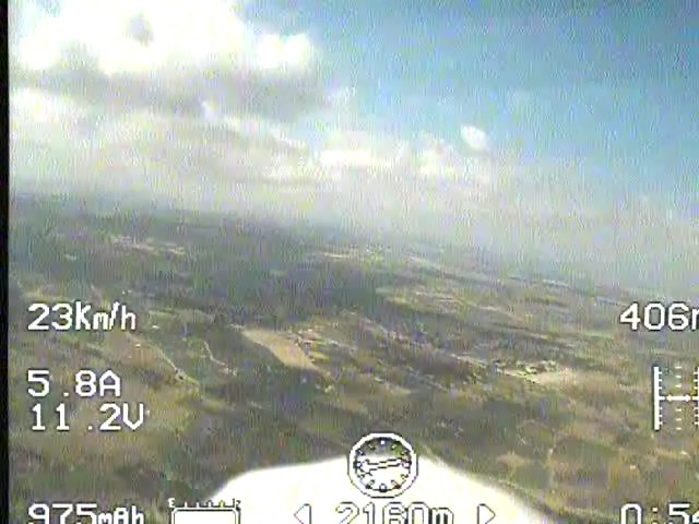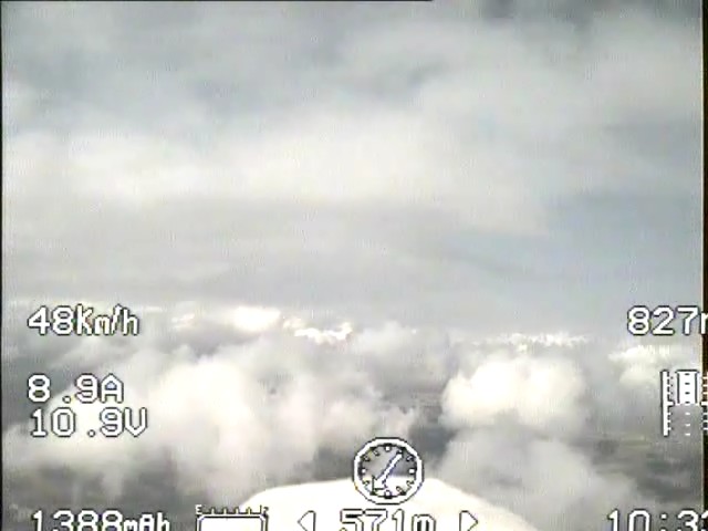 Hola compañeros, menudas semanitas llevo..., hoy hemos estado volando Ramon y yo en FPV y habia algo de nubes. He conseguido mi record de distancia en 1,3 km y he conseguido volar por encima de las nubes. Os dejo un fotograma del video. Mañana volaremos otra vez, el que quiera venir ya sabe...