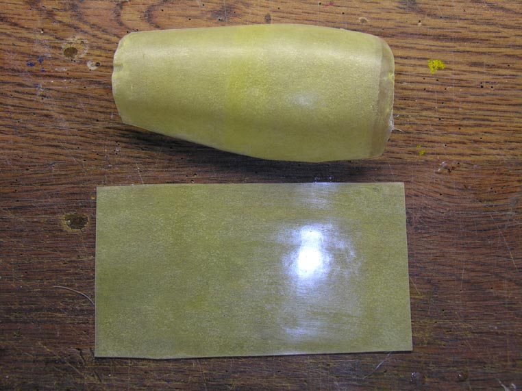 Una vez desmoldado, cosa que casi lo hace solo, se deja secar la escayola. Antes de aplicar la fibra con el epoxi de laminar, se dan tres manos de cera desmoldeante tanto a la escayola como al cristal, dejándolas secar y sacándoles brillo con objeto de que las superficies desmolden y queden lo mejor acabadas posible.