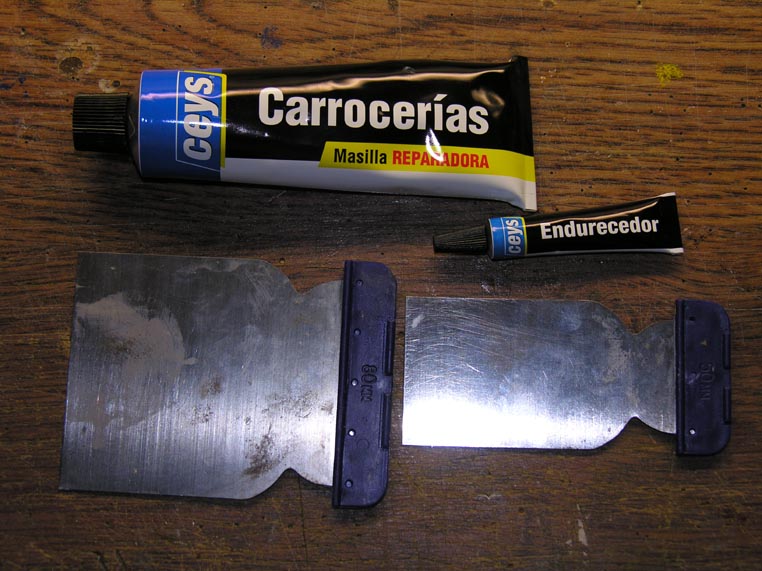 La masilla de carrocero que yo he usado es de la casa Ceys, la podeis encontrar en tiendas de pintura o en Leroy. Las instrucciones de uso son mezclar 5 lineas del tubo de masilla con una linea del tubito de catalizador, se hace una pasta y se aplica. En esta proporcion el tiempo de secado son unos 10 minutos.