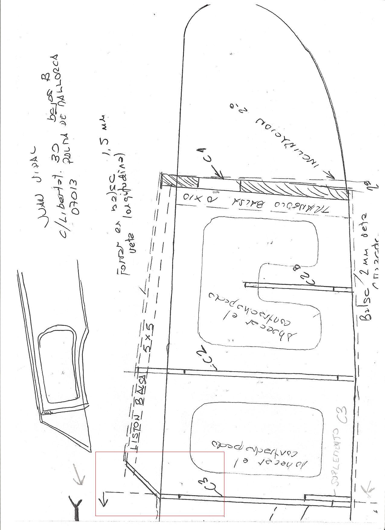 Ya tengo pegadas las cuadernas sobre un lateral, pero al ir a pegar el otro lateral, me surge una duda (ha sido al comparar los planos de MALAPATA con los de TIOAQUILES. Veo que en la cuaderna C3 (la mas cercana al ala), según el plano de TIOAQUILES, esta supera la altura del lateral, para que también apoye el larguero superior, pero en el de MALAPATA, no es así, la cuaderna queda enrasada superiormente con el lateral.