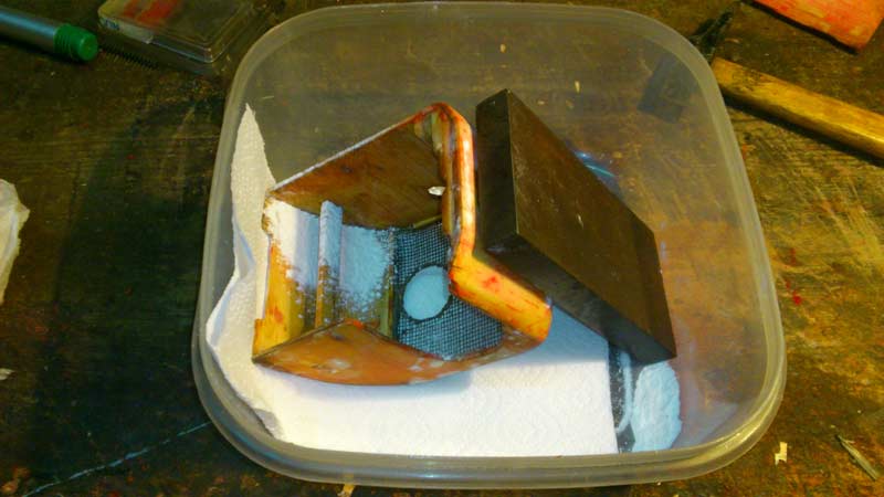 Con mucho amor y paciencia vamos retirando el solarfilm. No sale entero. Solo la parte de plástico trasparente. El colorante se queda pegao a la madera :oops: . Las partes empapadas en aceite con acetona y polvos de talco acabaran por volverse cristianas.