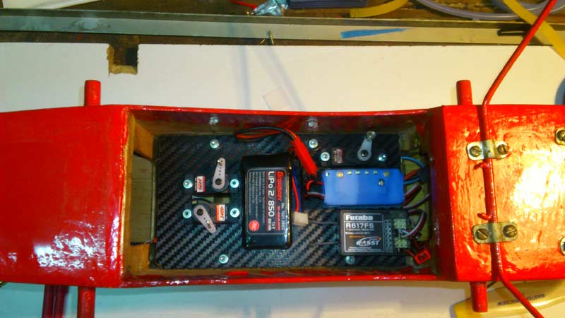 Hoy he rehecho la bancada de servos. Voy a poner unos pekeños de piñoneria metálica que dan 4kg a 6v :shock: .Queda el espacio justo para la lipo y el alimentador de bujía. La tapa de acceso al deposito ahora va con imanes de neodimio. He tenido que poner una agarradera que con la mano no había manera de sacarla jaja.
