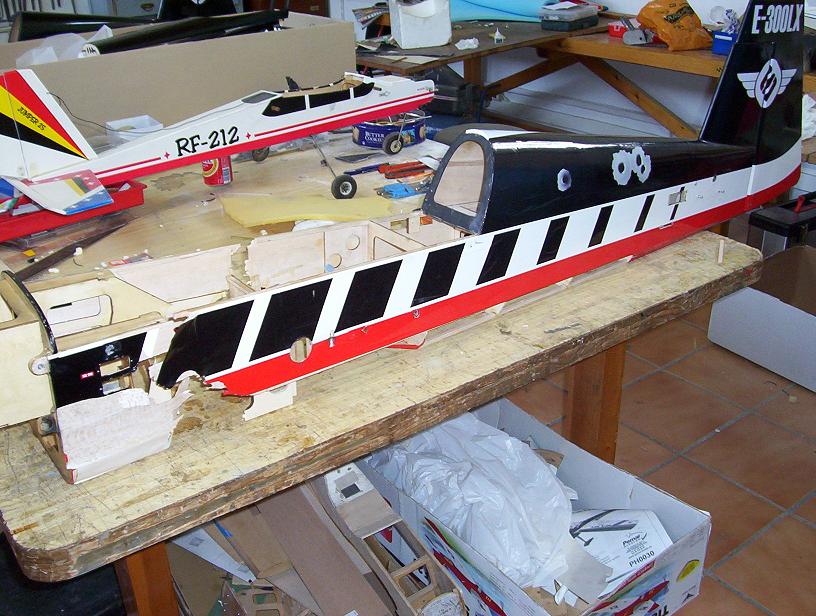 Este domingo despues de una maravillosa mañana de vuelos con mi extra 300lx de sable, por una desafortunada parada de motor justo en el despege y a unos escasos 10m de altura tuve que aterrizar mi extra en la tierra arada, el tren se demostro que era robusto, tanto que partio el fuselaje por la mitad dejandolo bastante dañado. Despues de recogerlo y ver los daños