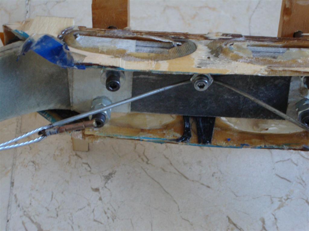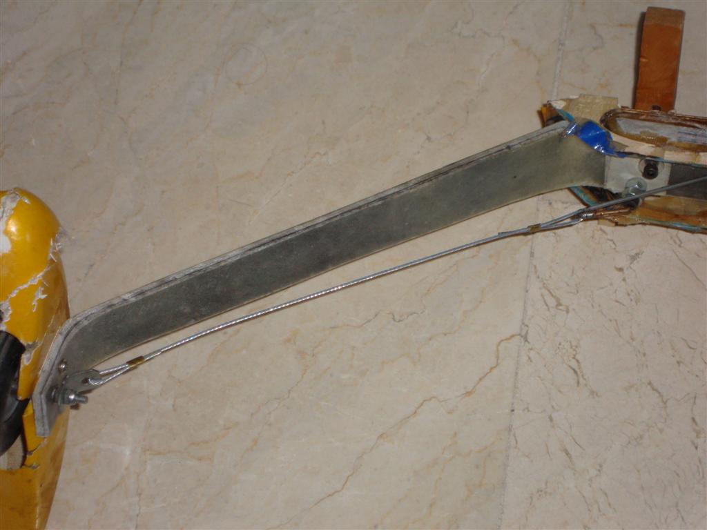 Sus pongo el refuerzo que pongo en algunos trenes.Si no te quieres complicar la vida con un muelle o "fusible", hazlo directo.En la foto es un cable trenzado, que que el avión pesa casi 7 Kg,pero en aviones mas pequeños cable mas fino o incluso solo varillas de bicicleta.