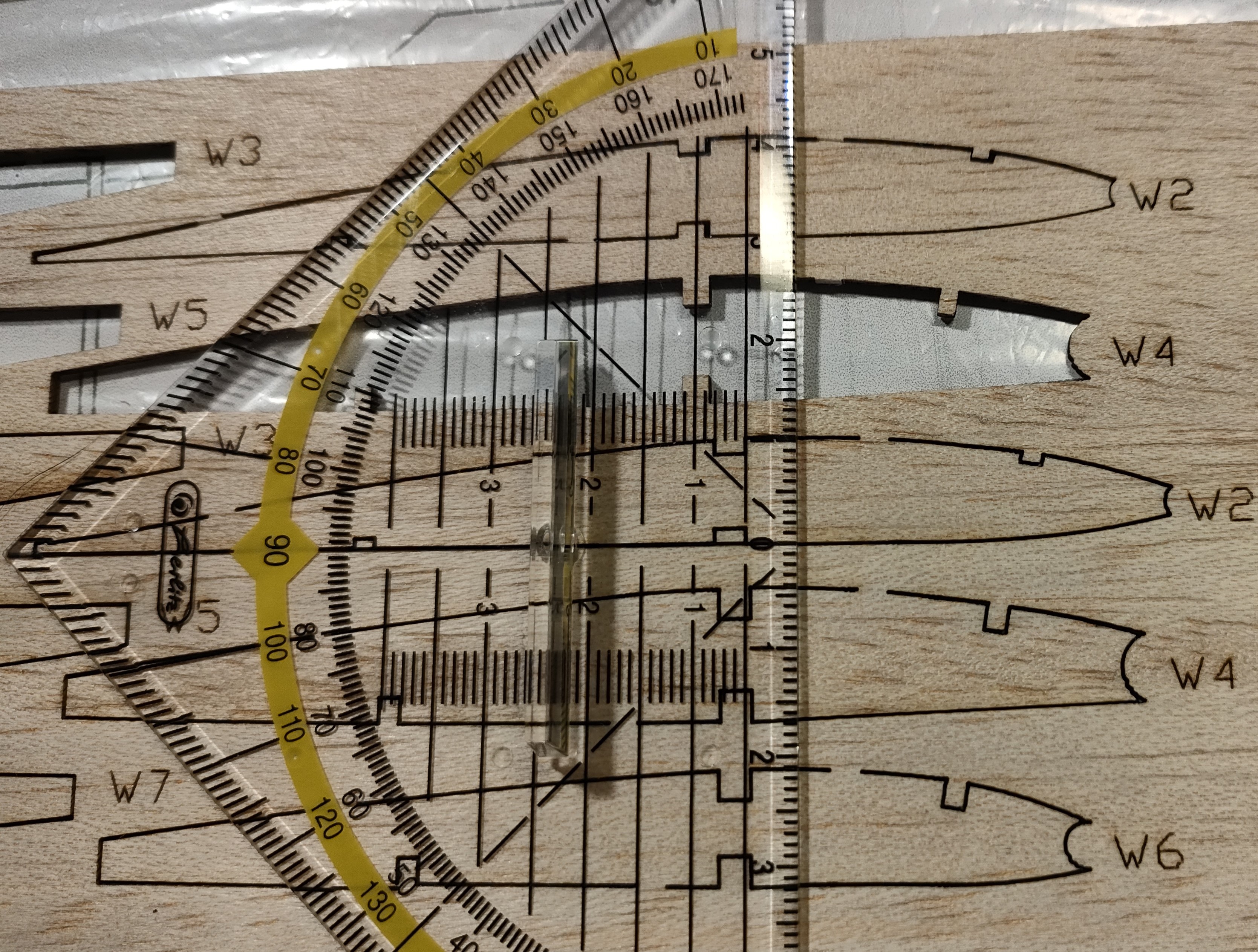 Y las traslado a las costillas, ayudándome del troquel. Medio centímetro por delante del larguero principal, donde todavía hay bastante espesor, 2mm por encima del larguero inferior en la costilla W2, y 1.5mm por debajo del larguero superior en la costilla de raíz, ambas por el lado de punta, más o menos medio milímetro menos por el lado de raíz para tener en cuenta el diedro.