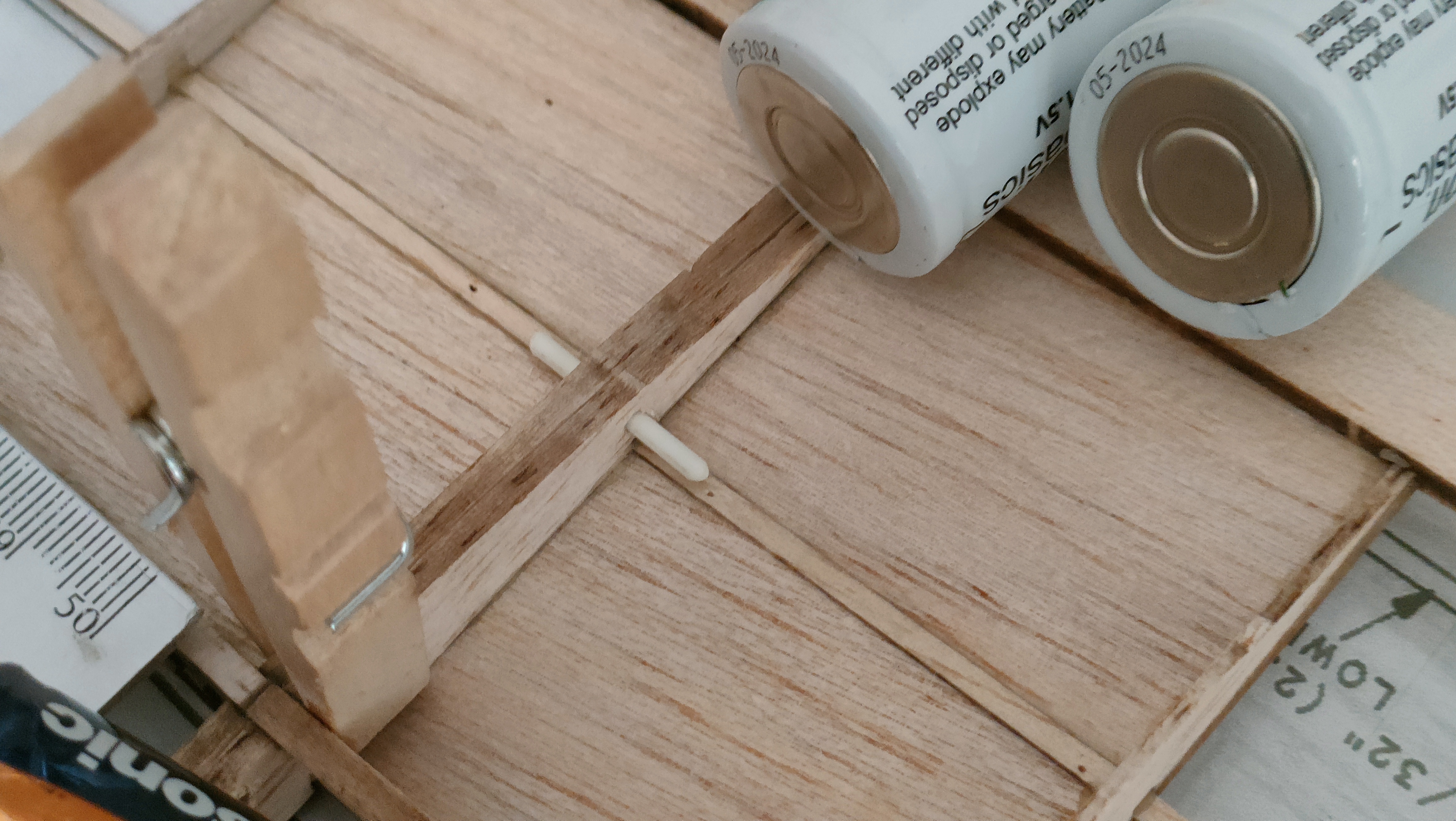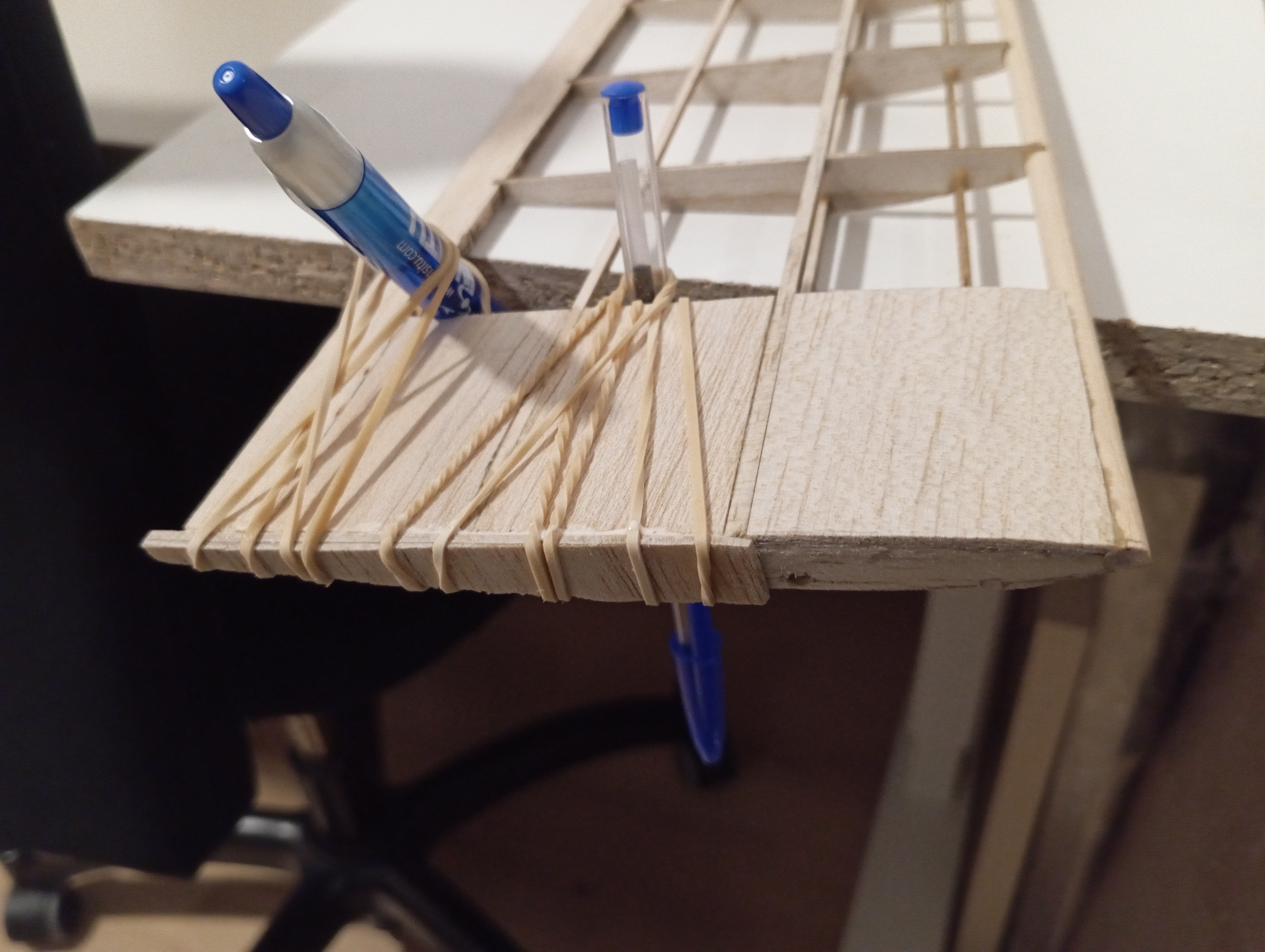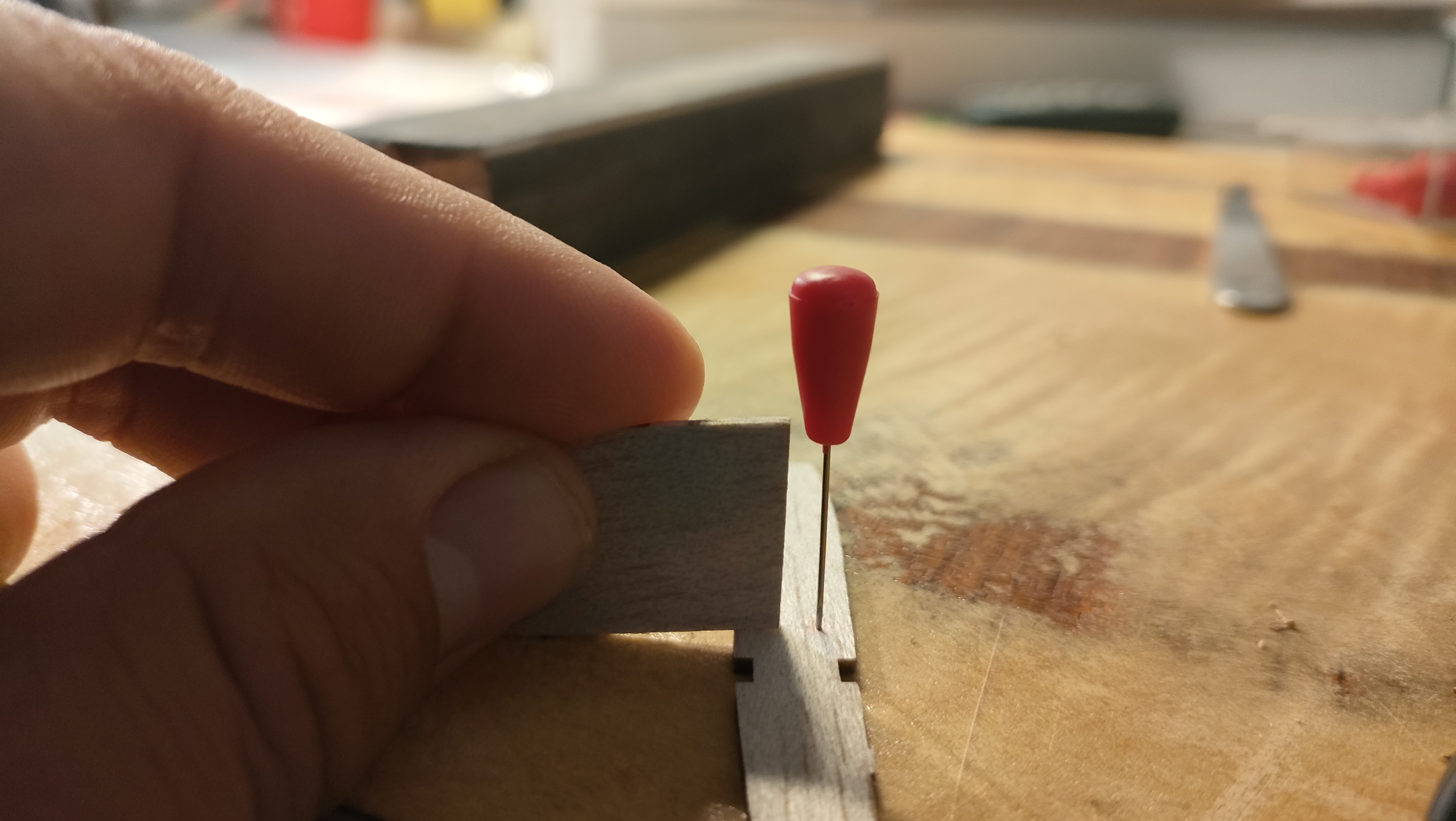 Luego pongo los travesaños verticales, mismo procedimiento: corte aproximado con bisturí, ajuste fino con lija, y alfiler fino para que quede en su sitio. Aquí sí hago ya la forma del larguero inferior. Otro par de horas de secado.