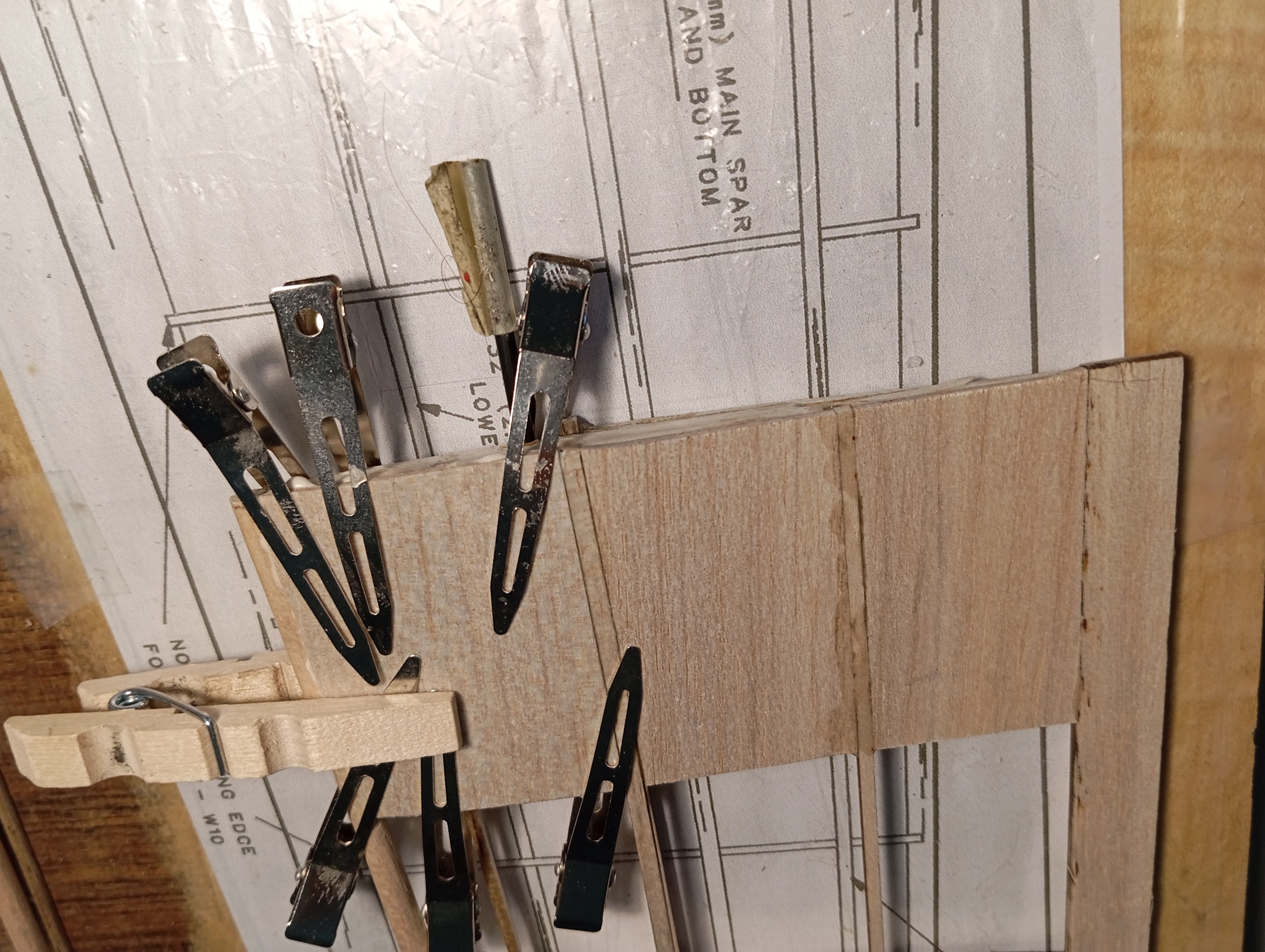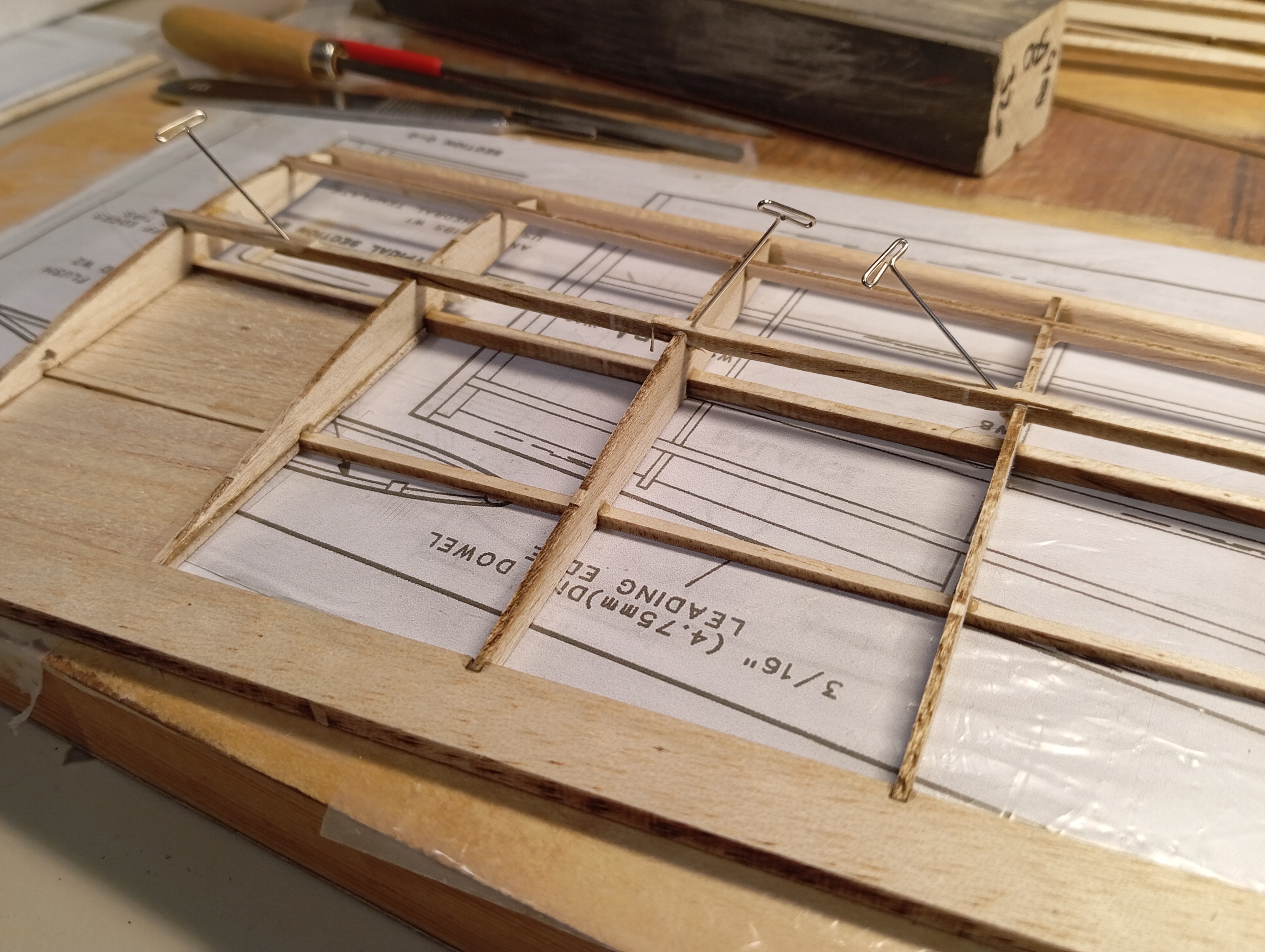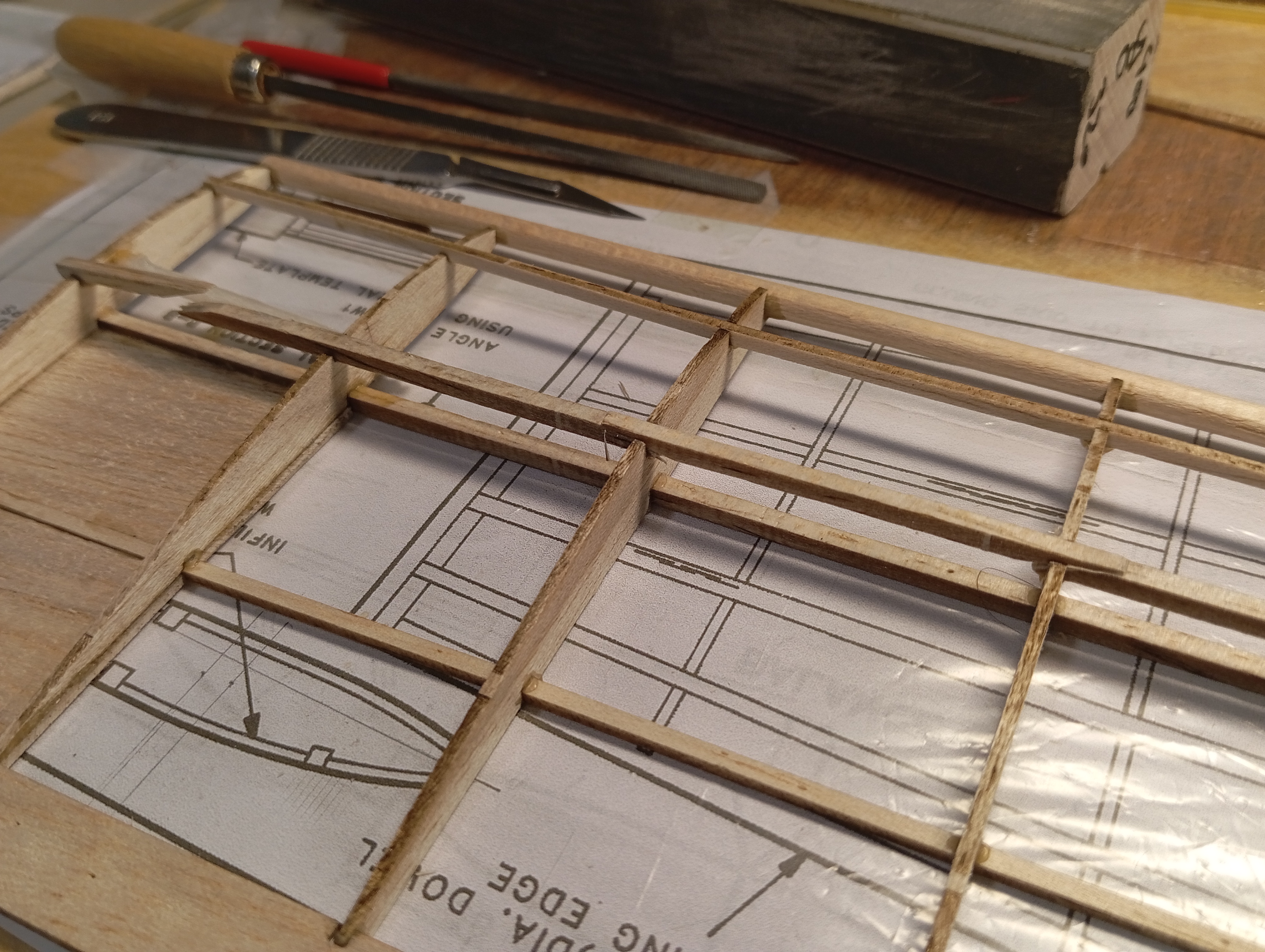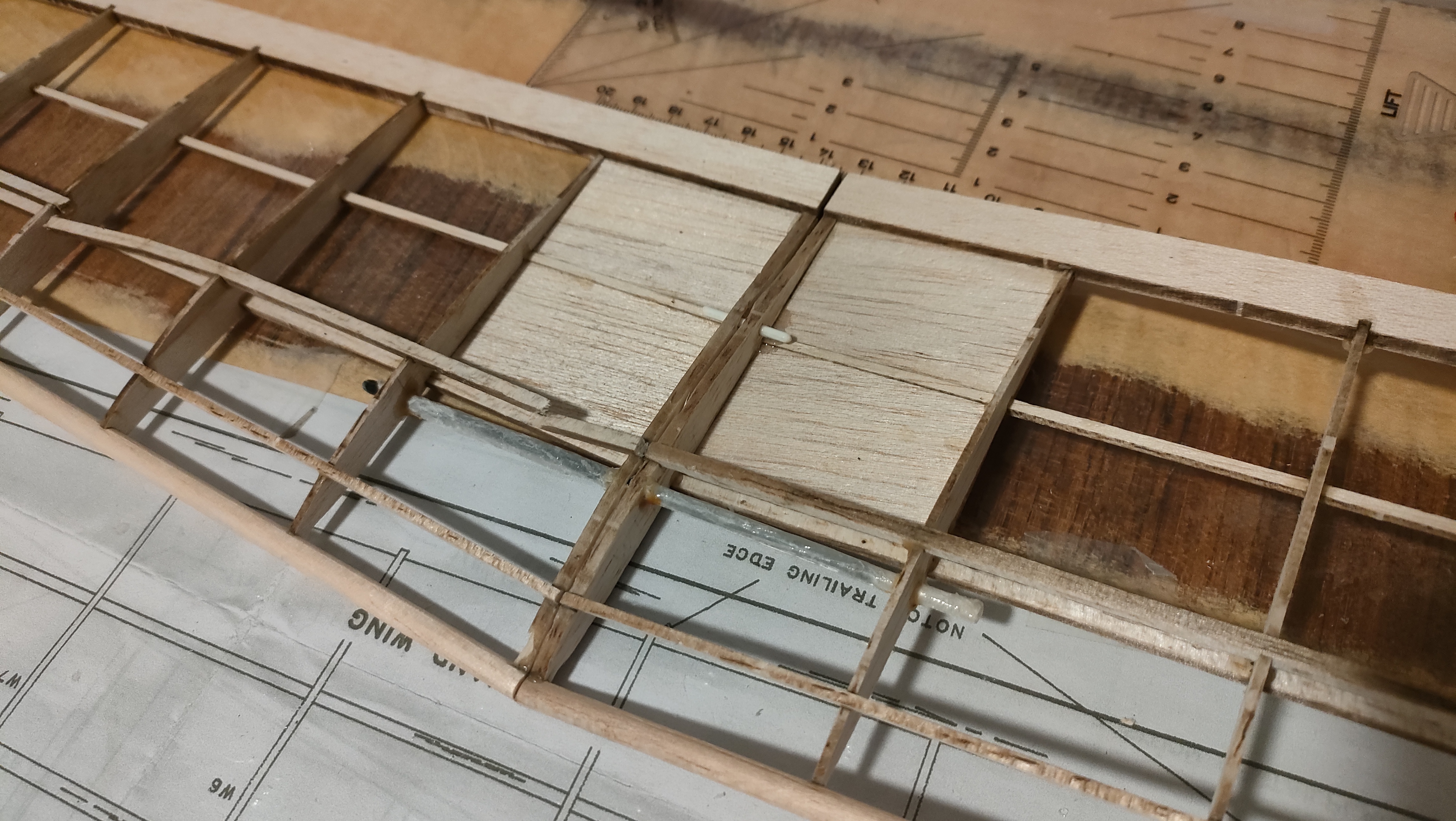 Y lo que es pegado puro y duro... Primero cortar los troqueles con bisturí 11 nuevecito, hacia el lado del "hueco" y pasarlo con cariño por el taco de lija para eliminar el exceso de madera. Comprobar que todas las costillas encajan en su sitio con un montaje seco, y muy bien, algo de cariño en un par de puntos para llevar los largueros a su sitio, pero cero lija. Y empezando desde la punta, gotas de pegamento en el hueco de los largueros y del borde de salida, escuadra para comprobar perpendicularidad al larguero, giro a la escuadra para comprobar verticalidad, y a la siguiente.