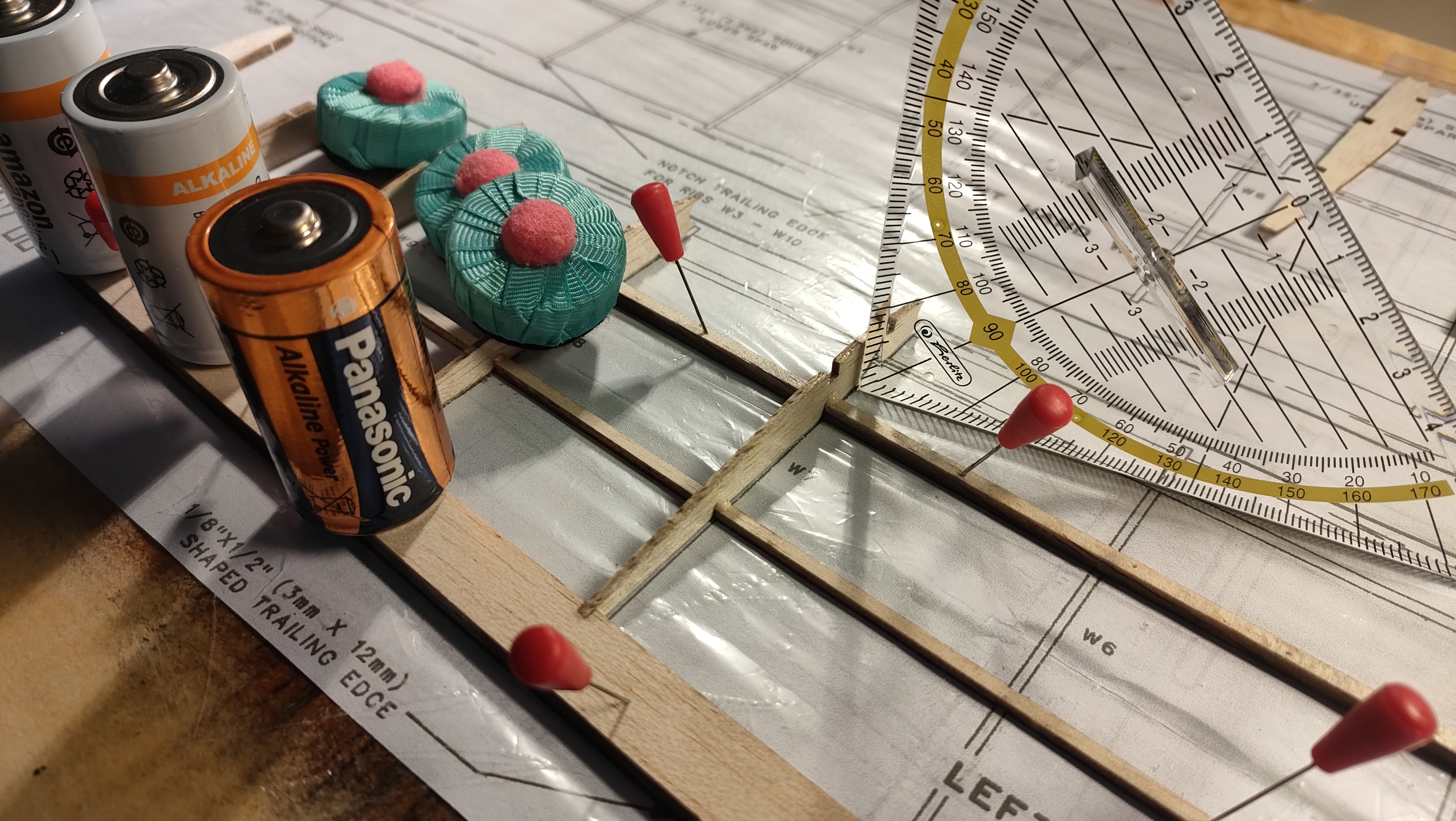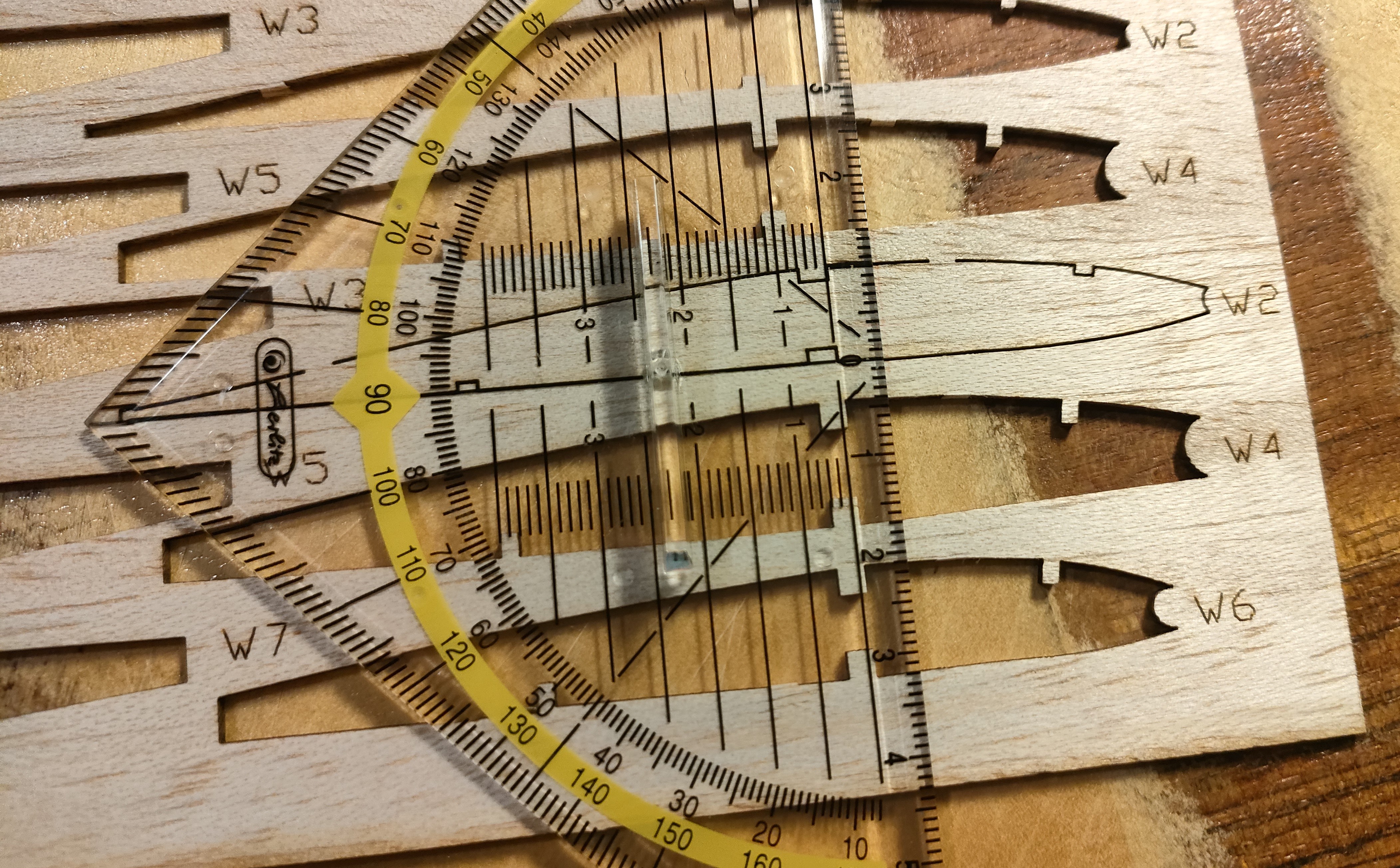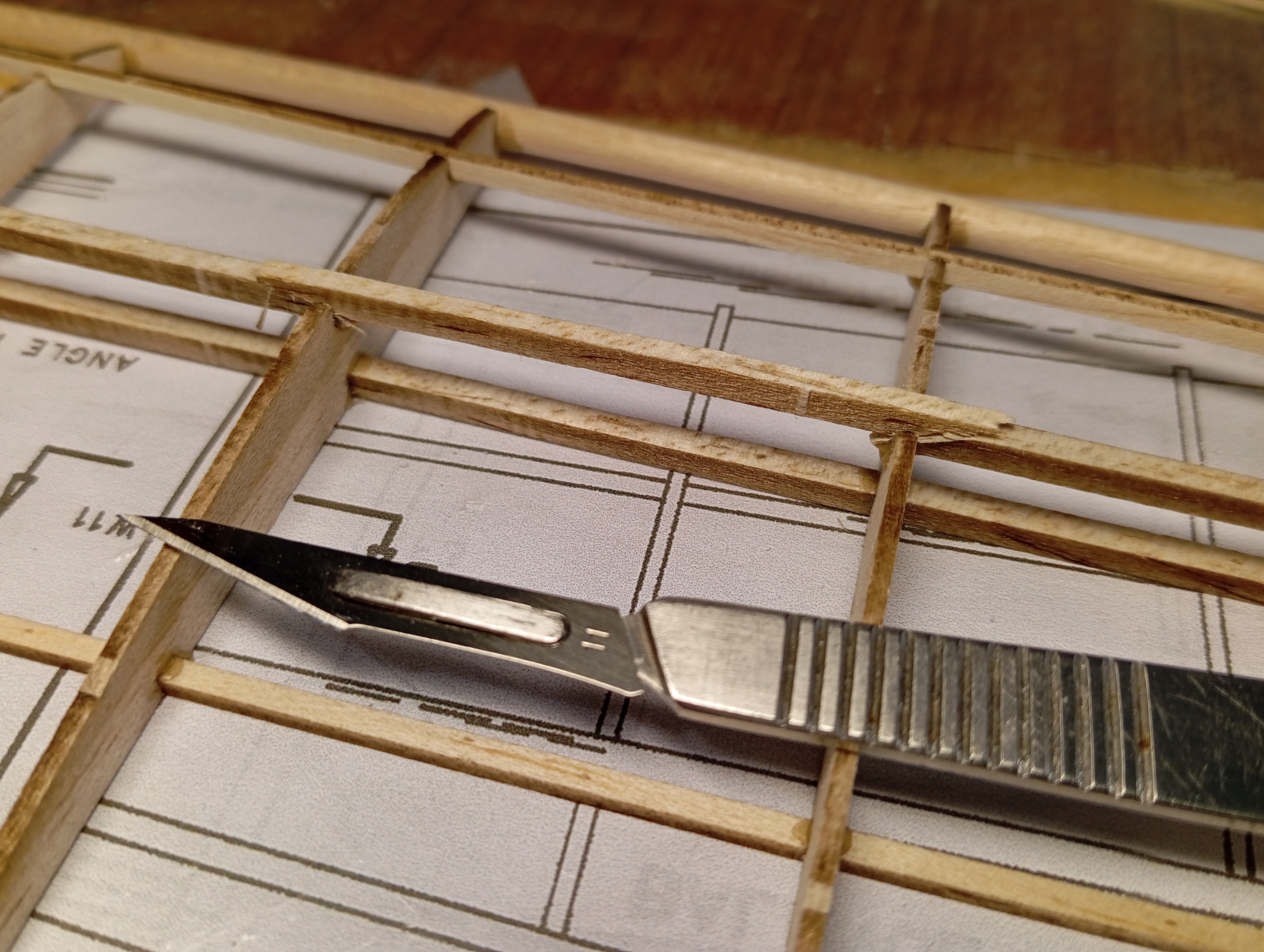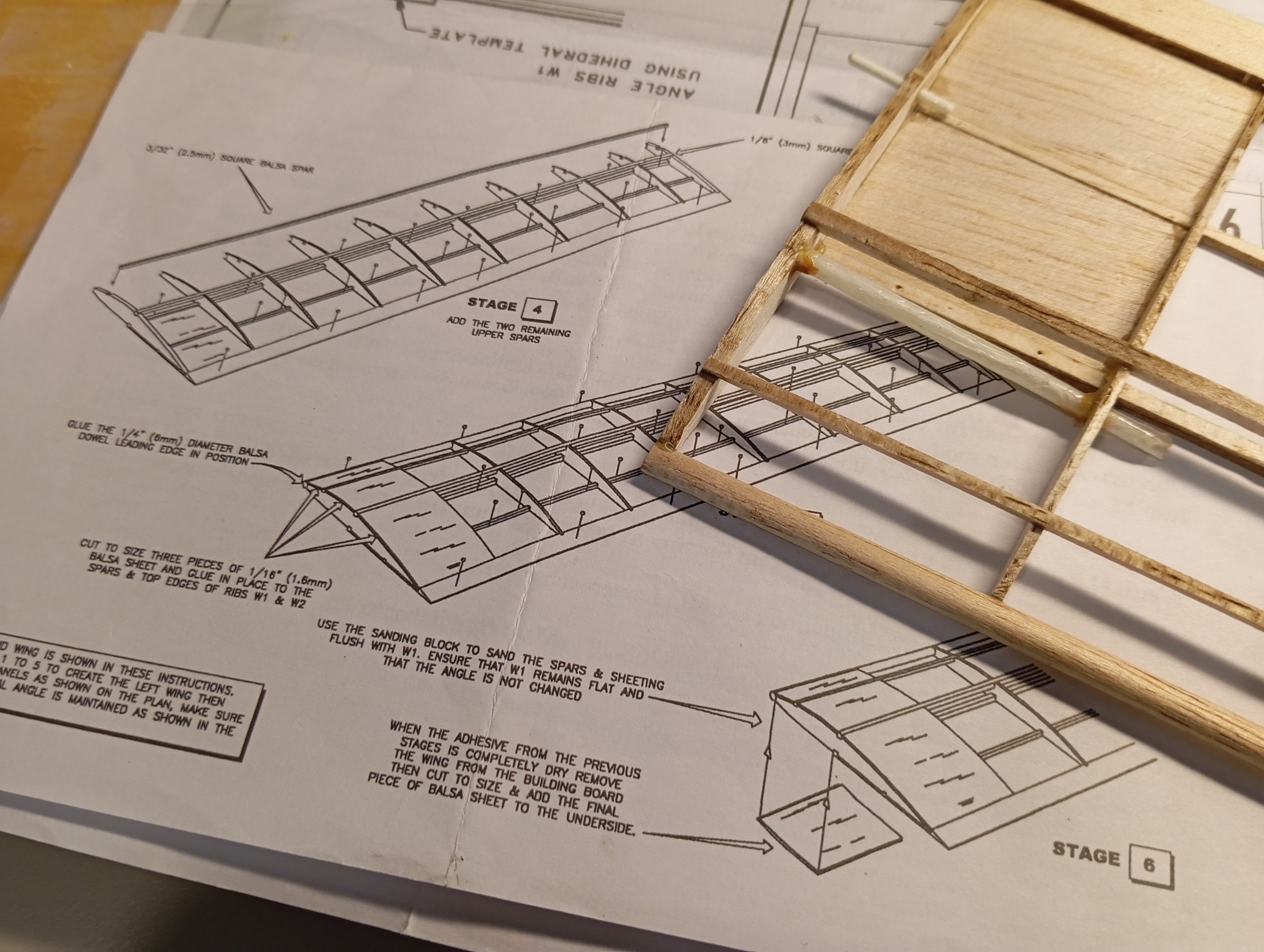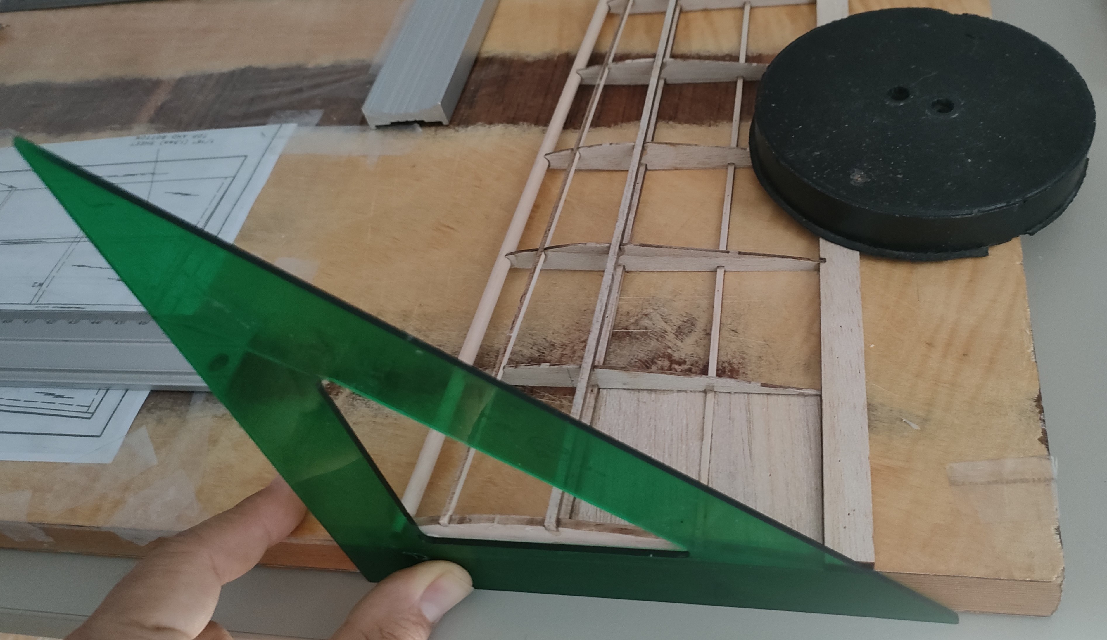 Y lo que es pegado puro y duro... Primero cortar los troqueles con bisturí 11 nuevecito, hacia el lado del "hueco" y pasarlo con cariño por el taco de lija para eliminar el exceso de madera. Comprobar que todas las costillas encajan en su sitio con un montaje seco, y muy bien, algo de cariño en un par de puntos para llevar los largueros a su sitio, pero cero lija. Y empezando desde la punta, gotas de pegamento en el hueco de los largueros y del borde de salida, escuadra para comprobar perpendicularidad al larguero, giro a la escuadra para comprobar verticalidad, y a la siguiente.