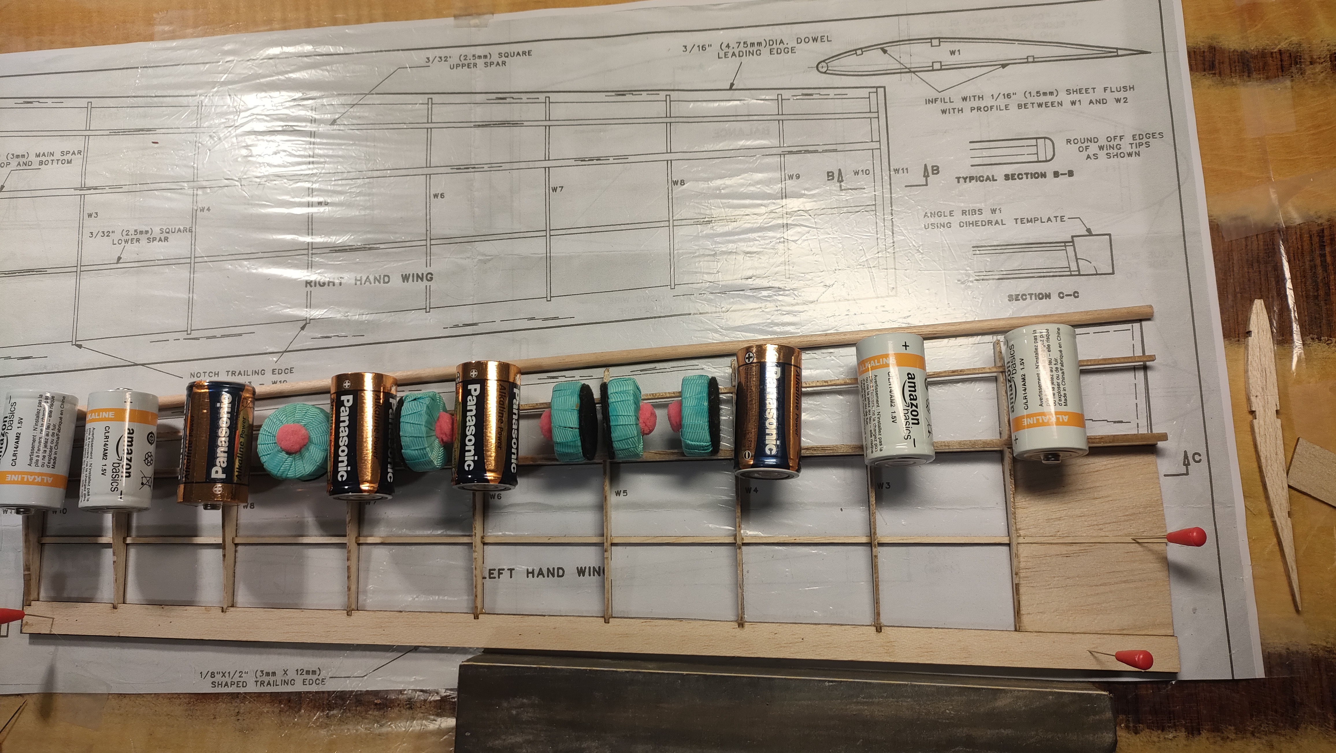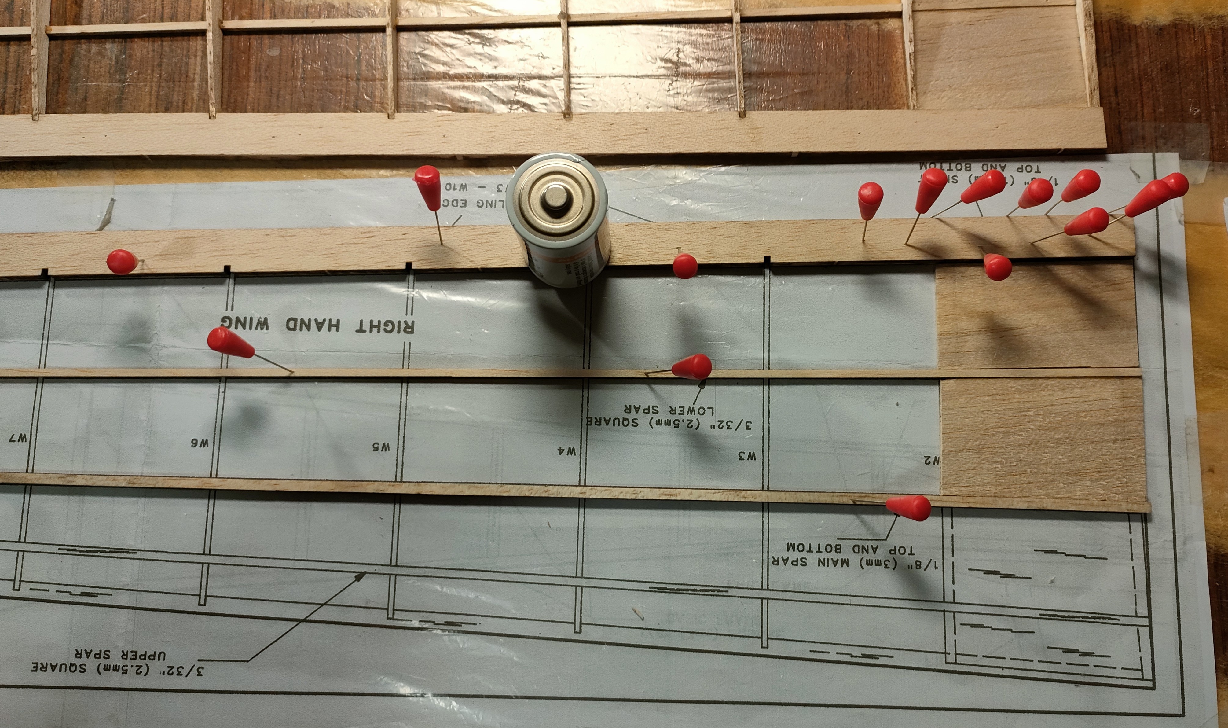 He ido cambiando un poco de idea conforme la construcción del ala izquierda avanzaba. Primero llevé a su sitio los largueros superiores, comprobé con el dedo que todos estaban metidos a tope, y puse pesos distribuidos.