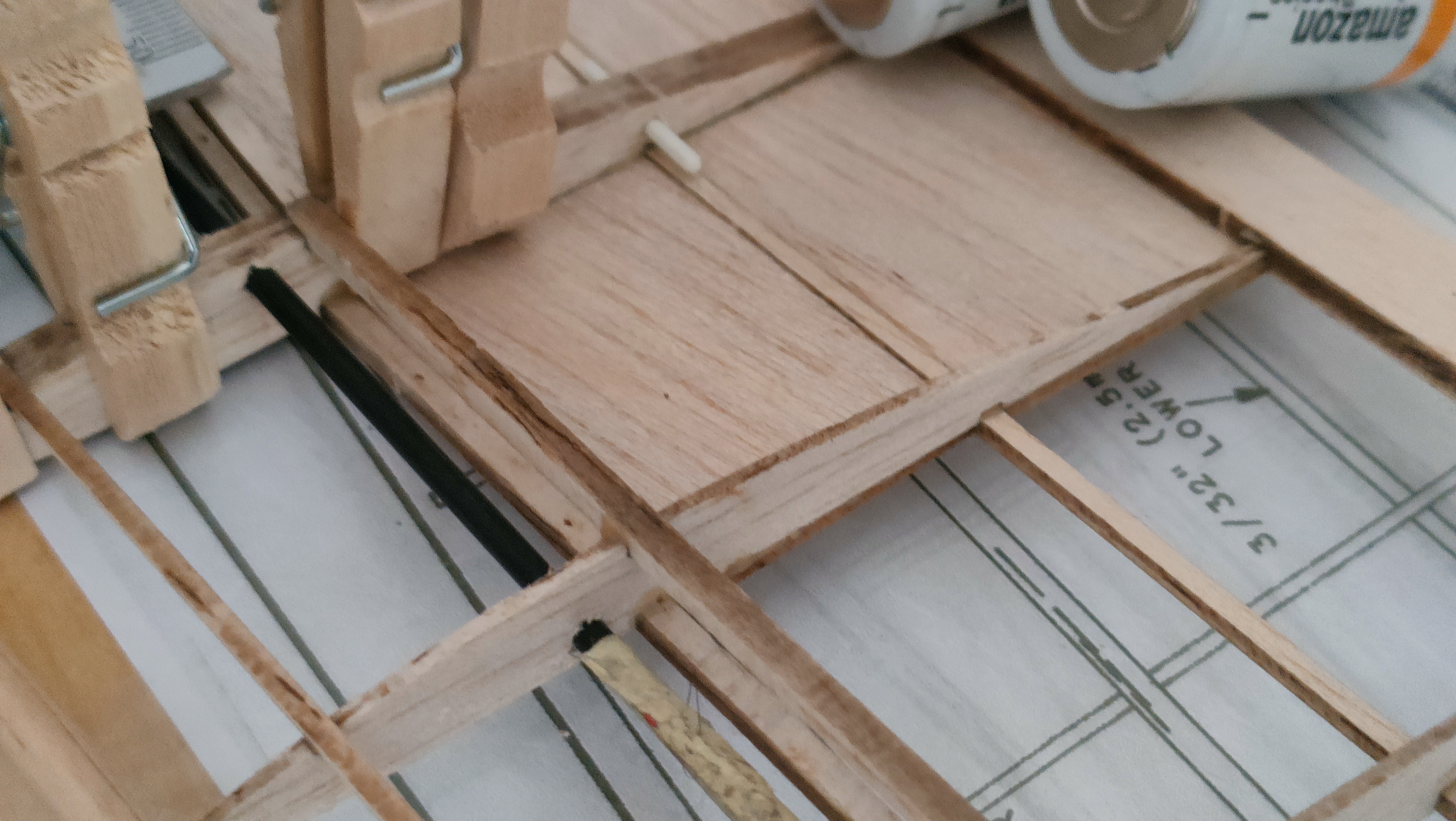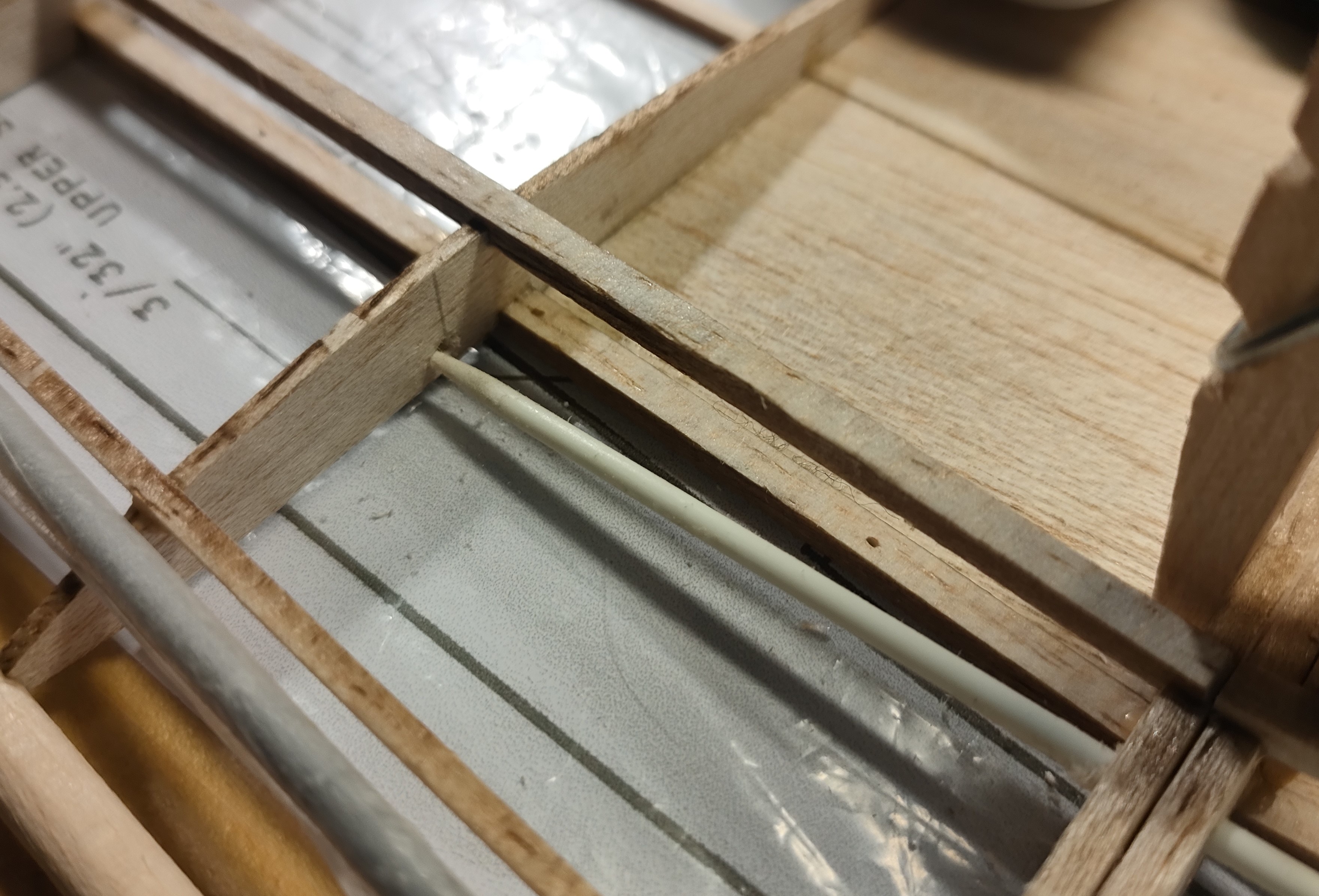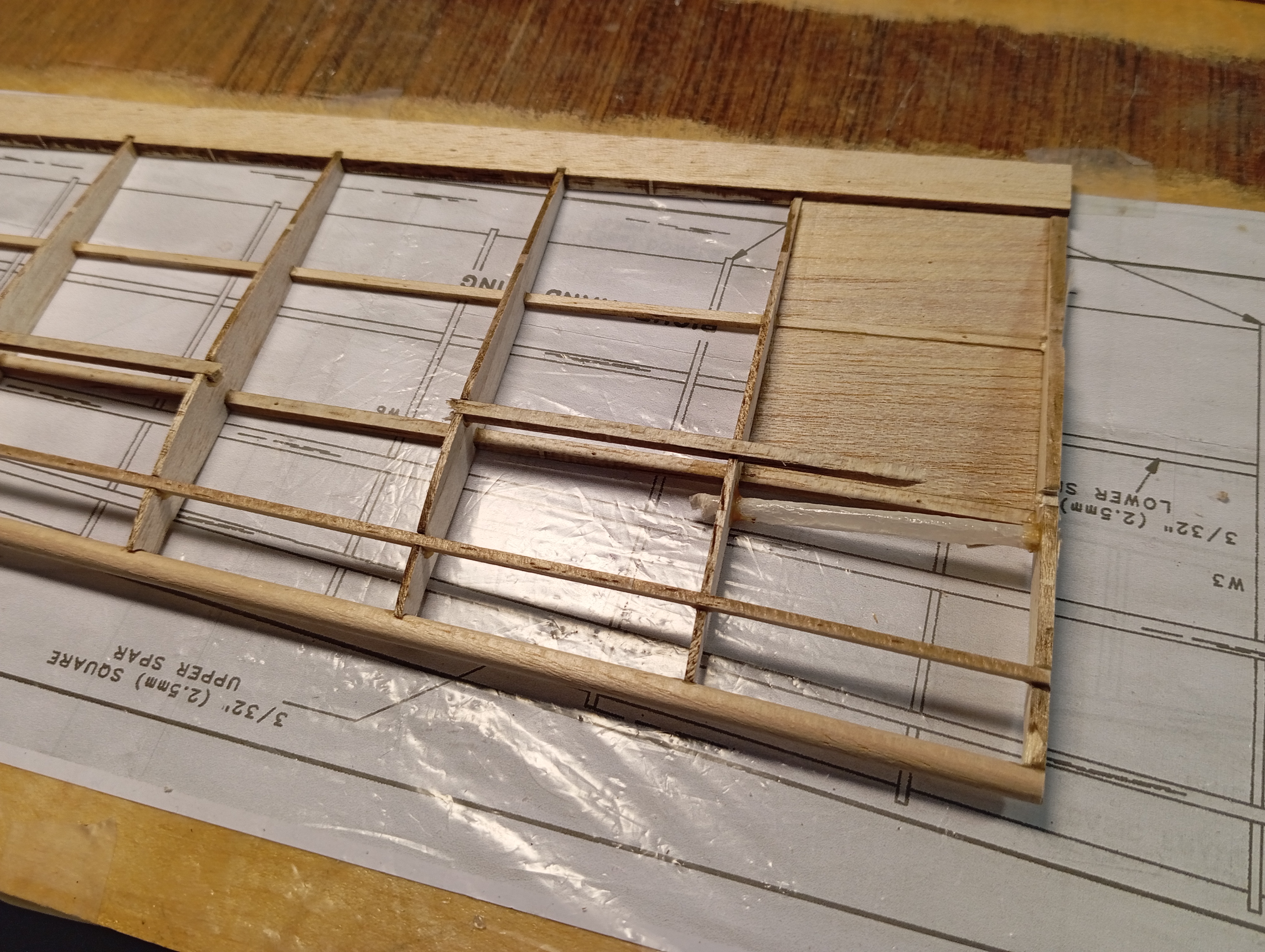 Y sí, hay una zona del panel superior del borde de ataque donde me falta medio milímetro de madera porque corté mal esos paneles. Eso pienso rellenarlo con alguna tirilla de madera, o directamente en masilla. He visto en otras construcciones, y en el propio plano , que la cabina queda más alta que las alas y hace feo, previsiblemente rellenaré el panel delantero hacia arriba para que quede la cabina a ras.