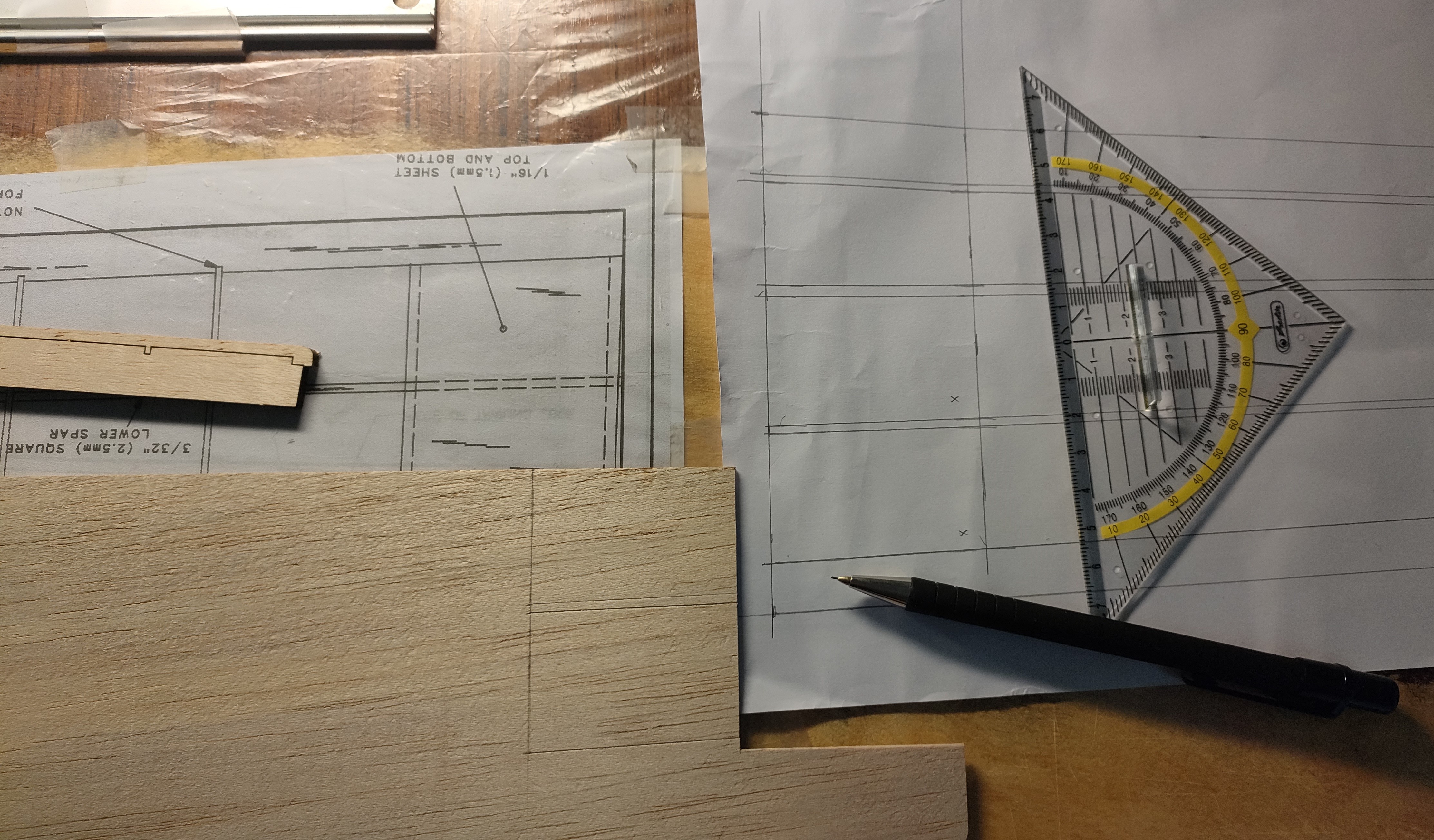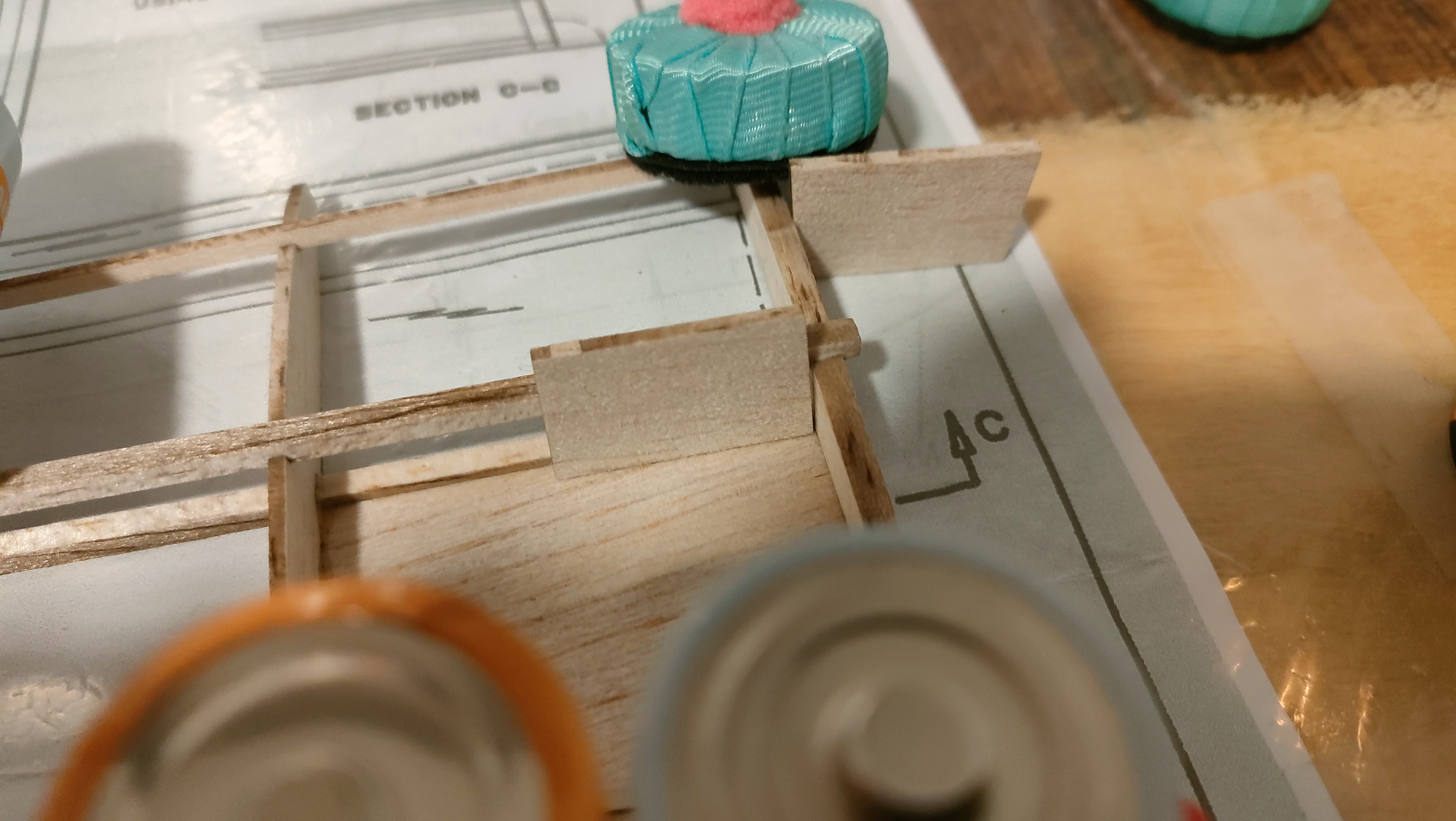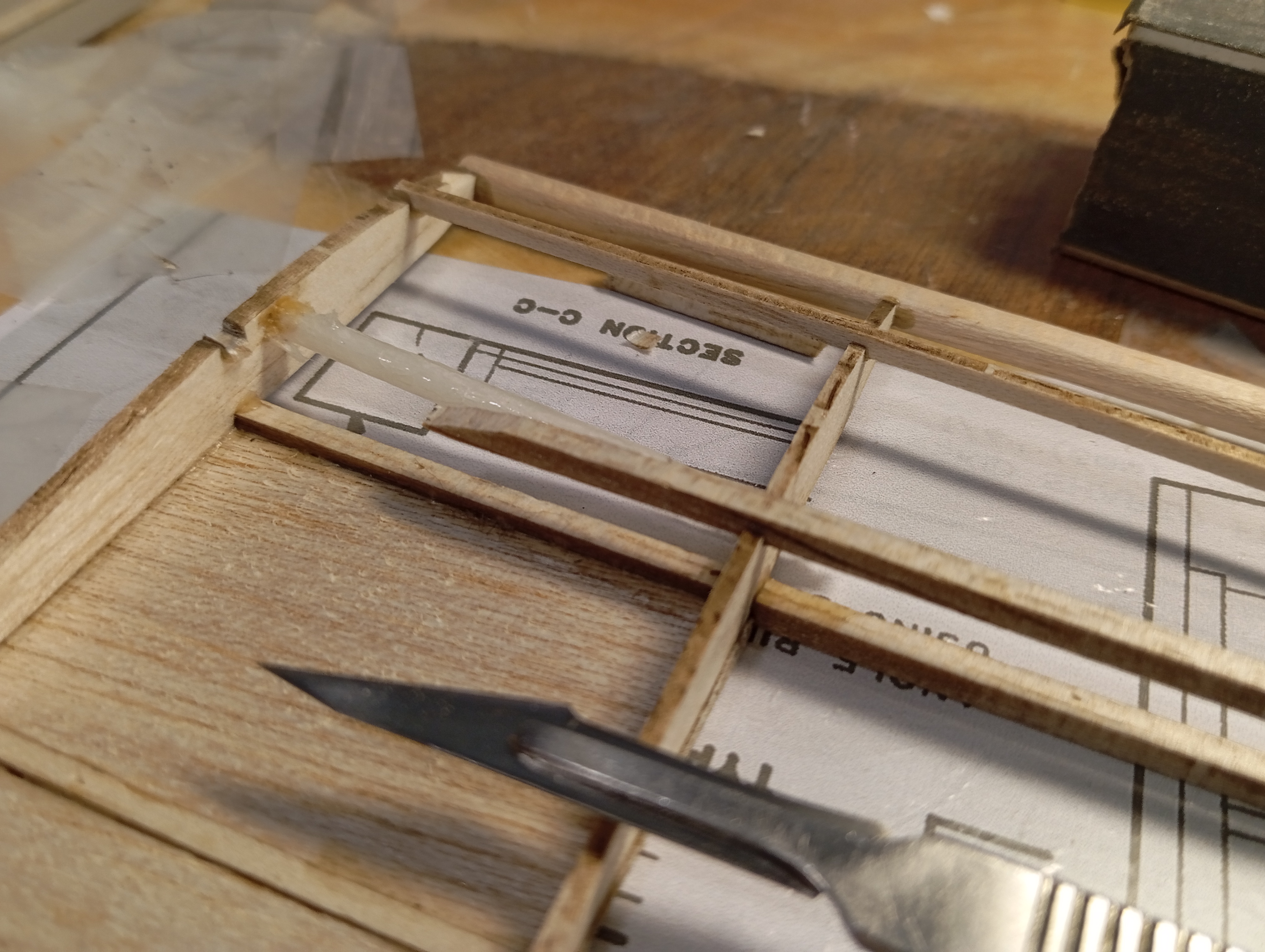 Y sí, hay una zona del panel superior del borde de ataque donde me falta medio milímetro de madera porque corté mal esos paneles. Eso pienso rellenarlo con alguna tirilla de madera, o directamente en masilla. He visto en otras construcciones, y en el propio plano , que la cabina queda más alta que las alas y hace feo, previsiblemente rellenaré el panel delantero hacia arriba para que quede la cabina a ras.