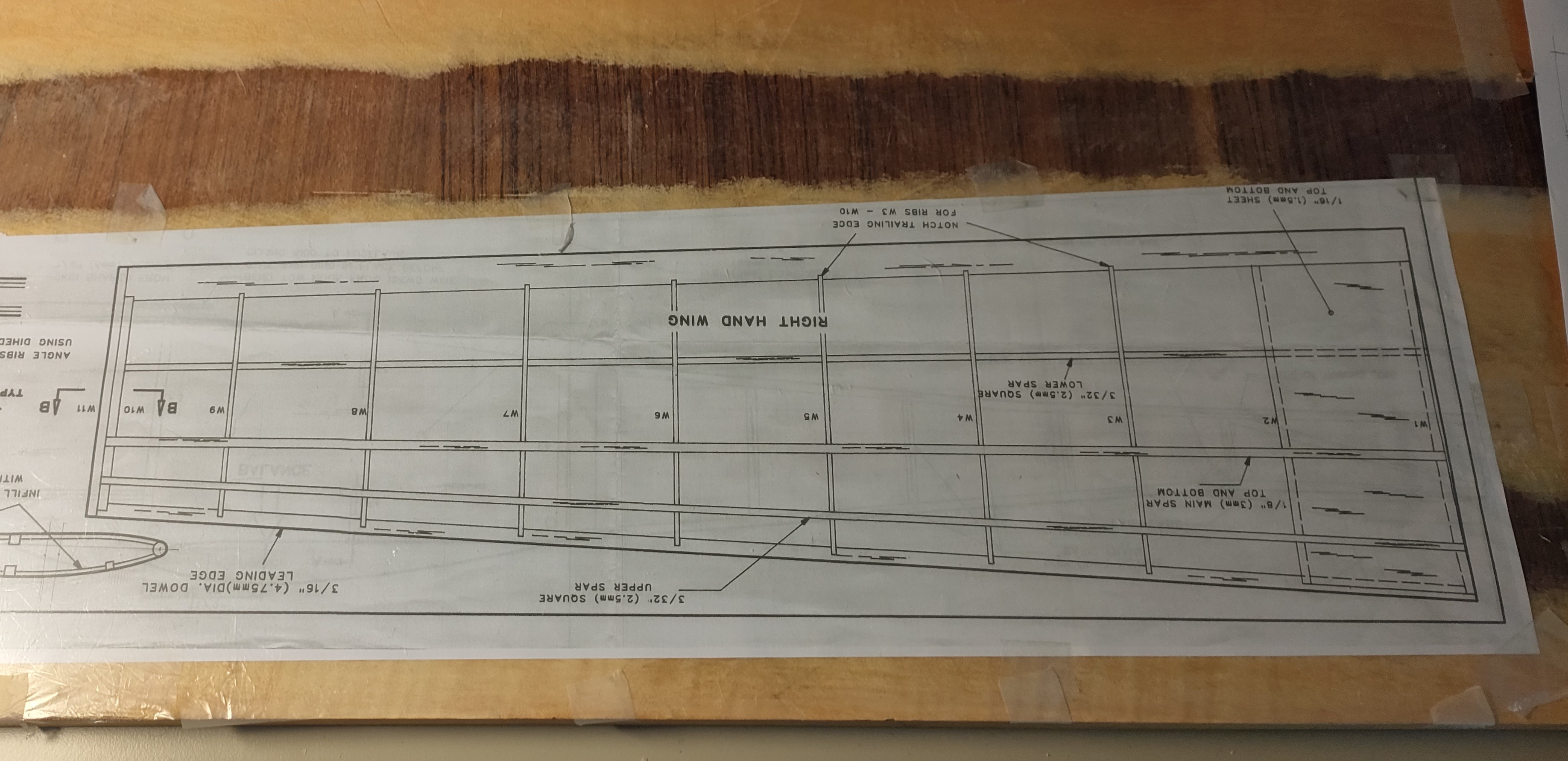 Ahora, a ver el orden de enchapado... pimero el extradós, empezando por el borde de ataque y luego el borde de salida, pasando luego al intradós, por el borde de ataque, manos a la obra. Me había dejado unos trozos un poco estrechos, pero los he aprovechado igual.