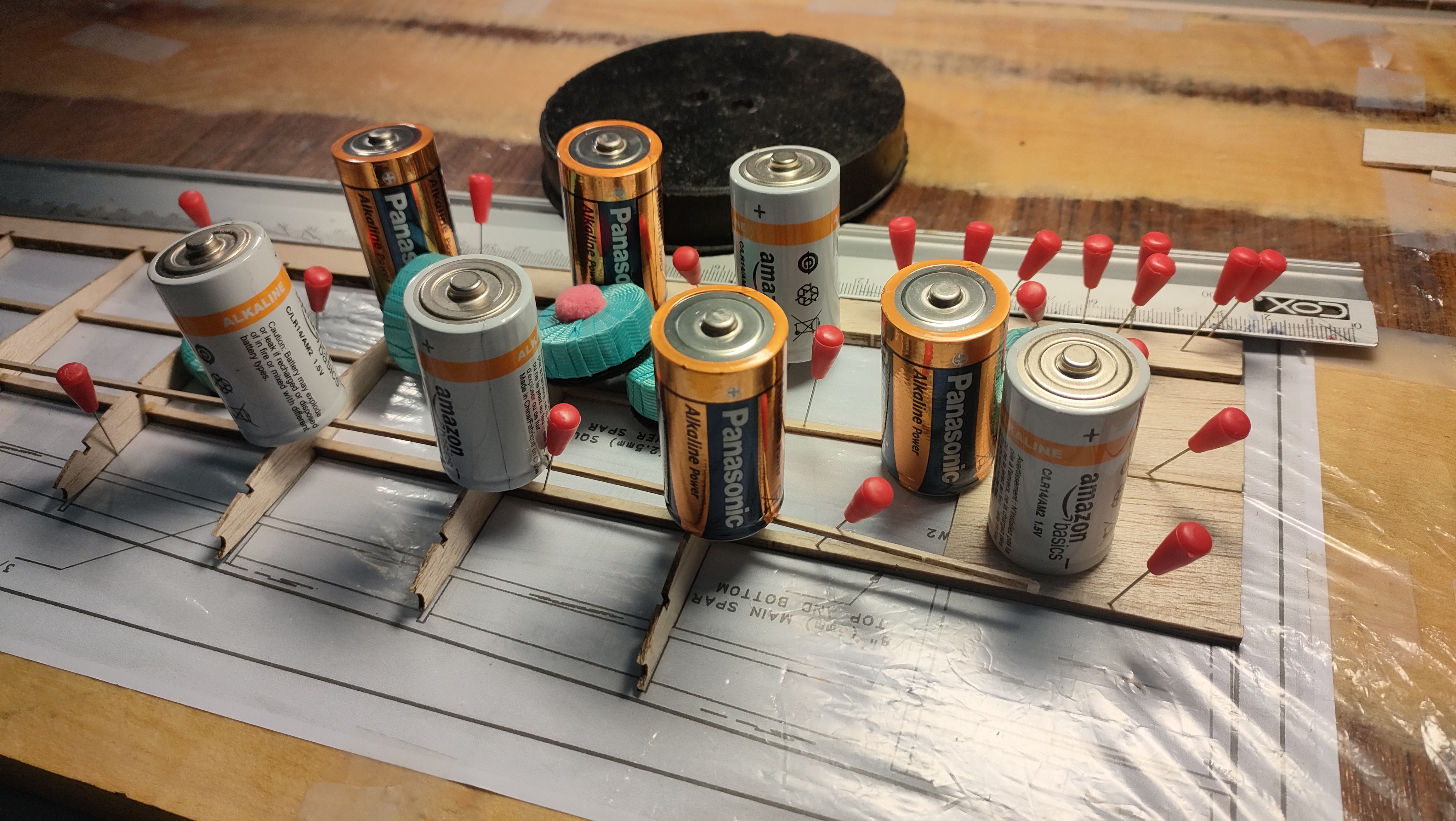 Como la de punta es de 3mm de espesor, la pincho con alfiler al borde de salida. Los alfileres y el tablero empiezan a llevarse regular, se sueltan, no pinchan bien... total, que dejo los que están bien clavados, y para los demás sitios, voy poniendo pesos de costura (gracias Rosa) y pilas en las uniones para que todo se pegue pegando al plano.