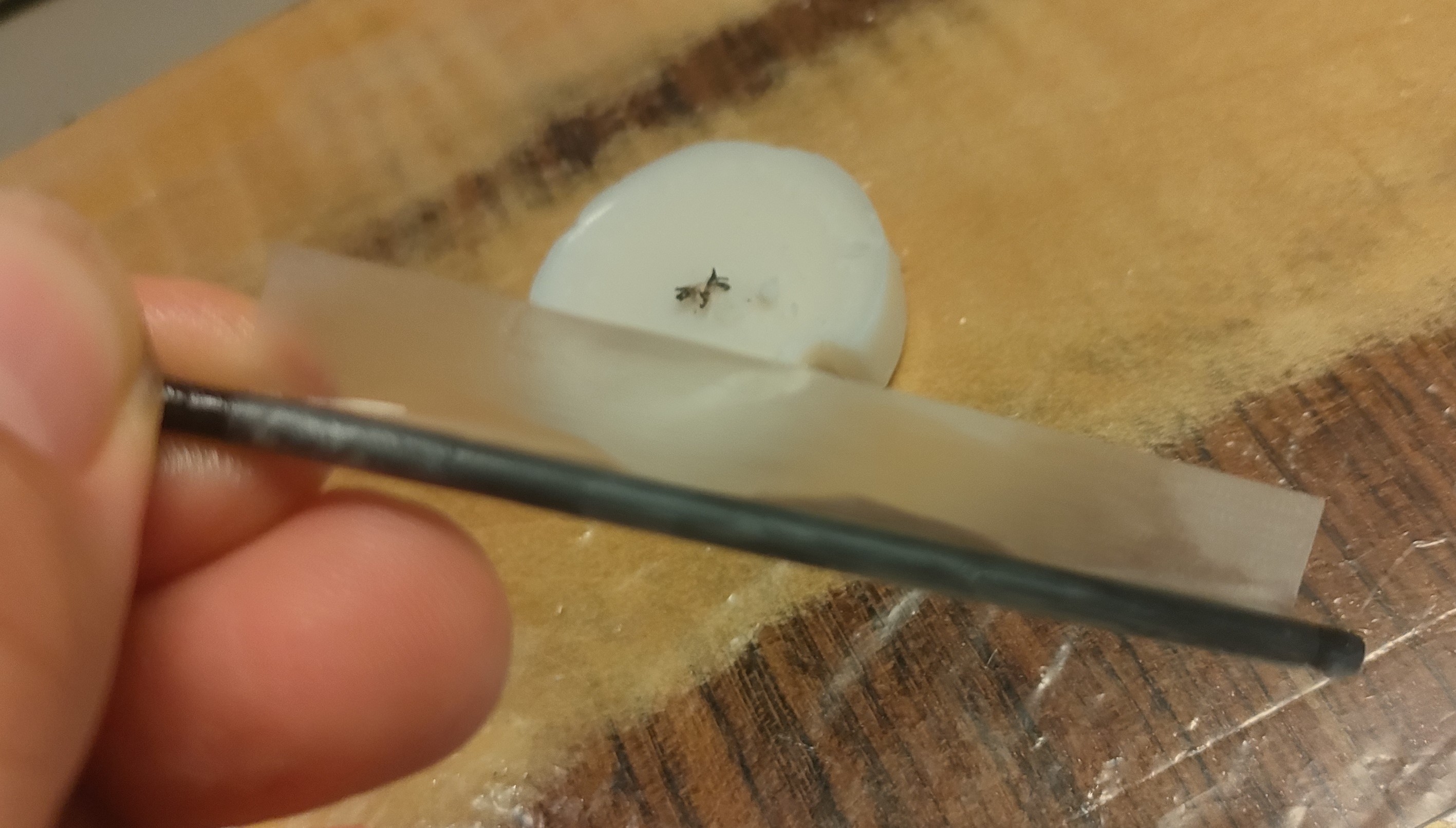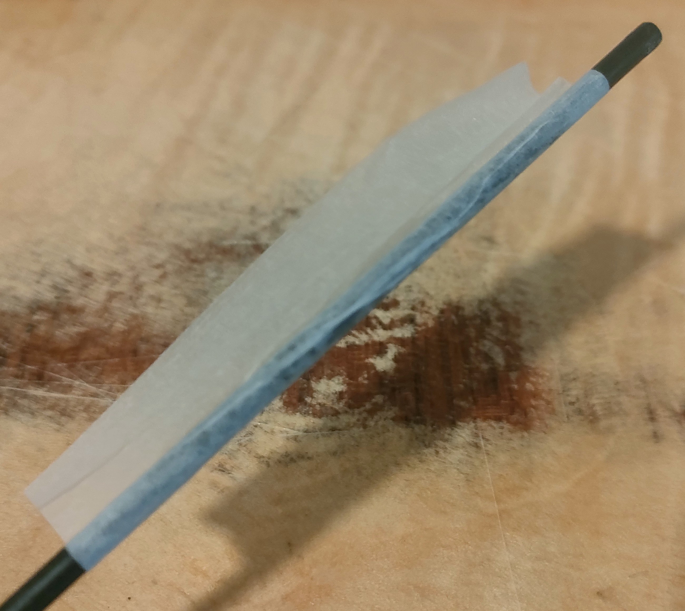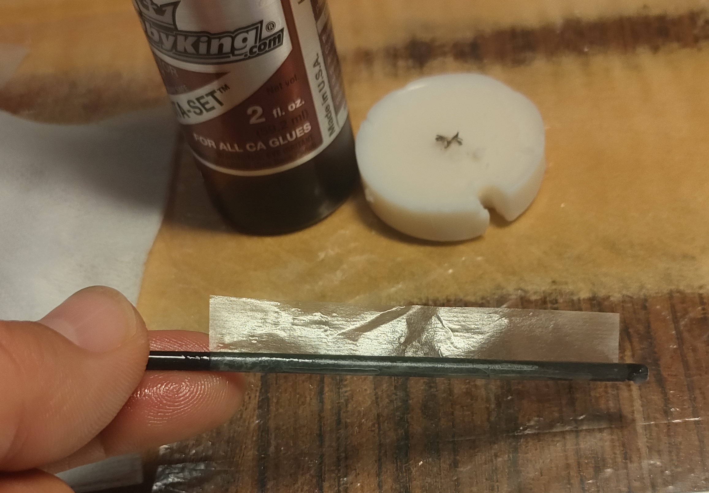 Son traslúcidas y diría que efectivamente de nylon; he heredado varios aviones con bisagras blancas y todas se han partido, un rollo. ¿Debería usar epoxy para pegarlas? Un toquecito de vaselina en el eje para evitar que se peguen nunca viene mal. No sé si acortarlas al ancho de la madera o si da igual enrasarlas, ni si para este tamaño conviene o no atraverar con un palillo, ¿qué opináis?