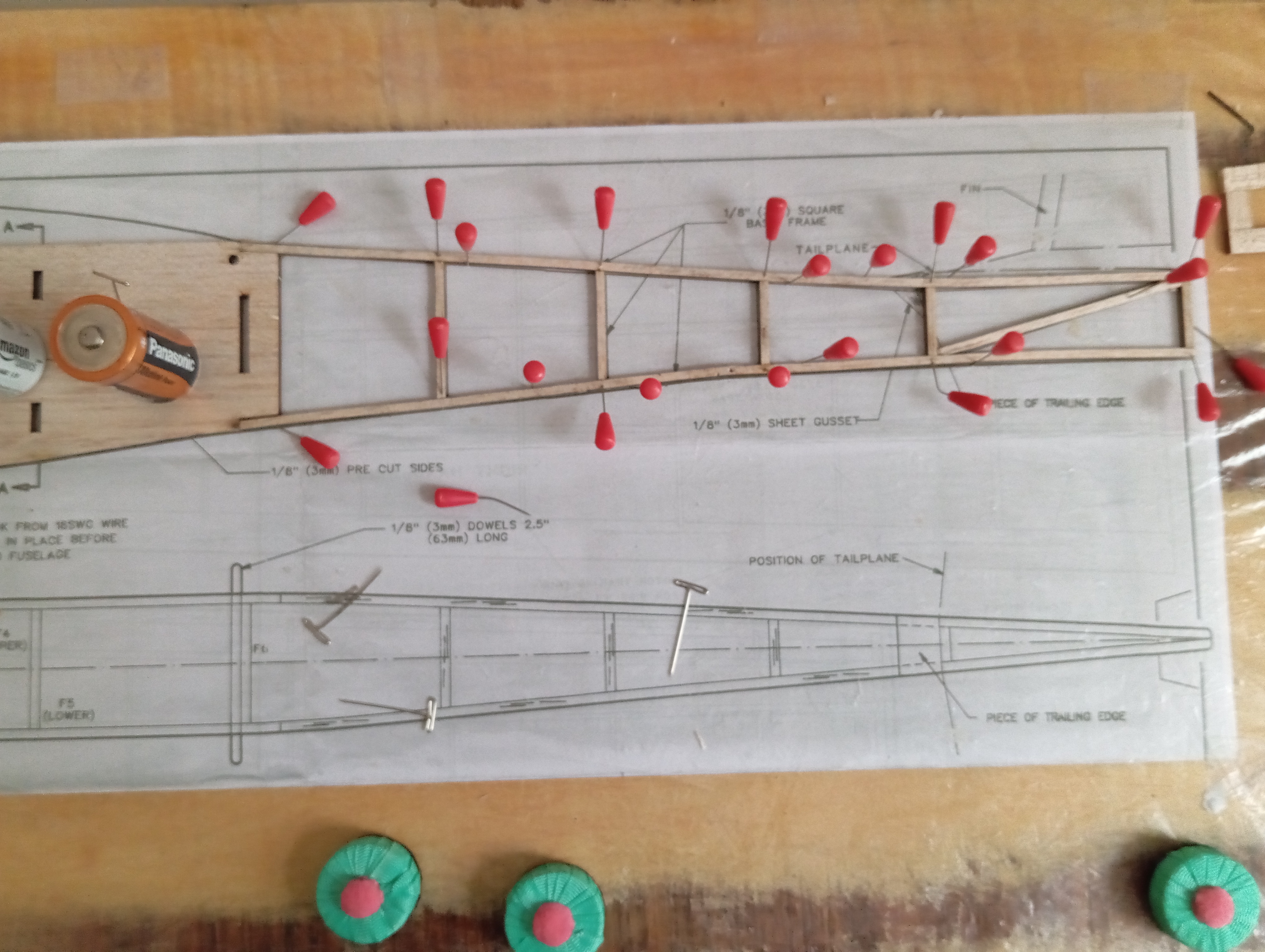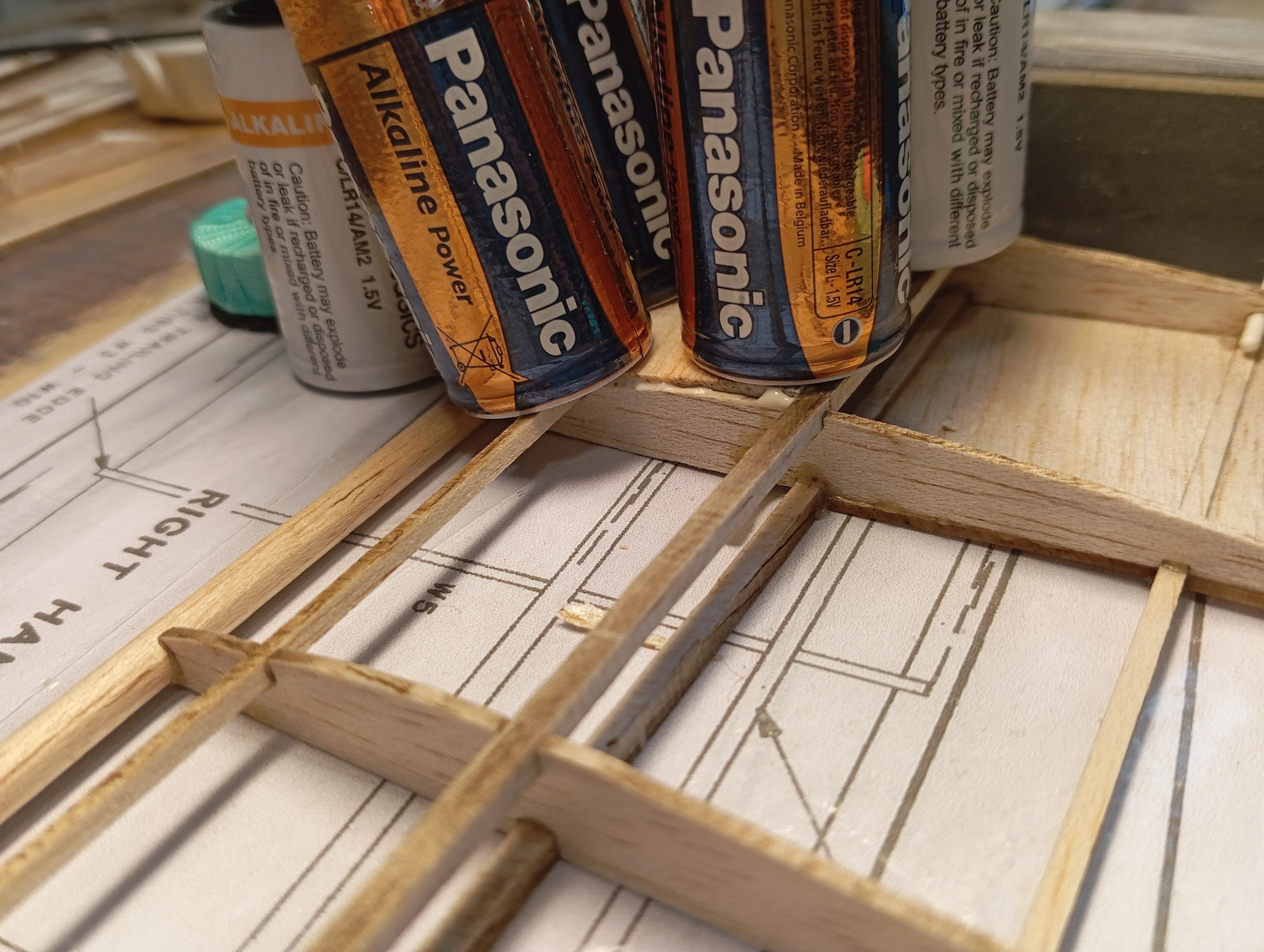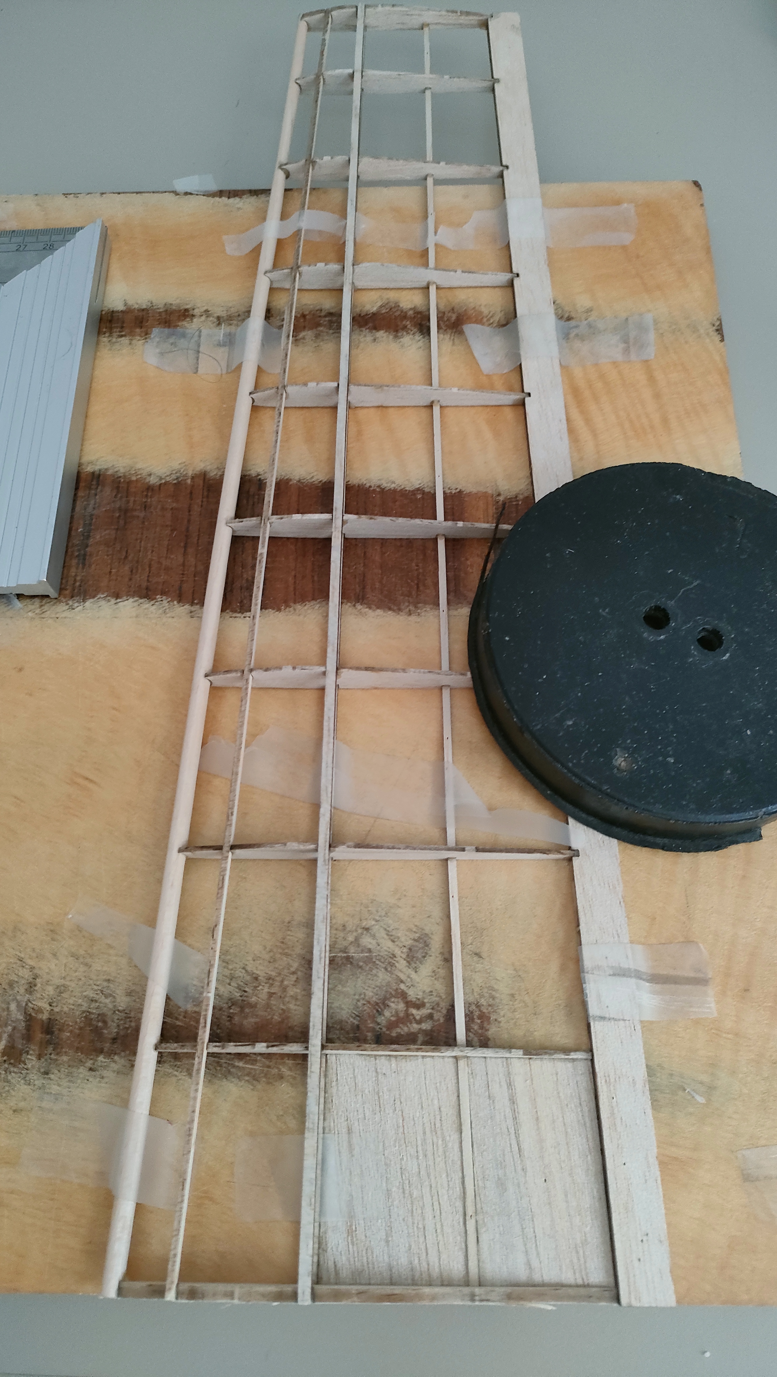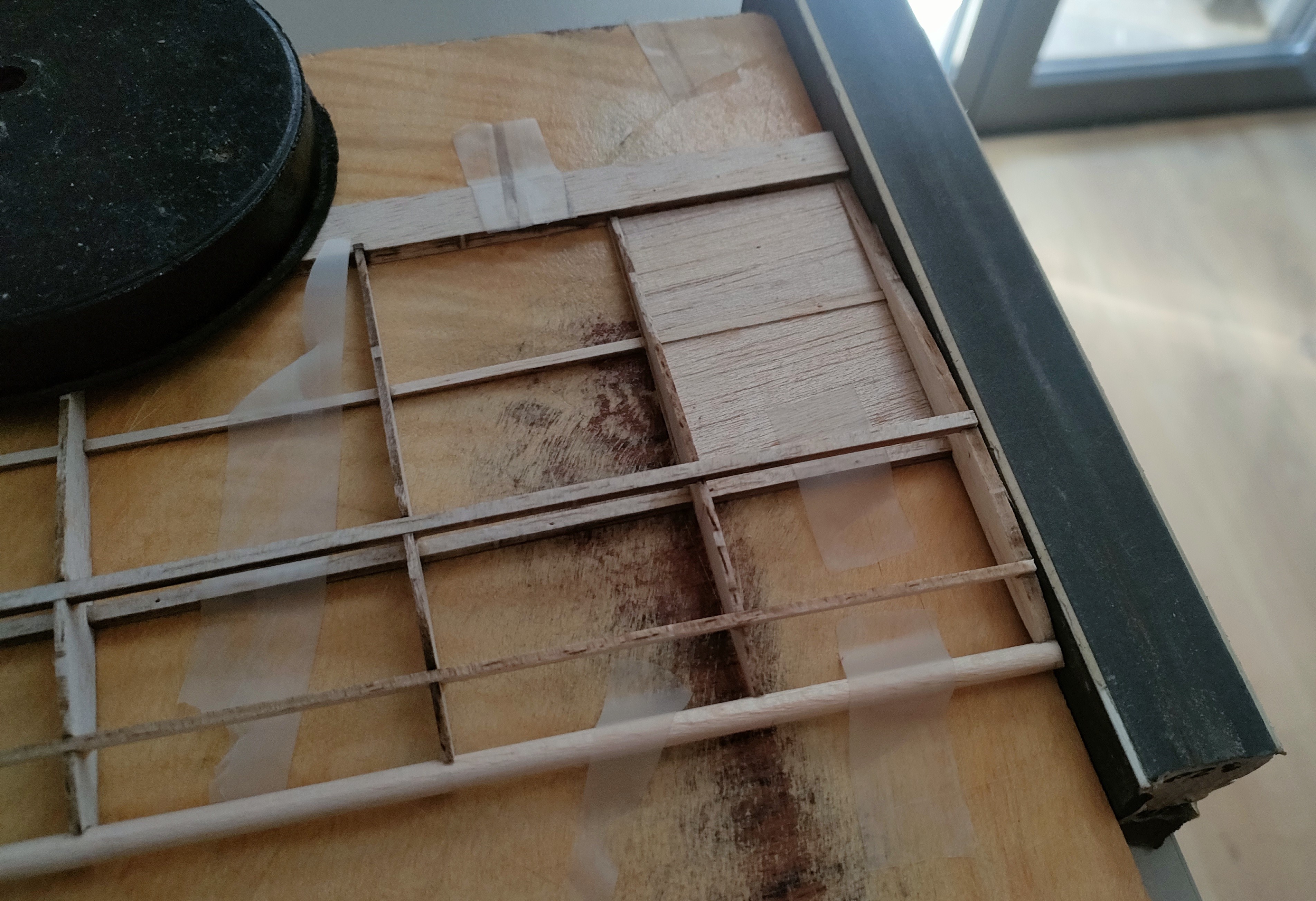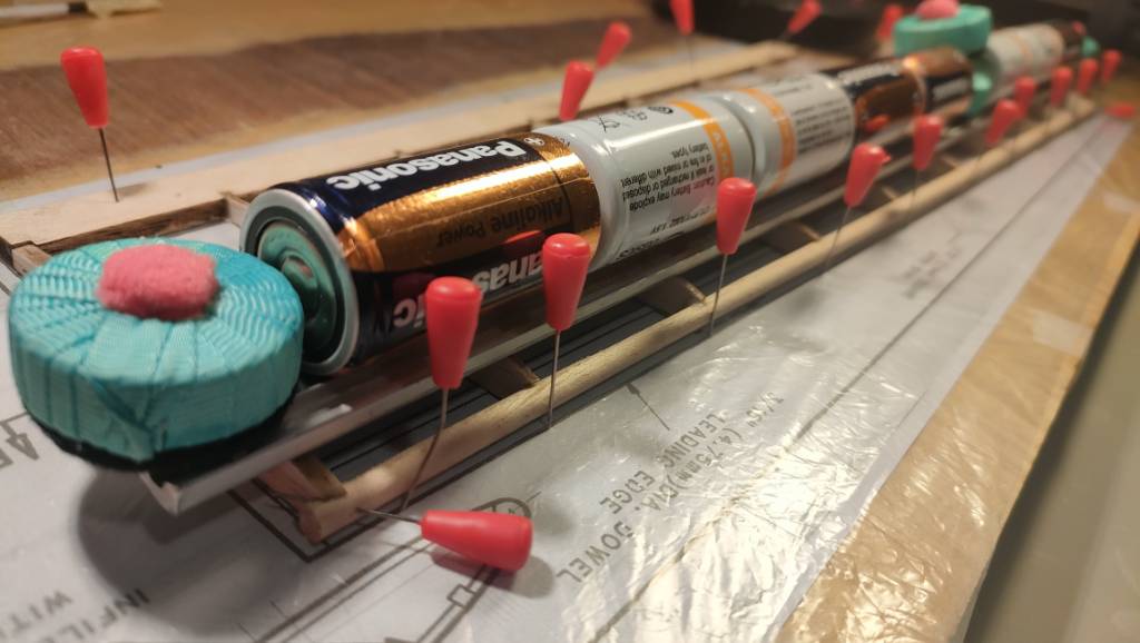 Empiezo fijando los paneles frontales con alfileres, y baterías que no falten como dice el manual. Corto los largueros superior e inferior a su longitud, y biselo un poco los extremos para que queden mejor alineados. Los pego y en el inferior dejo un poco la forma hecha sin forzar mucho, mojando un poco el lado de arriba para que hinche y coja mejor la curvatura. Un par de horas de secado.