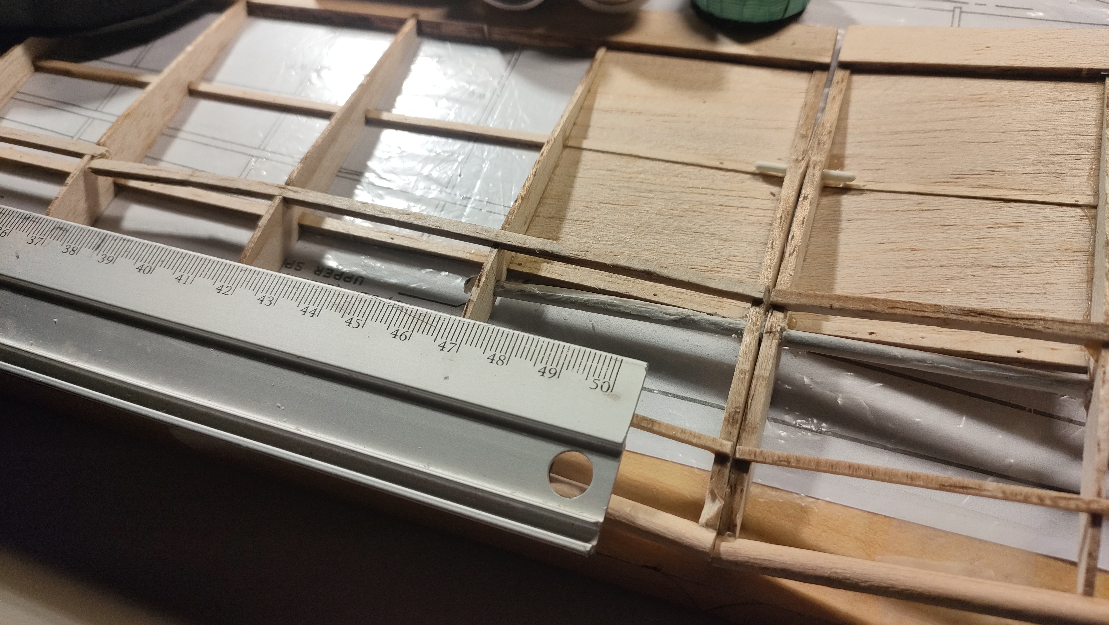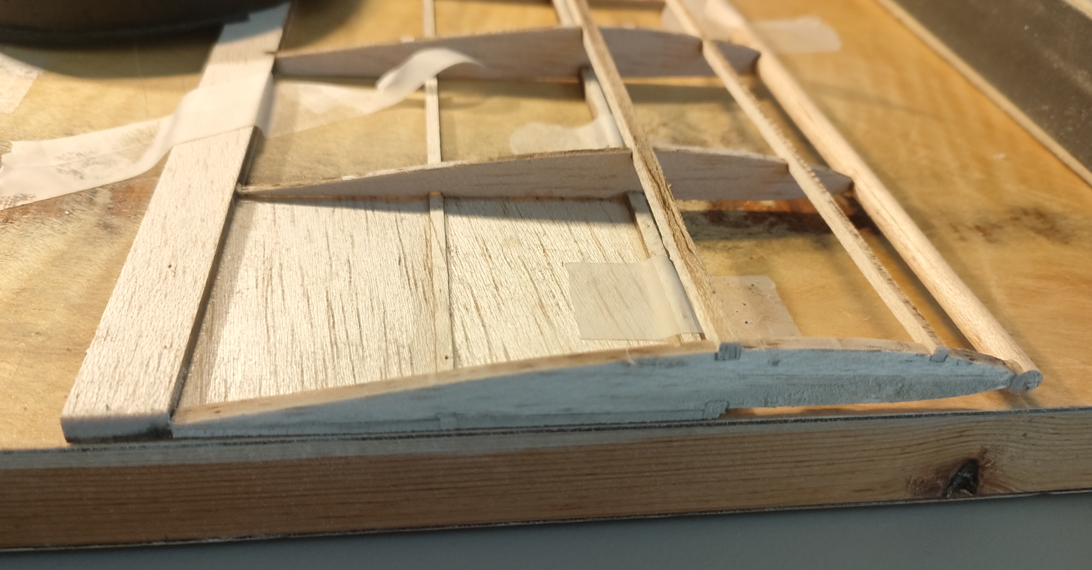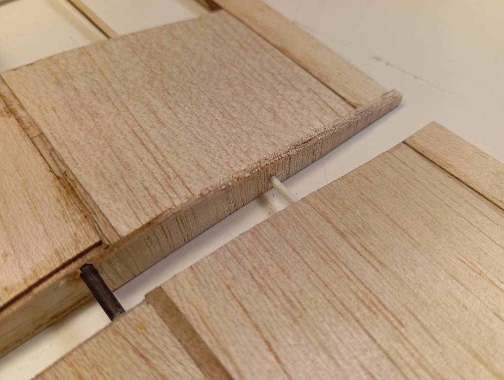 La unión de las alas la pensaba ajustar lijando, pero ahora creo que voy a aprovechar restos del enchapado para rellenar y lijar el relleno. Es por el borde de salida y creo que va a quedar más limpio comerse material de relleno, que se puede volver a apañar, que hacerlo sobre la costilla central.