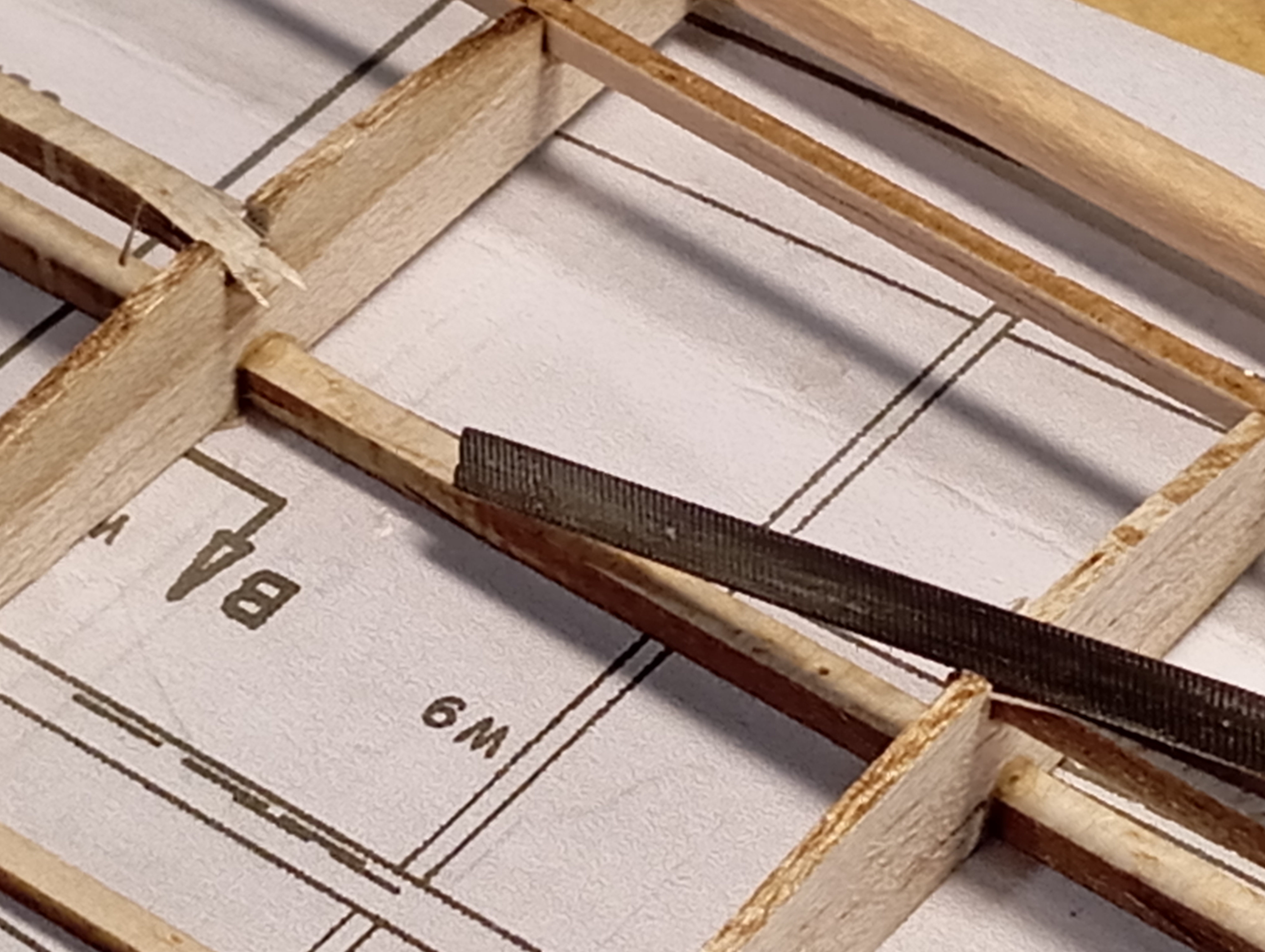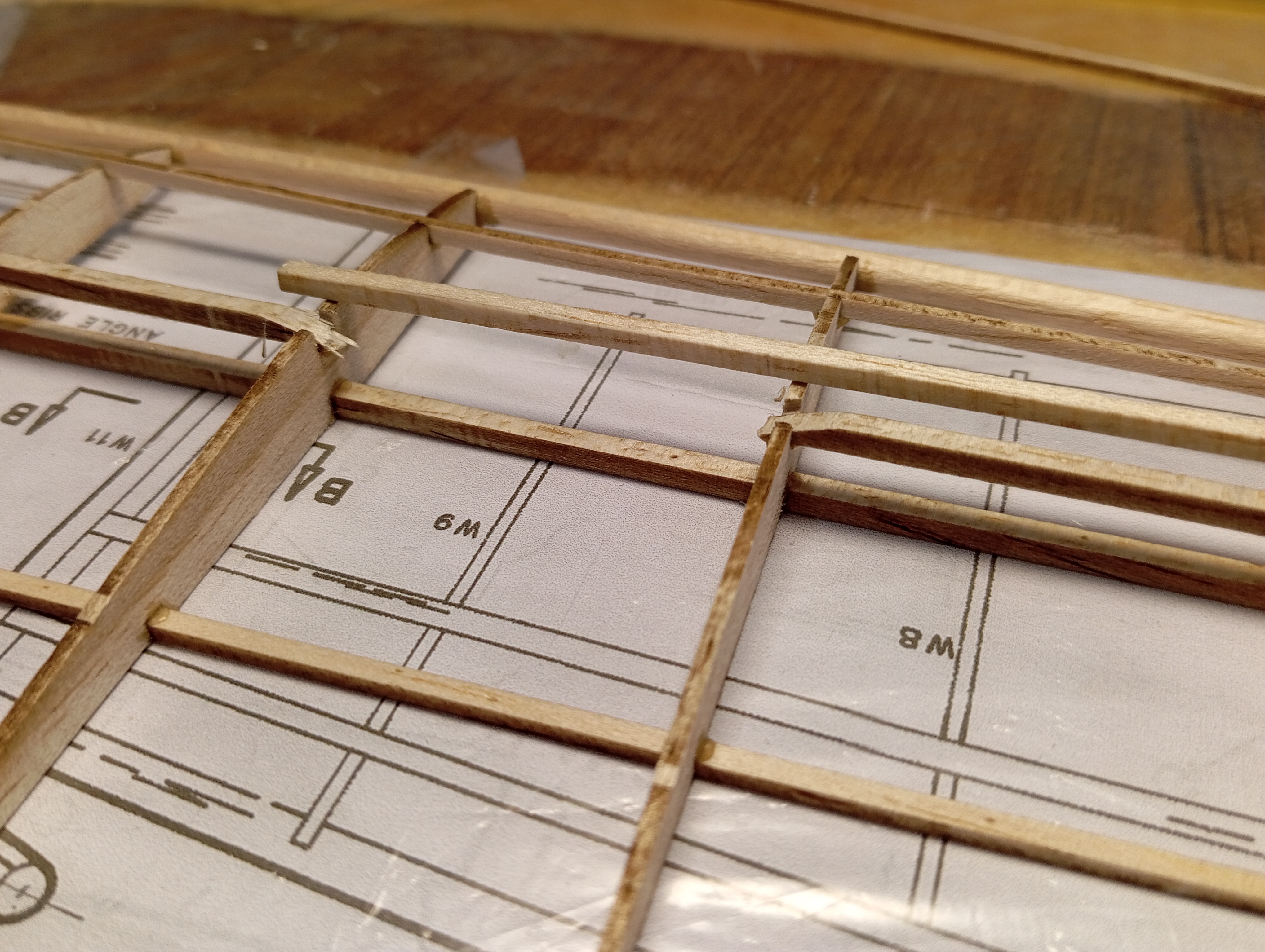 Buen curro Capi, es lo que tienen las estructuras pequeñas, la fragilidad. Muchas veces he tenido los mismos problemas y los he solucionado con "shearwebs" de 1mm, es un poco más de trabajo pero vale la pena sobre todo en las costillas centrales y la "caja" de laminado, también se evitan problemas de torsión en traslado y el aumento de peso no es significativo.