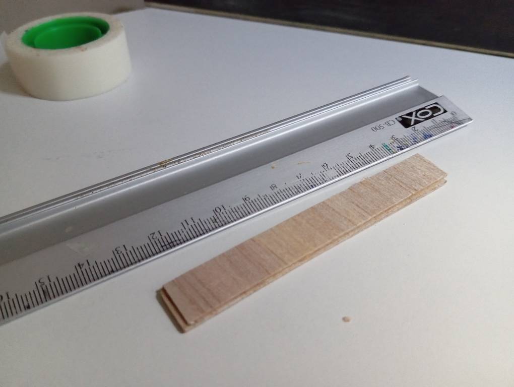 Cuando tengo ya todo en su sitio, meto una tirilla de balsa de 1.5mm que hay por ahí en el hueco del larguerillo superior delantero para hacer base, y voy poniendo pesos por ahí.