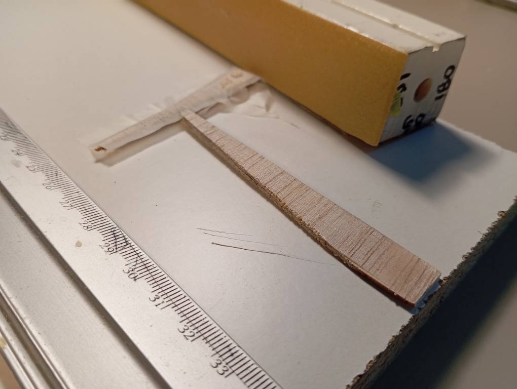 Los 2 mm que me quedan los rellenaré con un triángulo de balsa de 2mm pegado a la costilla, que biselaré para que quede una cuña a ras en la bayoneta y con 2mm en el borde de salida. Cuando esté pegado, otra pasadita de taco de lija para dejar todo ya centrado y ajustado, y listo.