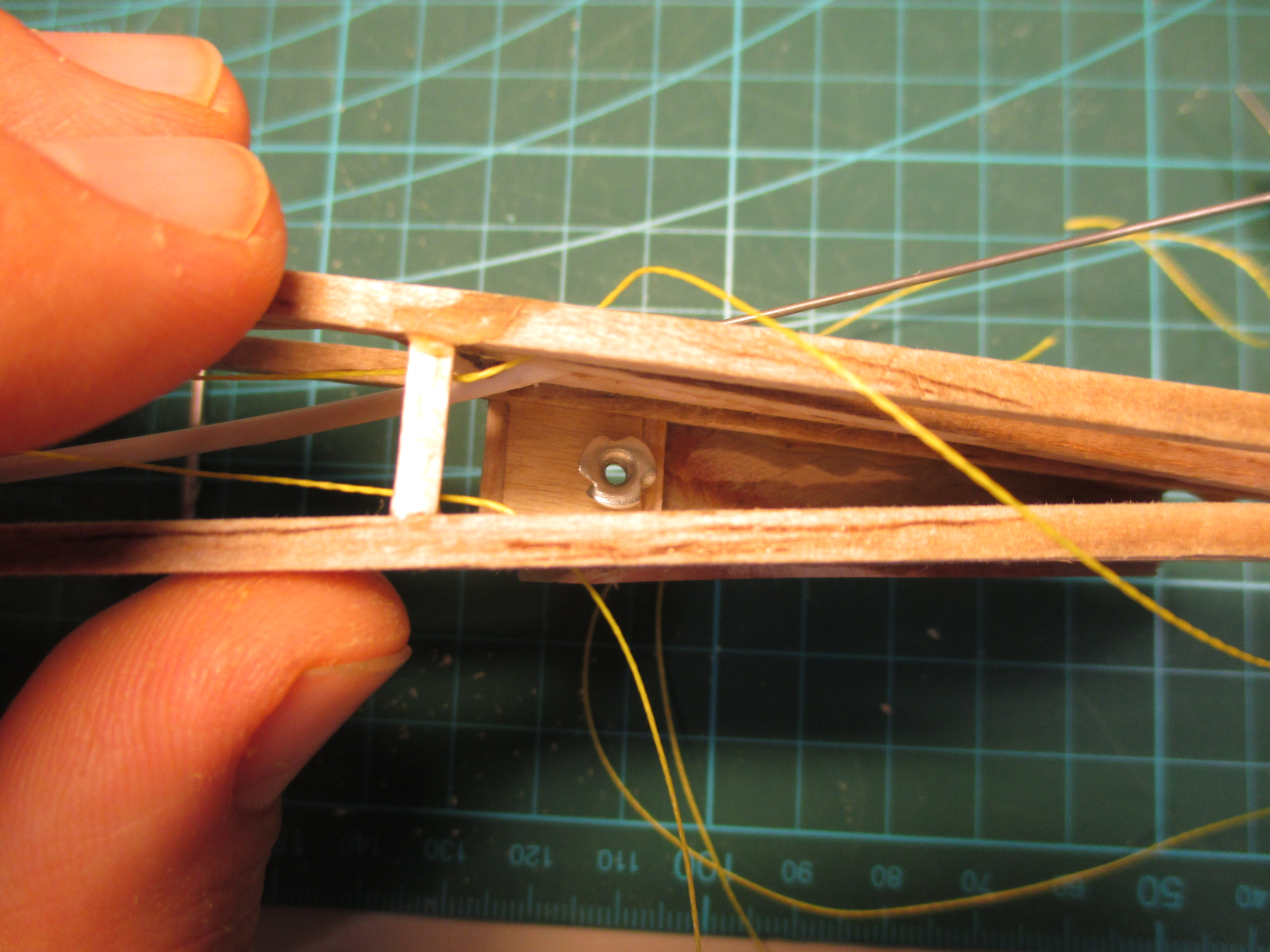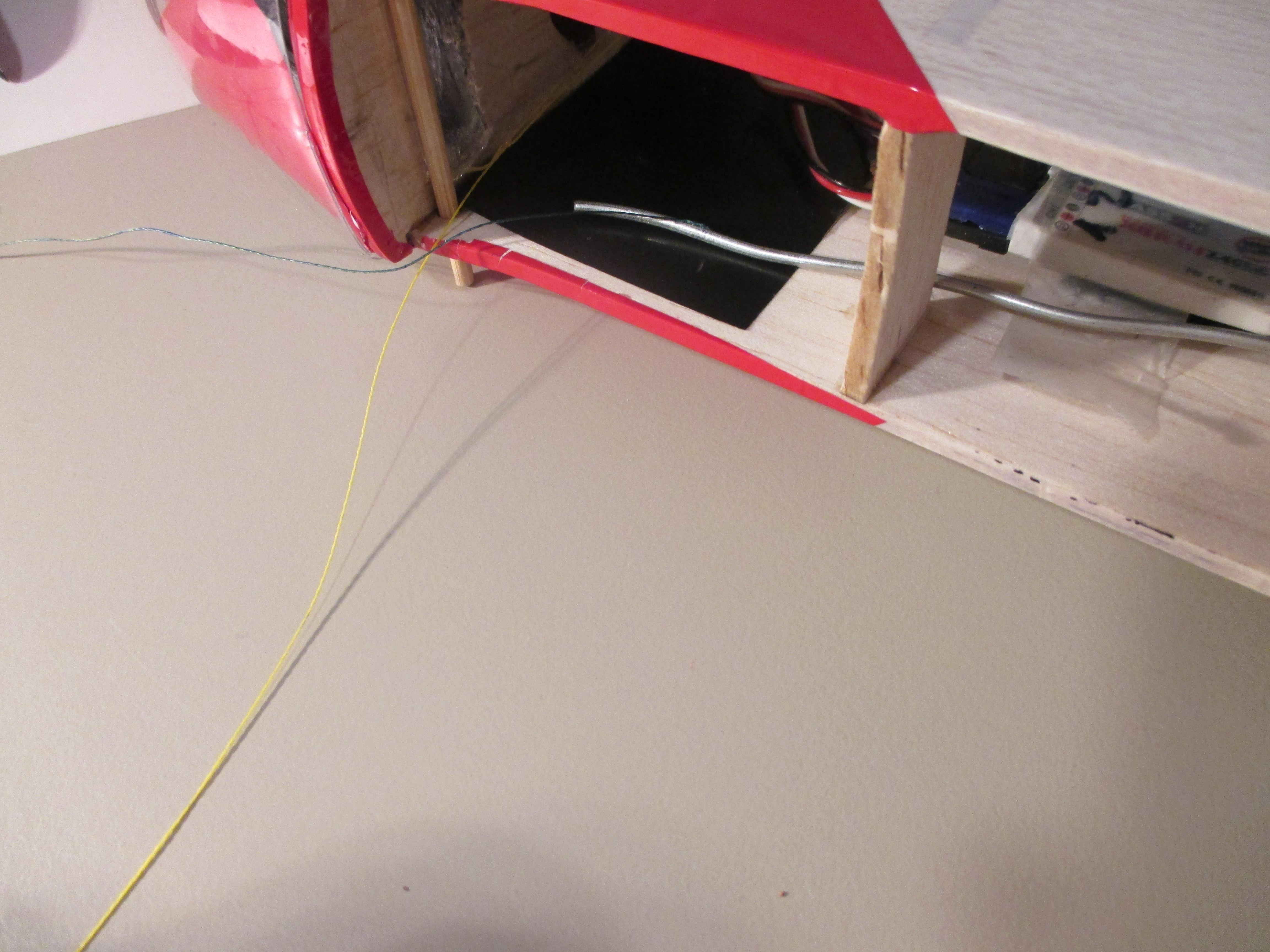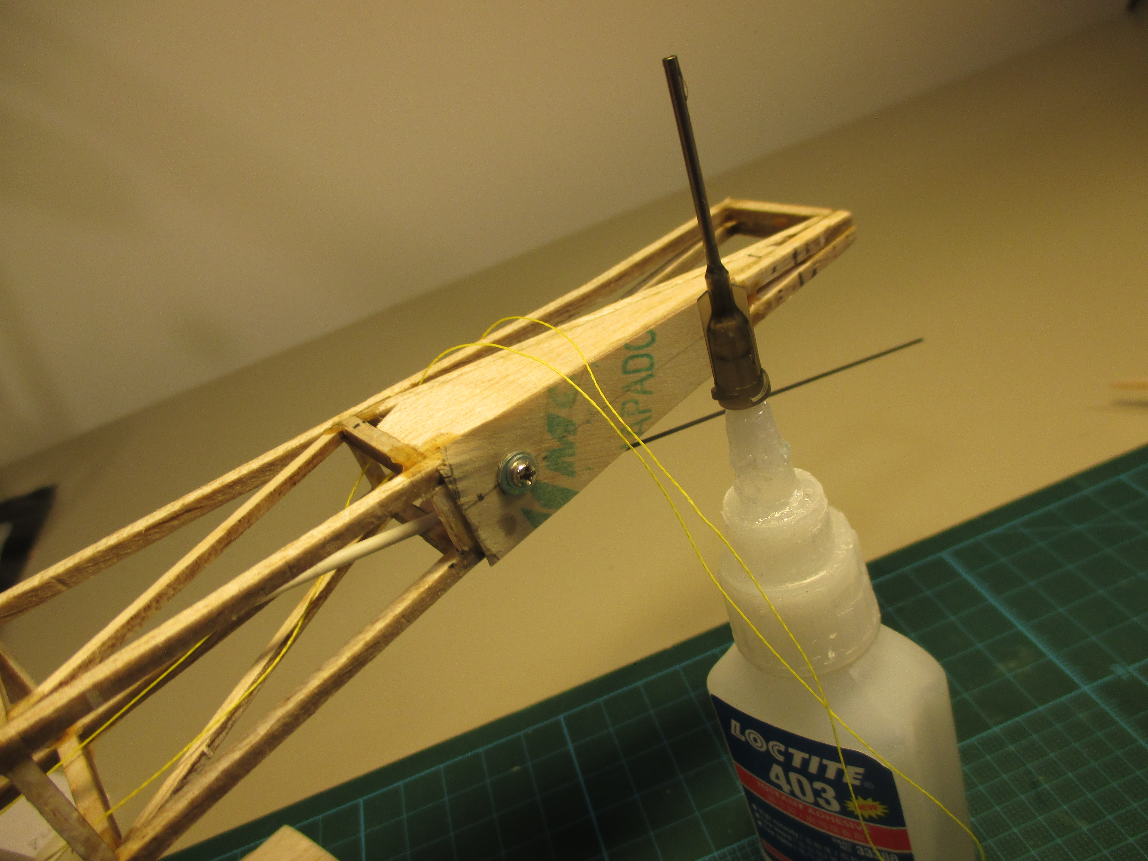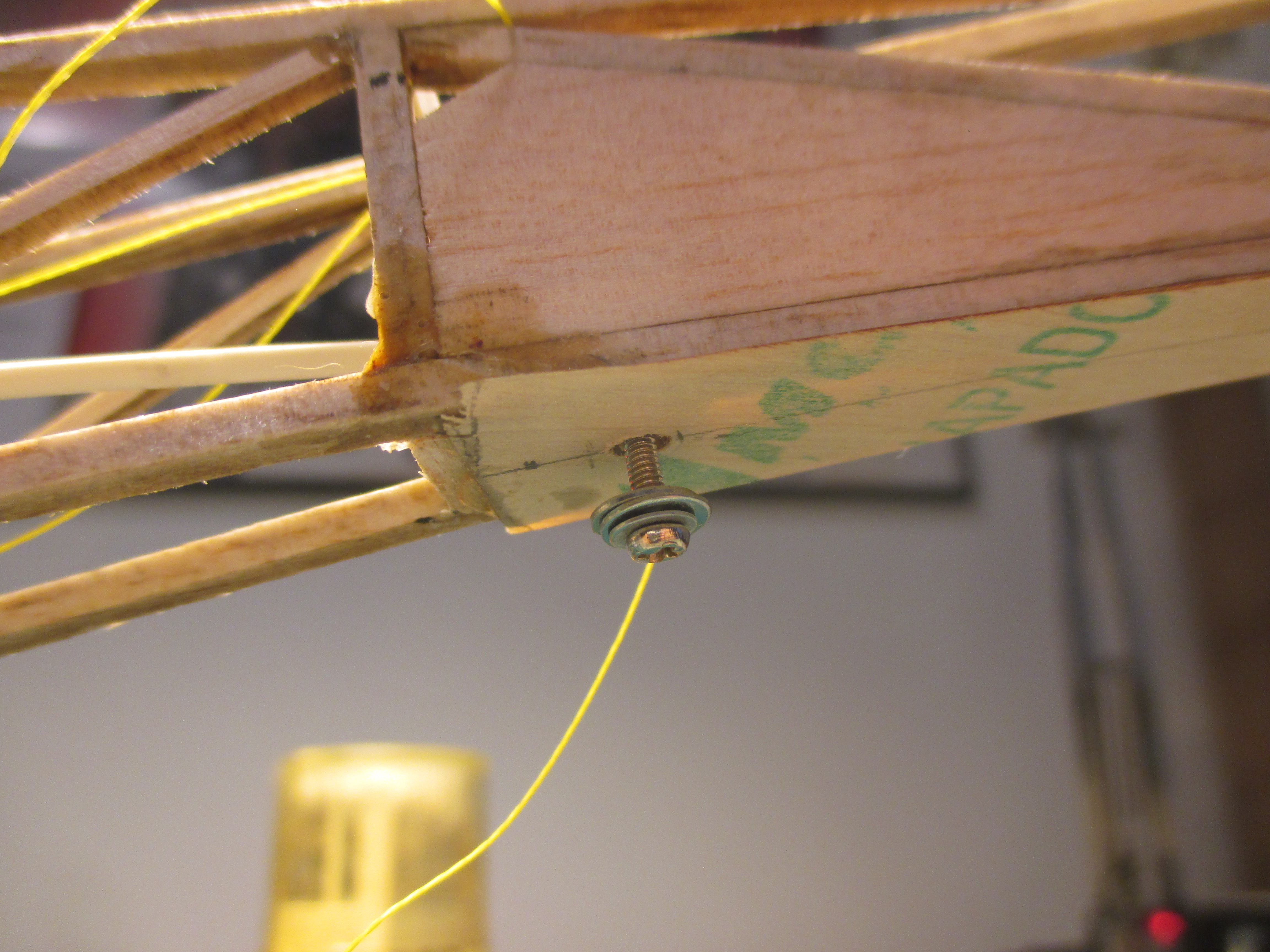 Llevo el conjunto a su sitio, y deslizo poco a poco el conjunto desde el cono para asegurar que queda simétricamente instalado. Aún puedo ajustar un poco las longitudes desde los espaciadores, atornillando o desatornillando. Cuando acabe las pruebas pondré fijatuercas (metacrilato) entre el bambú y el nylon para que no se mueva.