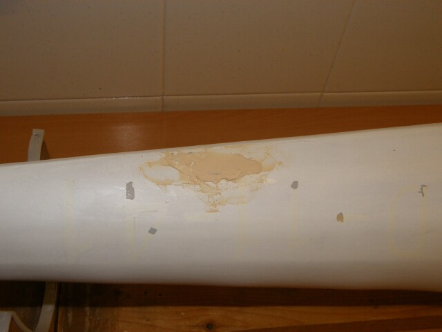 Decidi volarlo una vez antes de empezar con la corrección del error. Infelizmente en el aterrizaje una piedra me agujereo el fuse, casi en la cola.