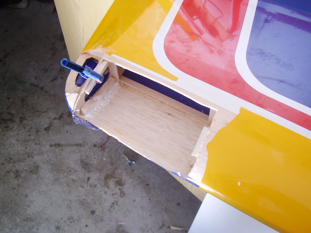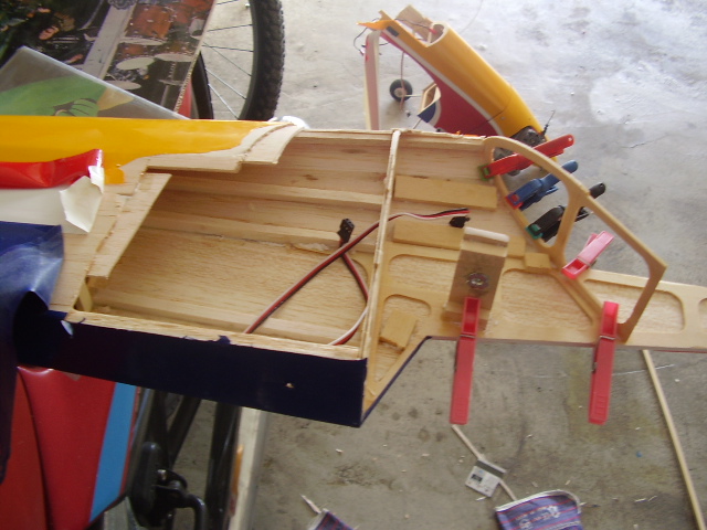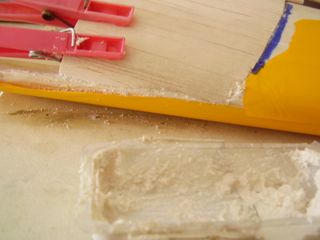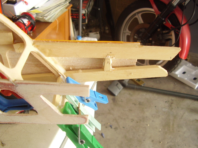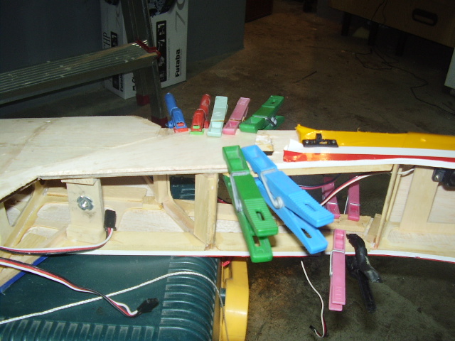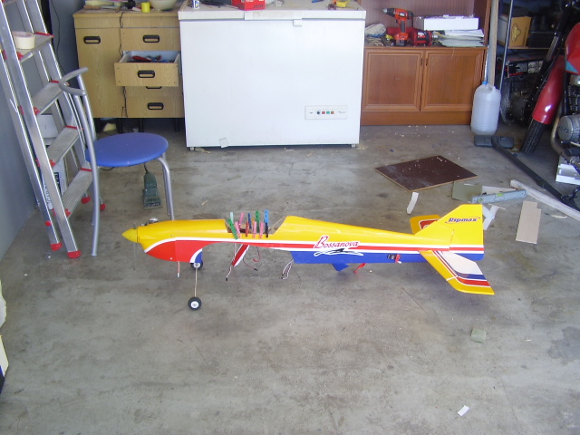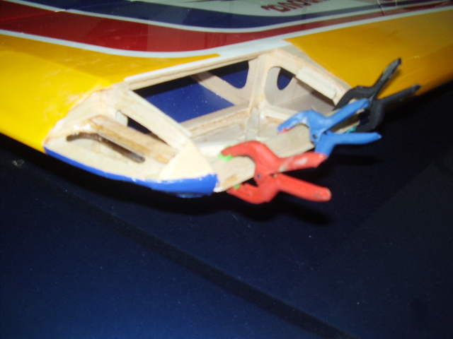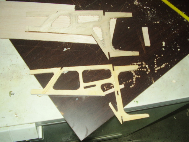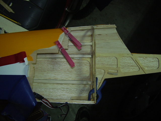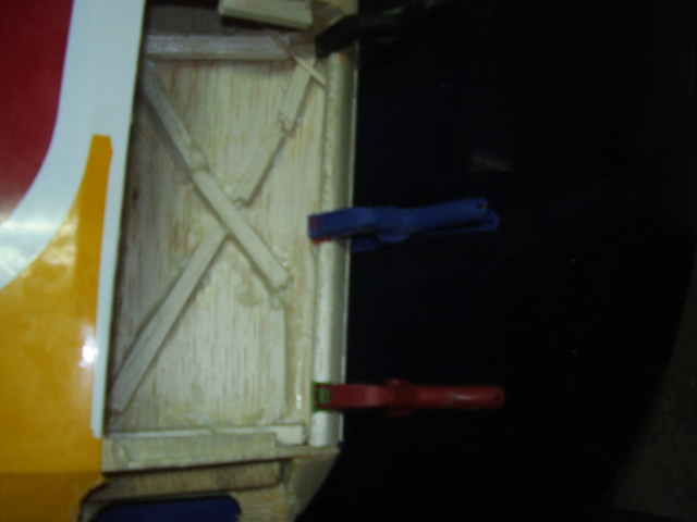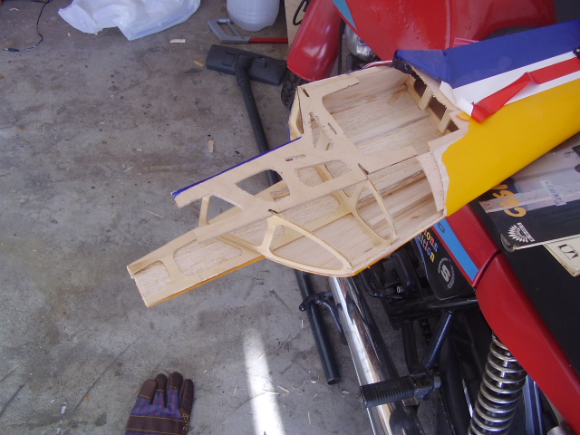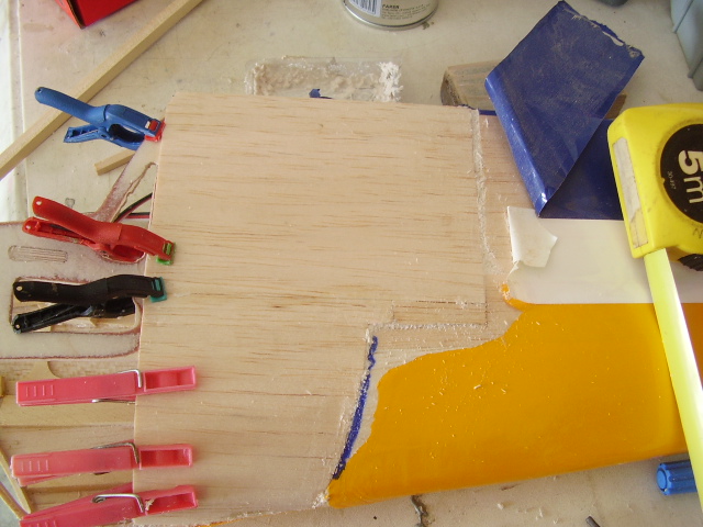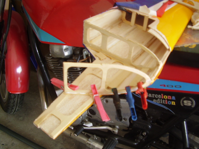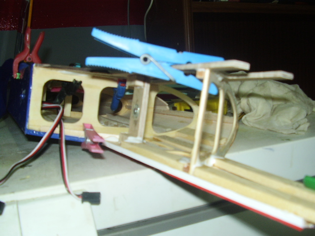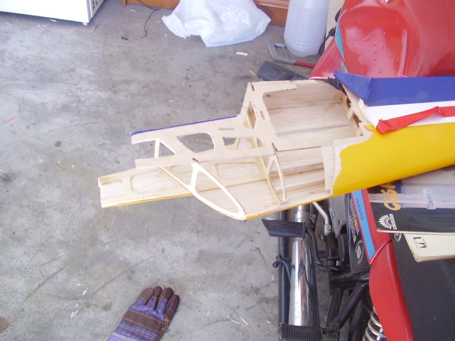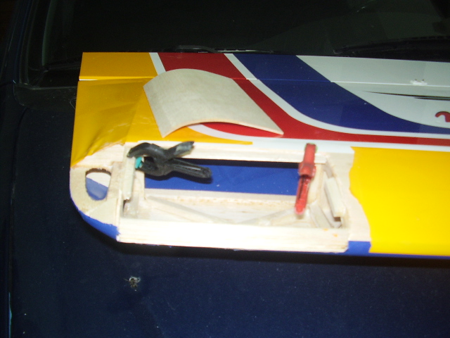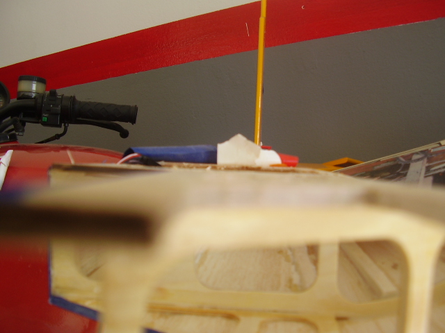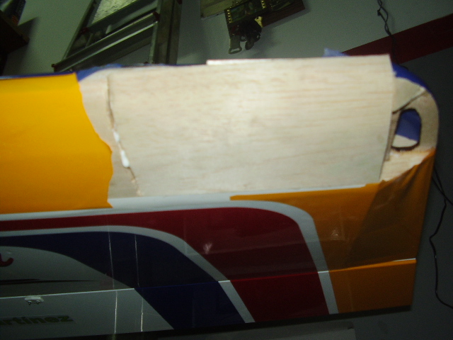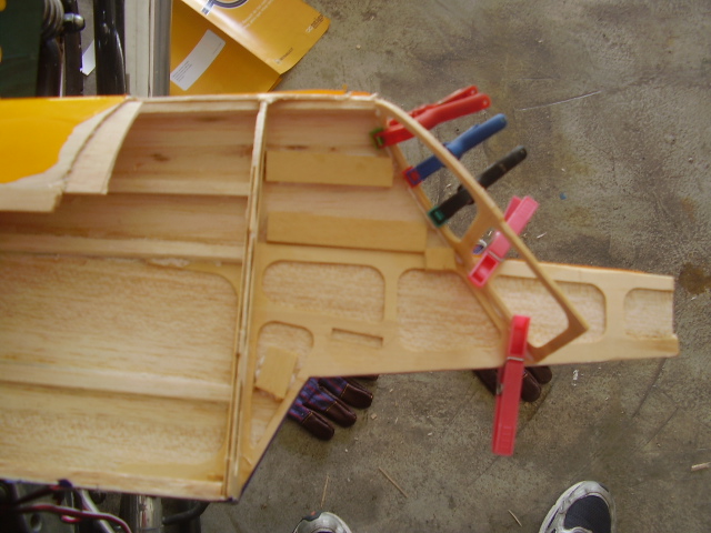 Hola, el día 31/12/06, tras su 5º vuelo, en un despegue se me paró el motor y no pude llegar a pista ya que me entró en perdida, total, una puntita del ala rota y el bossanova partido por el medio por la presión del ala, a día de hoy ya lo estoy reparando le voy a reconstruir toda la parte central y reforzar costillas etc, el ala solo me falta dar forma redonda y enchapar, en el avión ahora estoy haciendo la costilla donde va apoyada el ala, luego iré tirando listones para enchapar y pegar, calculo que le pondré unos 100gr más, espero que vuele bien, os iré poniendo fotos de la reparación.