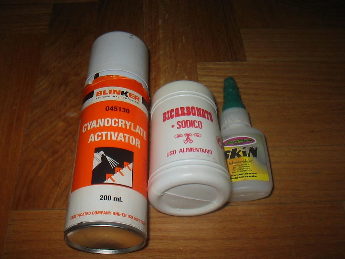 con el ciano y el bicarbonato se seca en 3 segundos . el ala de la foto heran dos trozos y nira como nueva el activador de bote hace lo mismo pero vale 13 euros