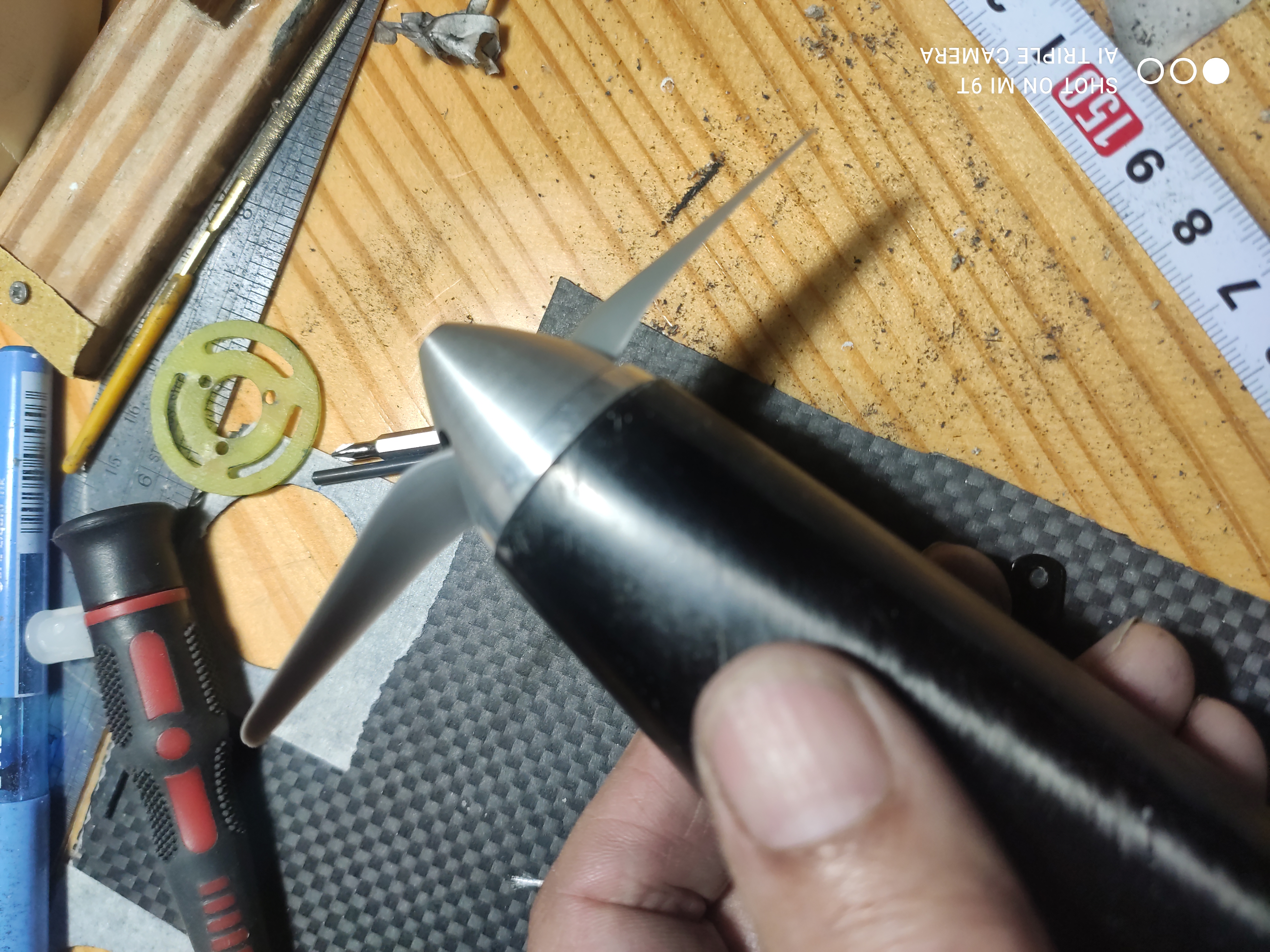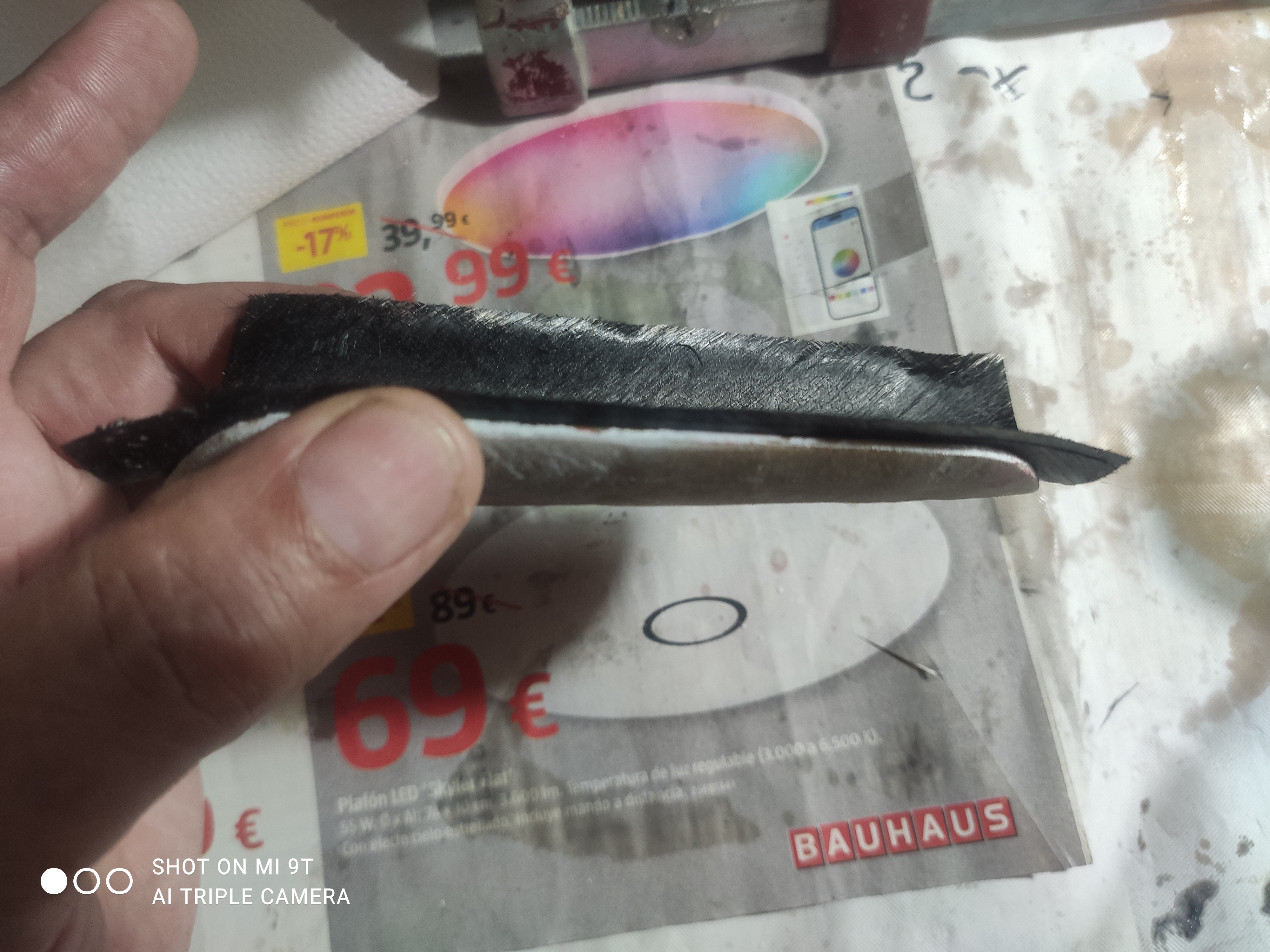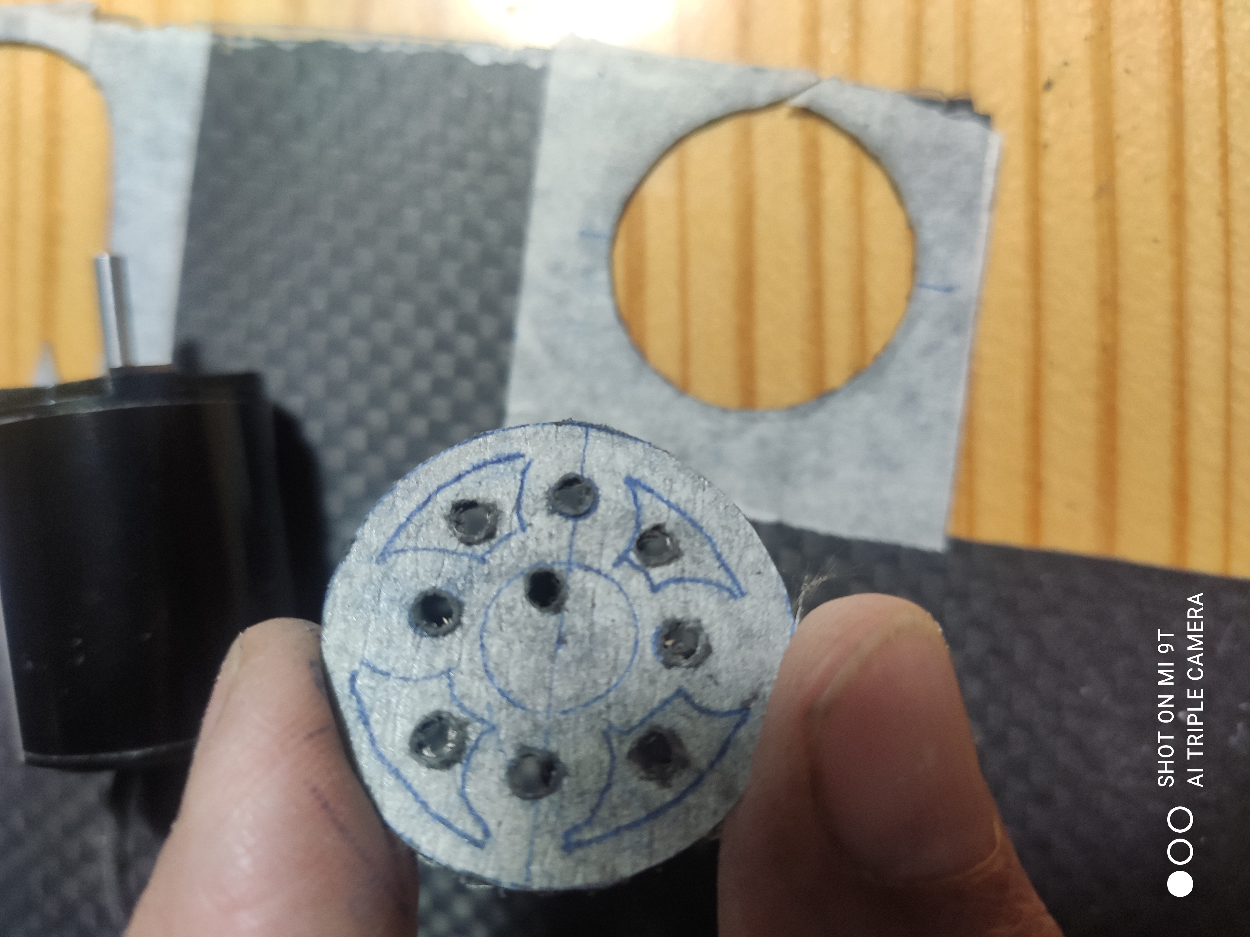 La bancada del motor se ha recortado de una placa de carbono hecha en casa con 3 - 4 capas de carbono de 200 g/m2 prensada entre dos tablas, como plantilla viene bien un trozo de cinta de pintor sobre la que trazaremos una circunferencia de 30mm, en este caso, para los agujeros de los tornillos nos vendrá bien una bancada metálica de esas que salen en los motores con la que podremos marcar los puntos a taladrar.