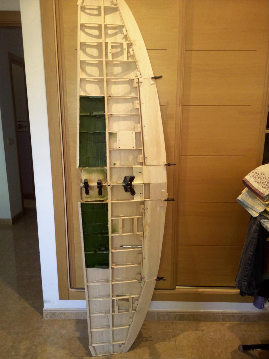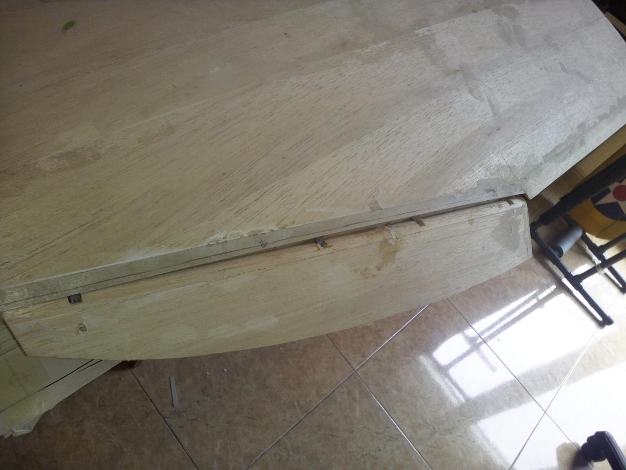 Wenas,la cosa avanza despacio,esta vez le ha tocado al enchapado de las alas,al igual que con la parte superior se hace encolando varias tablas sobre una superficie bien plana.luego de ajusta al contorno,y pegado con cola blanca,para mantener el enchapado en su sitio e uilizado "el peso de la cultura". :D