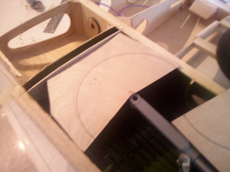 antes de enchapar las alas,he decidido empezar a trabajar en el asunto de las tapas del tren,mejor ahora que hay mas espacio.Lo primero y aprovechando la plantilla que viene con el plano de la tapa del tren la he sacado con cartulina.luego con contrachapado de 0,6 con su forma definitiva.La compuerta interior esta echa a ojimetro,puesto que como el tren no esta en su posición real no me quedan mas narices que modificar su forma,Y e aquí que me sale el primer quebradero de cabeza.las bisagras de la puerta interior deben tener el eje alineado ,sin embargo la superficie del ala es curva......Hala, a comerse la cabeza!!! :roll: :roll: :roll: y a pensar en que posición ha de ir el cilindro de aire que hará abrirse y cerrar dicha compuerta: