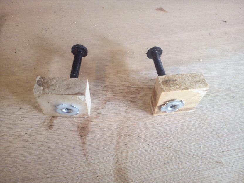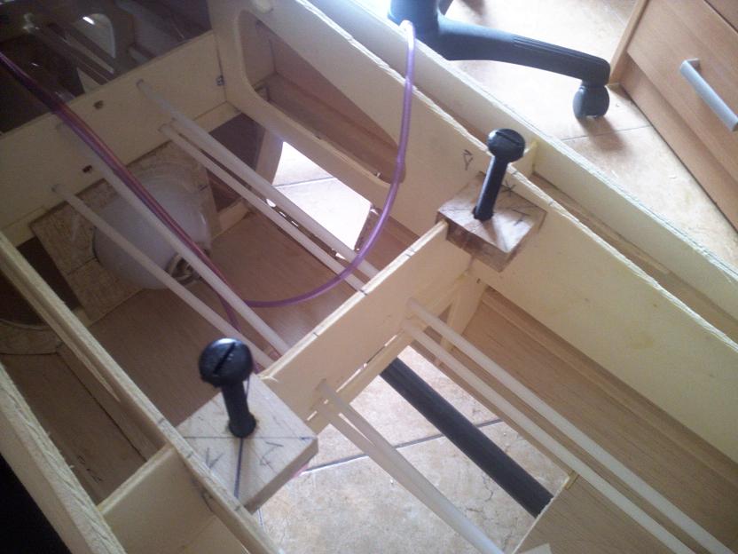 Gracias Manuel.Hoy le ha tocado el turno de la fijación de las alas al fuselaje.fuselaje. Segun las instrucciones una vez puestas en su sitio hay que taladrar a través de ellas hasta llegar al taco alojado en el fuselaje que retendrá el tornillo. Tambien pone que el tornillo hará la rosca en la madera ,y que hay que endurecerla una vez echa la rosca con ciano super liquido.Bueno pues como a mi esto me parece un peligro en un avión de 2 metros aparte de un churro de solución e optado por poner autoblocantes de 7 mm.Los primero agujeros que hice en los tacos siguiendo las instrucciones me salieron fatal,así que me e ingeniado una manera de que me queden bien centrados.