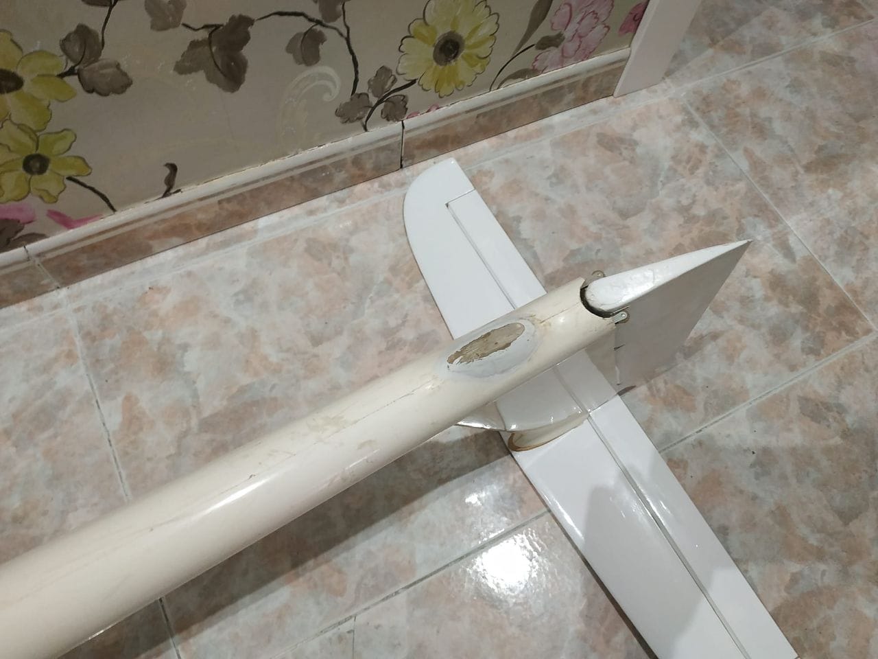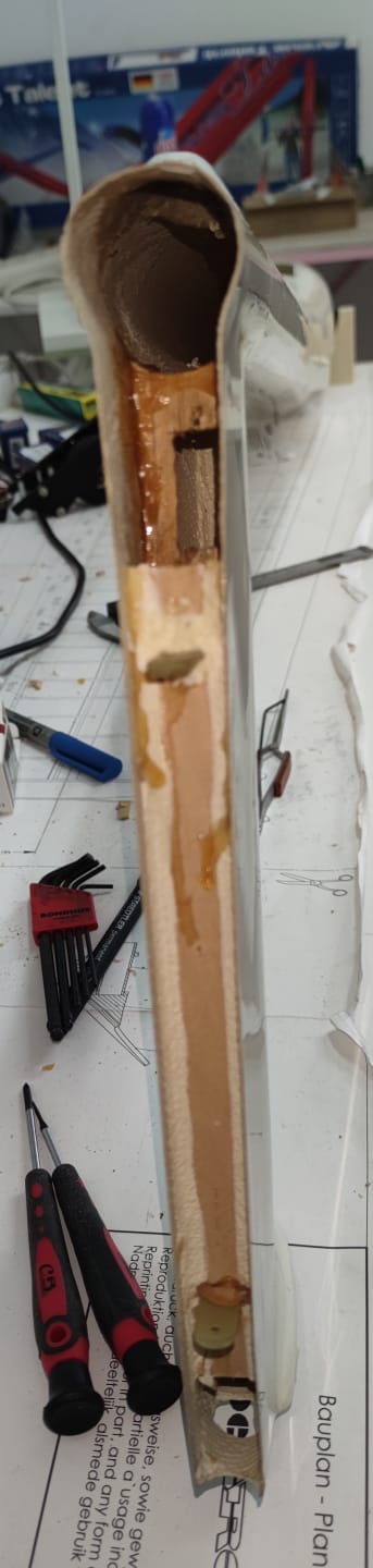El ala lleva las típicas pequeñas varillas de acero de 4mm para fijar el ala. Lleva un sistema de sujeción que no me gusta nada, metiendo esa varilla en un tubo Interior en el fuselaje, y tornillos de esos pasadores que sujetan.