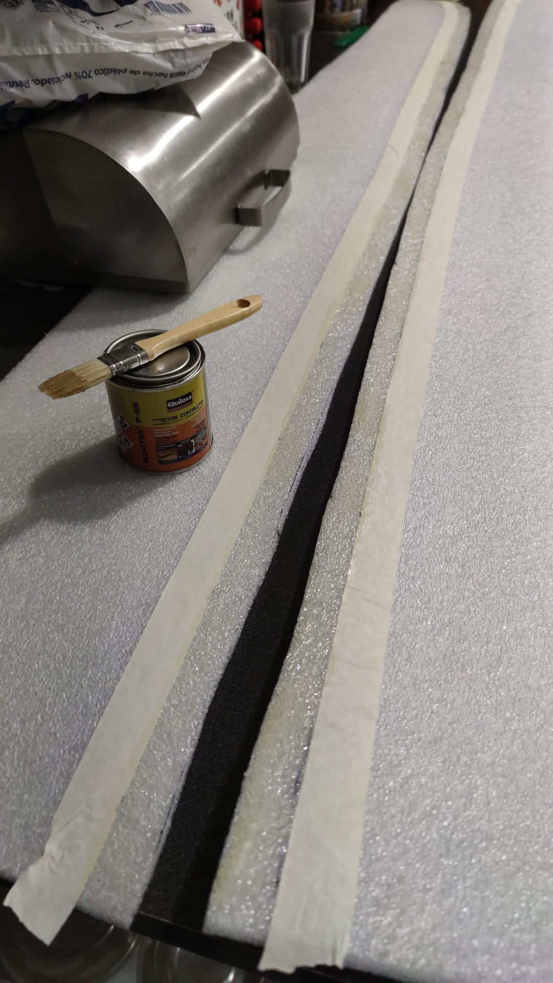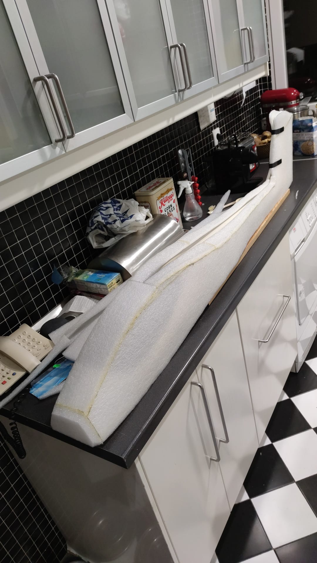 Curiosamente, lo primero que hice con el avión, fue realizar una funda de protección.... Iba yo de camino a casa por la calle Serrano de Madrid, y paso por una de esas importantes joyerías que estaba en obras, y me fijo que habían tirado unas fantásticas láminas de espuma de alta densidad, en paños muy grandes... de unos 10mm de grosos, tal vez algo menos...