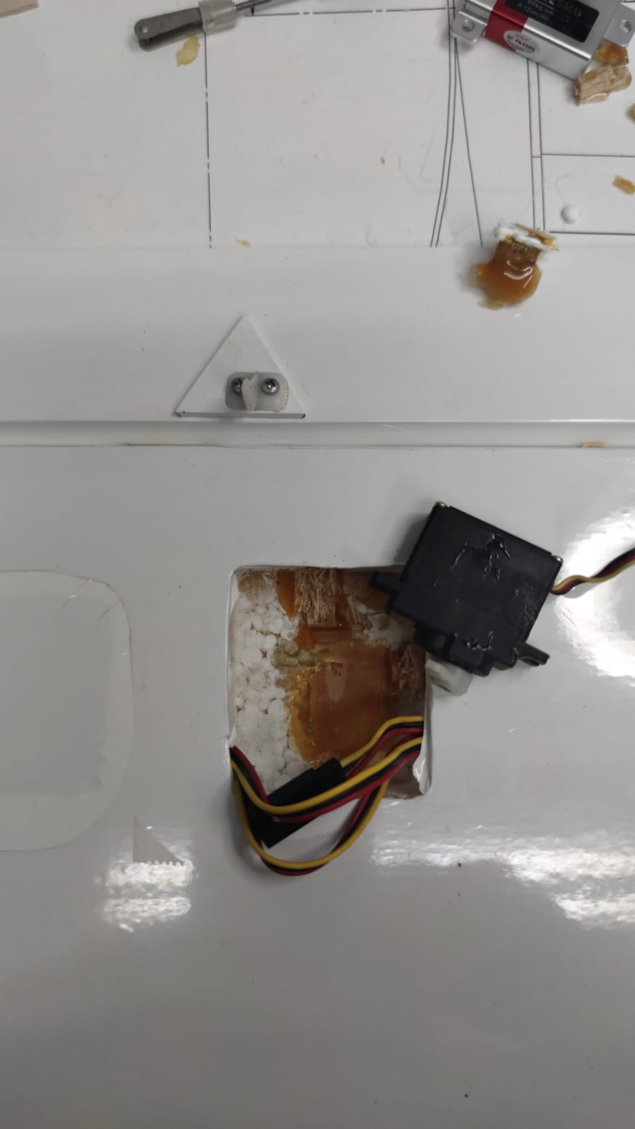 Los servos Hitec los saqué, rompiendo los tacos de madera que habían pegado, a base de meter un destornillador planto en la madera que iba astillando el bloque. Una vez retirado el servo , con la dremel y una punta de fresa, fui comiendo todo el epoxy hasta dejar la superfice limpia. Por el color del epoxy, y los años del avión, tenía toda la pinta de ser el típico araldit de antaño.