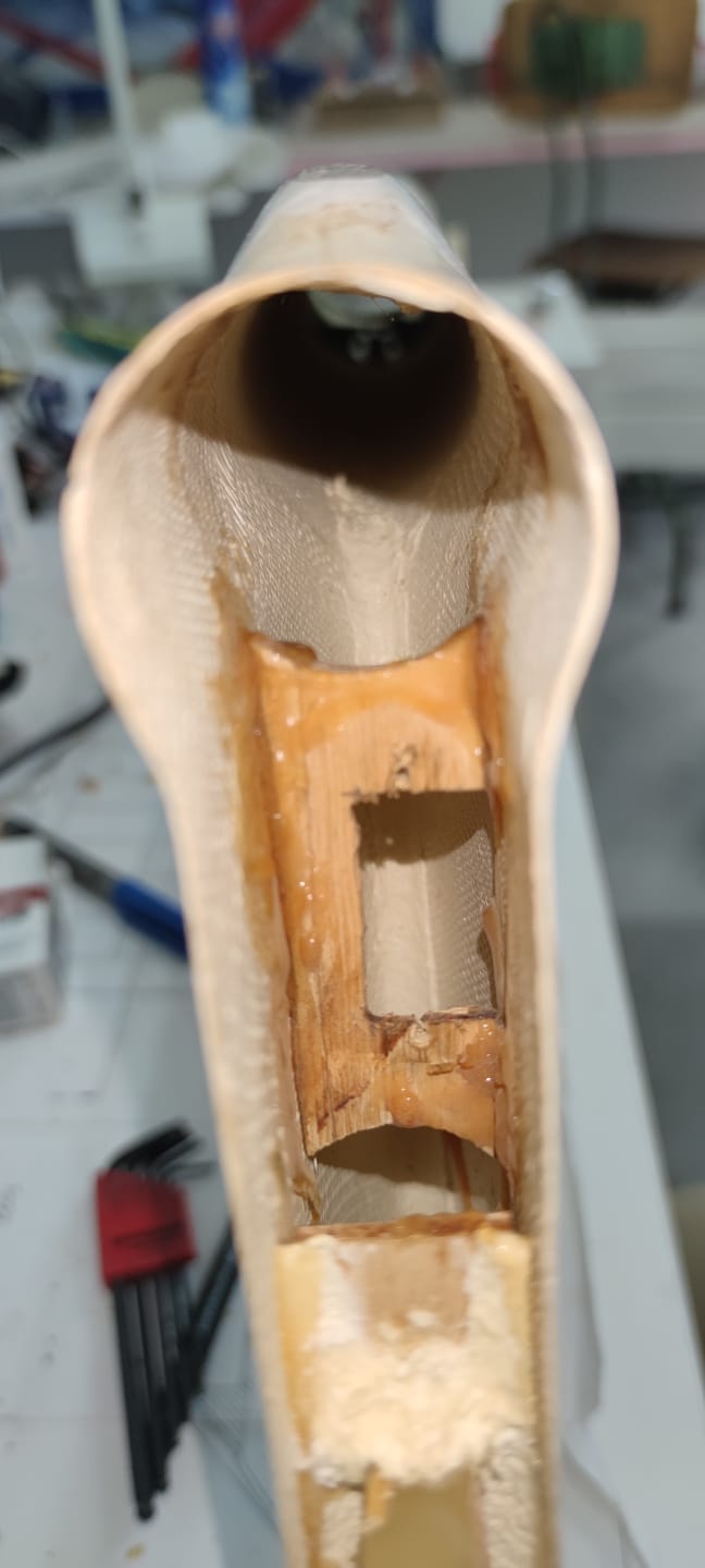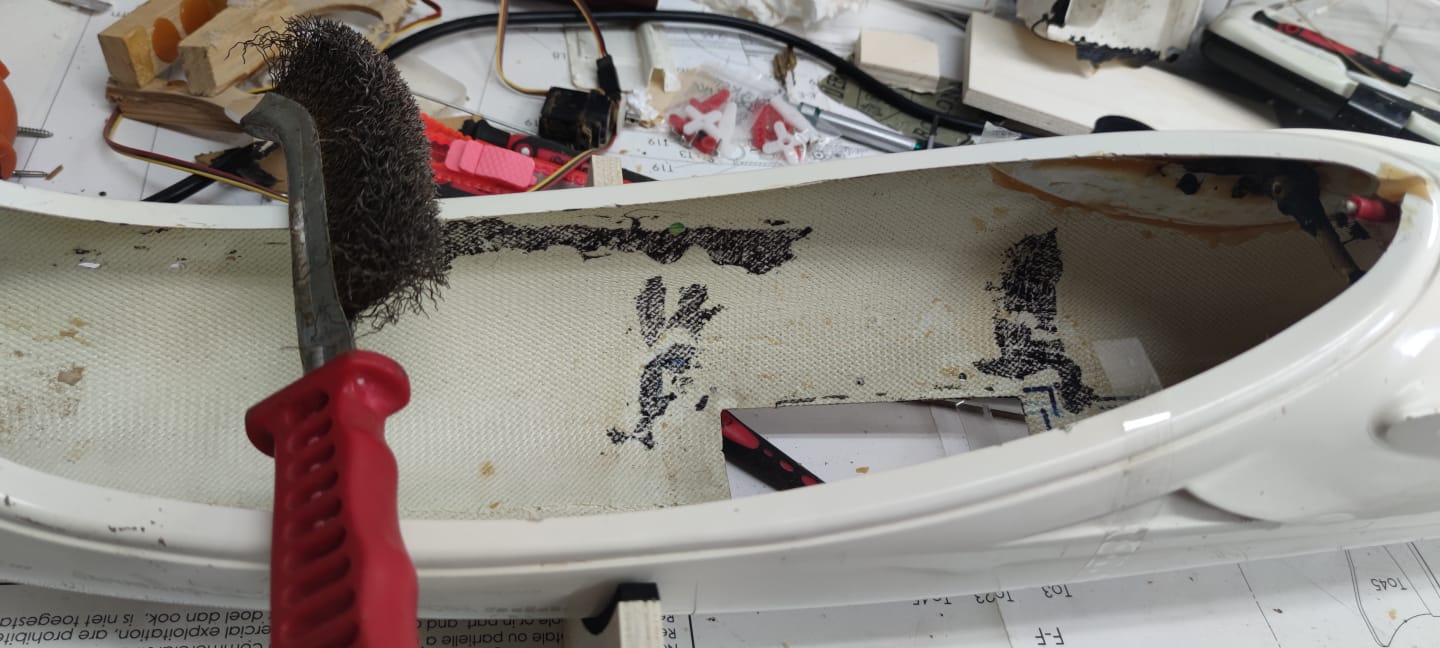 Eliminar todas las piezas de madera fue complicado, porque se habían pegado con algún tipo de goma, sikaflex o algo así.... No era duro del todo, tenía un tacto gomoso de color negro... Empecé a comer con la dremel y la punta de fresa, pero era muy difícil mantener el pulso, que no se fuese la punta, pudiendo dañar el fuselaje.