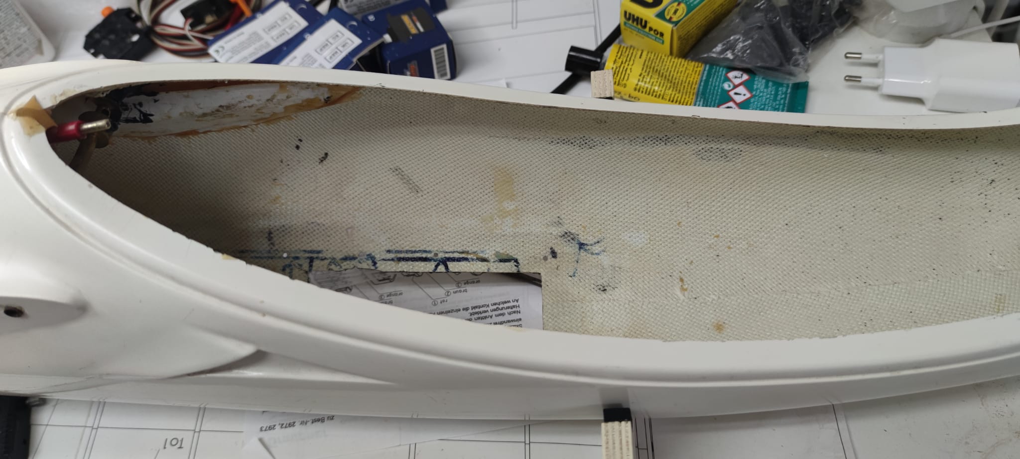 La idea era vaciarlo, quitar la electrónica vieja, servos futaba con 20 años, bancadas, cortar morro para colocar motor, lijar y pintar ya que con el tiempo el fuselaje estaba amarillento....
