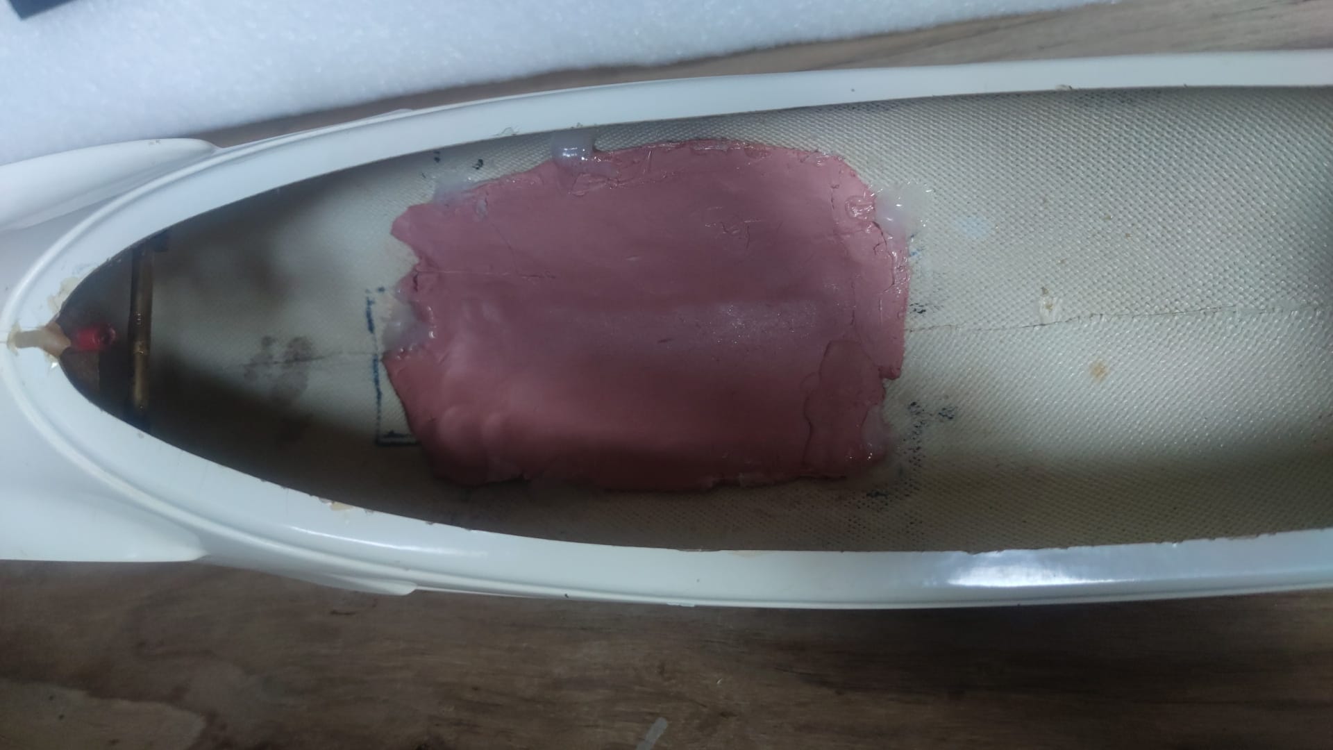 En el chino compré arcilla, saqué una pieza plana de tamaño adecuado y lo metí por dentro del fuselaje, aplastando con suavidad para que tomase la forma del fuselaje. Lo dejé secar, y se pegó con varios puntos de pegamento caliente.
