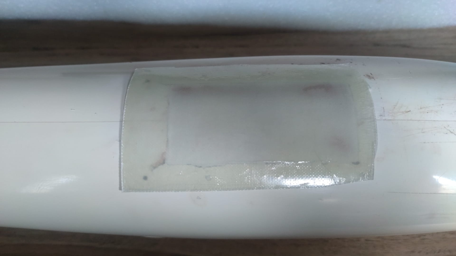 Corté 6 piezas de fibra de 160gramos (comprada en Feroca), que sumados dieron unos 10 gramos. Realicé la mezcla de resina de laminar (Feroca), y saqué unos 12 gramos. Apliqué fibra a fibra, con la resina y esparciendo con una tarjeta cortada a modo de espátula, hasta completar las 6 capas.