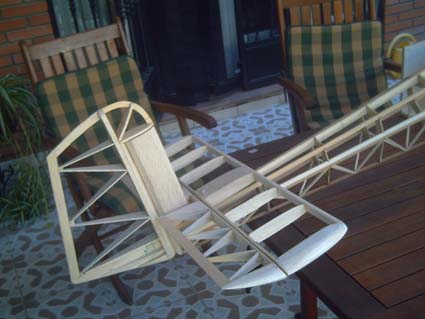 Os adjunto fotos de mi último proyecto, que es el primero que estoy construyendo a partir de plano. Es trata de un semimaqueta del velero Rhönlerche que estuvo operativo en las escuelas de vuelo sin motor hace ya algunos años. La envergadura prevista será de cuatro metros y el peso creo que andará por los cinco kilos. La verdad es que esta durando mas que un día sin pan, pero entre falta de tiempo y dificultades derivadas del plano, que compré en Alemania a precio de oro pero que es un autentico desastre, faltan piezas dibujadas , los alzados y secciones no coinciden etc.., esta provocando el retraso.