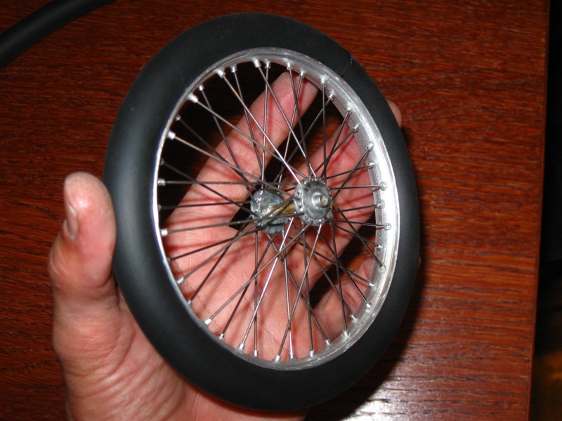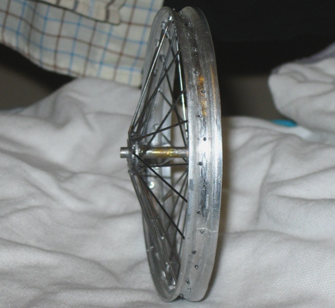 Luego he puesto el primer juego de radios (en sentido a las agujas del reloj) que van a parar a la parte externa de la arandela del eje (los radios alemanes se unían en paralelo al eje, es decir, la parte que se inserta en la arandela del eje está doblada para que quede paralela al eje). Los radios son varilla de acero de 0,8… …los radios van pegados con epoxi tanto al eje como a la llanta. Hay unos tubitos de aluminio que simulan los tetones donde se roscaba el radio (naturalmente hay que elminar el exceso de varilla)…