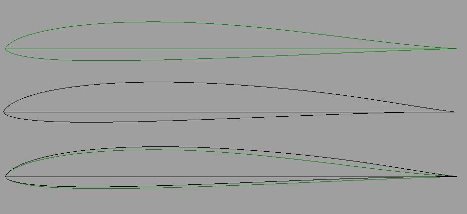 Si, este también es válido. El MH43 parece un poco más rápido que el MH32 y el MH32 un poco más sustentador que el MH43. Los dos perfiles son buenos y parecidos. Puedes escoger uno u otro dependiendo de si prefires un poco más de velocidad o de sustentación y también tener en cuenta que el MH43 tiene el borde de fuga más fino que el MH32. Cuidado con esto, no sea que no lo consigas cortar bien (no sé si tienes una cortadora CNC) y también si lo vas a enchapar con balsa por lo que te decia del borde de salida muy fino. Te pongo una imagen de los dos perfiles para que veas lo que te comento. En verde el MH43 y en negro el MH32.