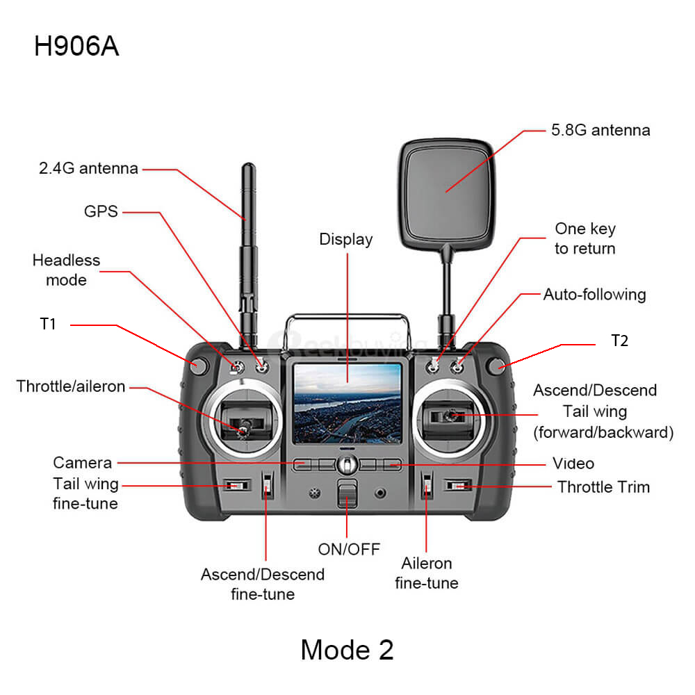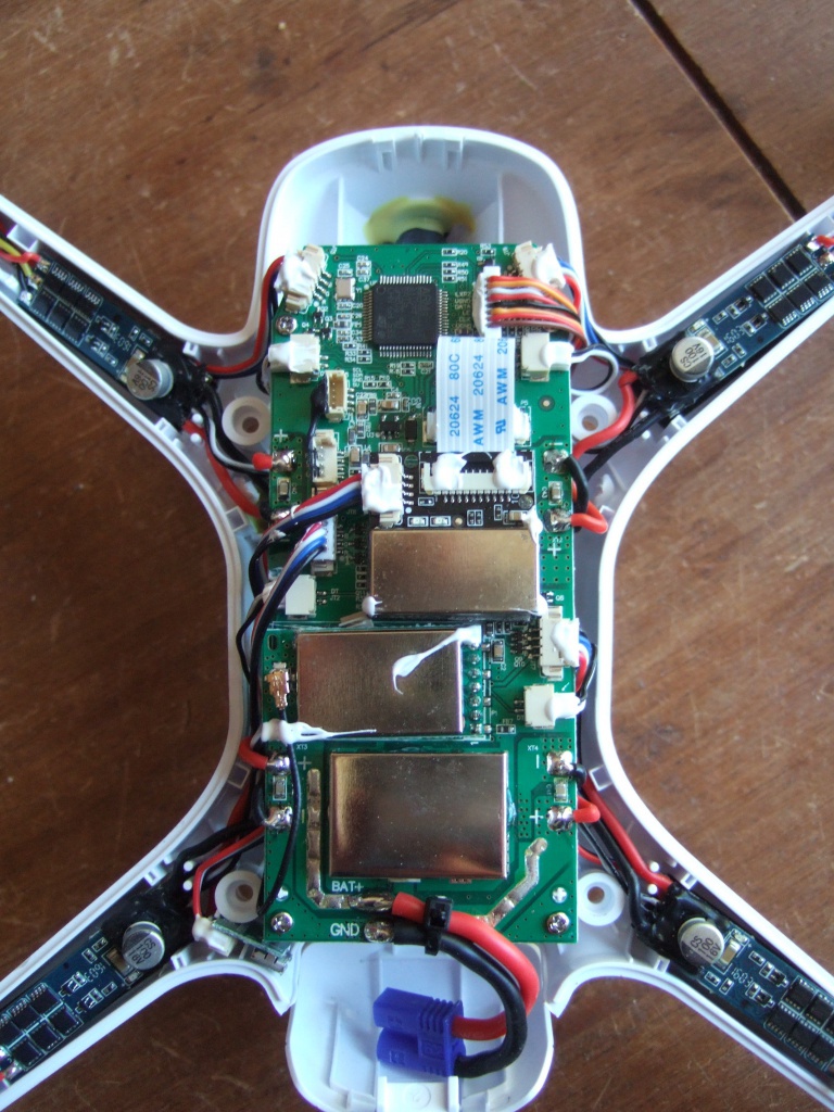 Mi modelo es el "advanced" que viene con una emisora más completa que la estándar, concretamente la H906A. Esta emisora tiene dos botones del tipo potenciómetro llamados T1 y T2 que, según el fabricante, en este modelo no se usan pero en otros modelos se encargan de hacer funcionar los servos del gimbal 3D. He intentado buscar información o algún esquema eléctrico de la placa principal del receptor para ver si tengo alguna opción de conexión, pero no he encontrado nada. Sospecho de unos conectores que están situados al lado del modulo de conexión de 2,4 Ghz pero no se por dónde empezar.