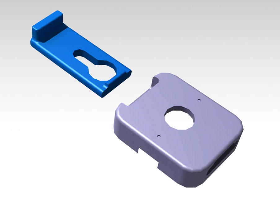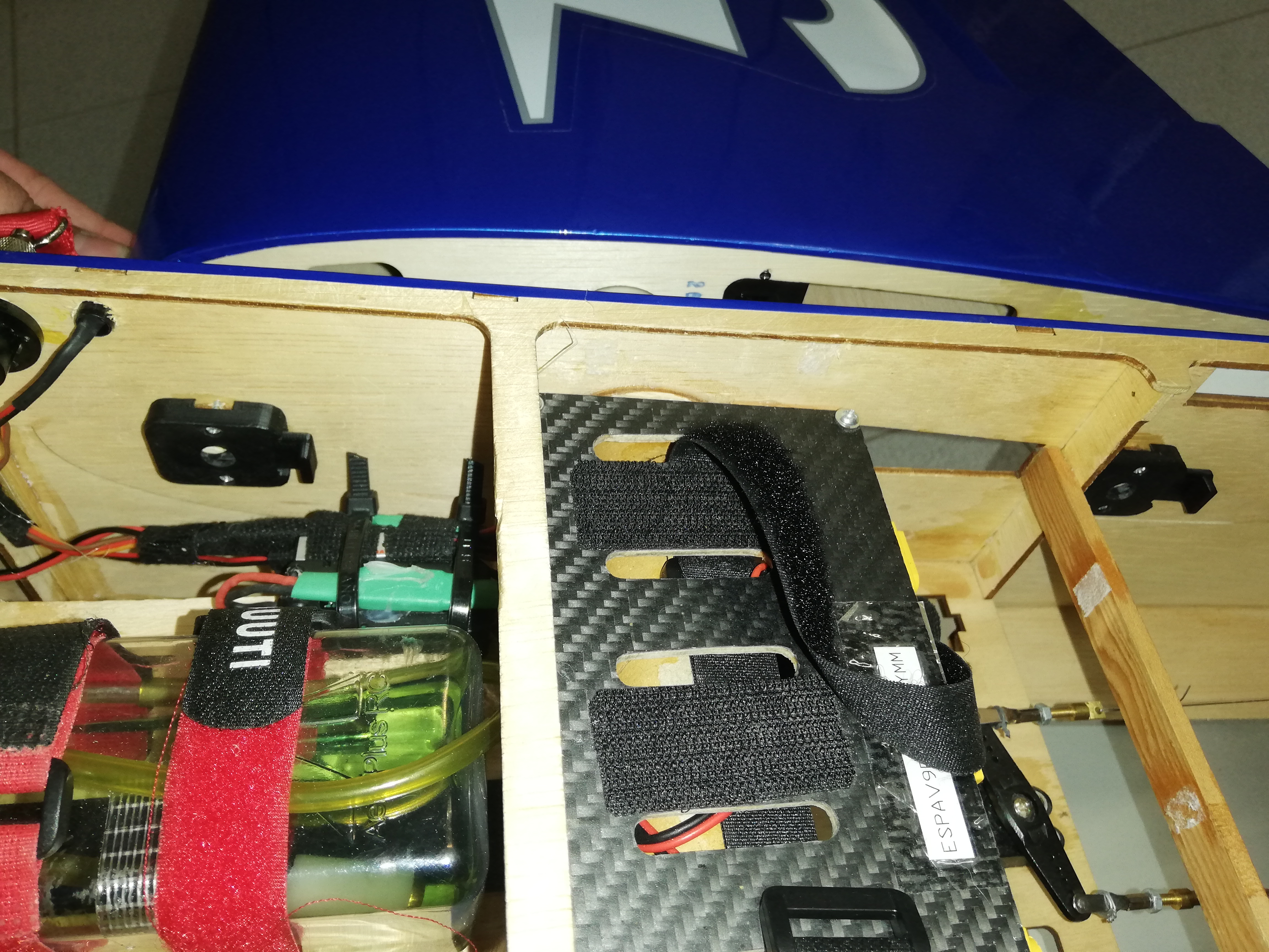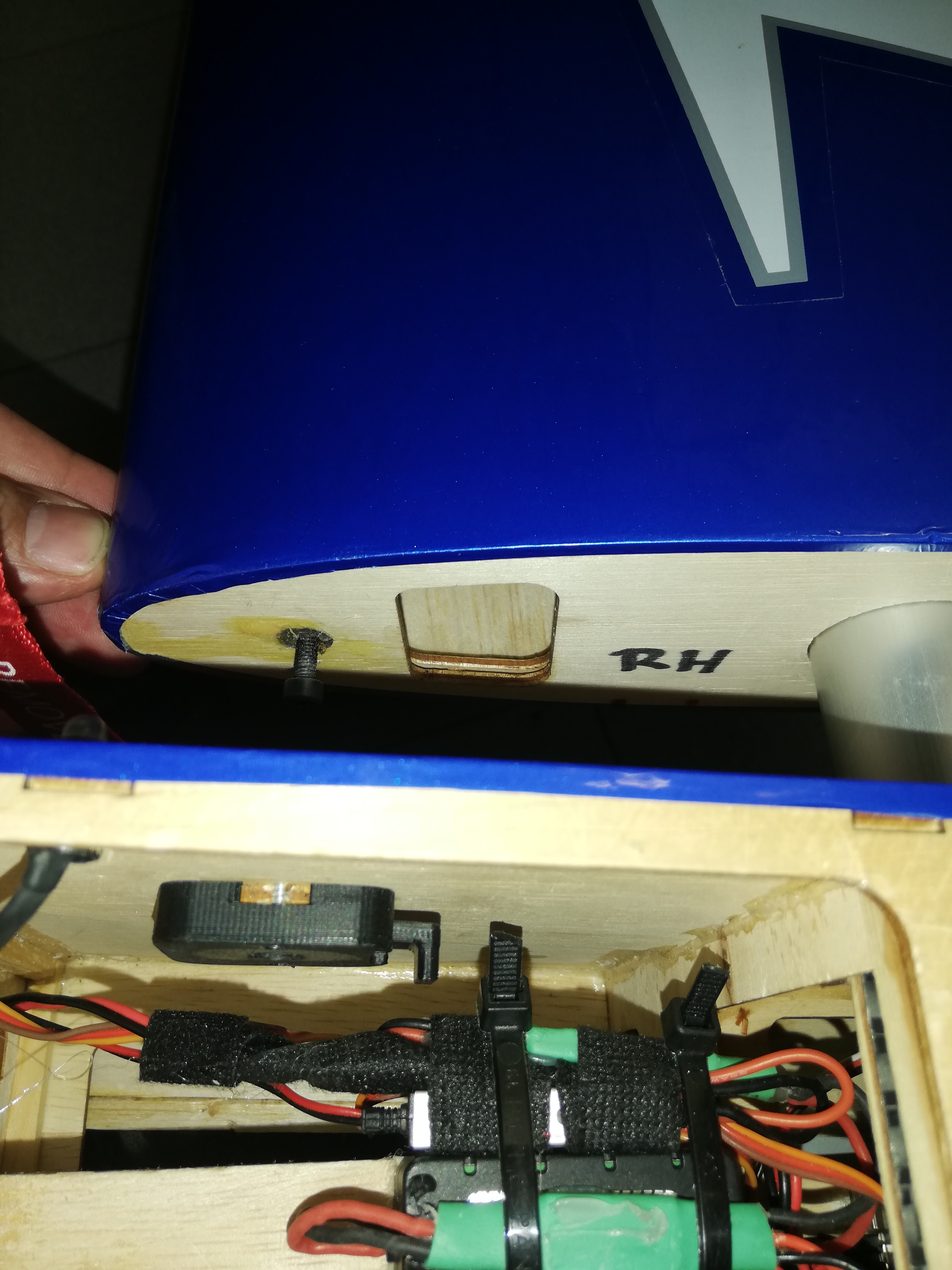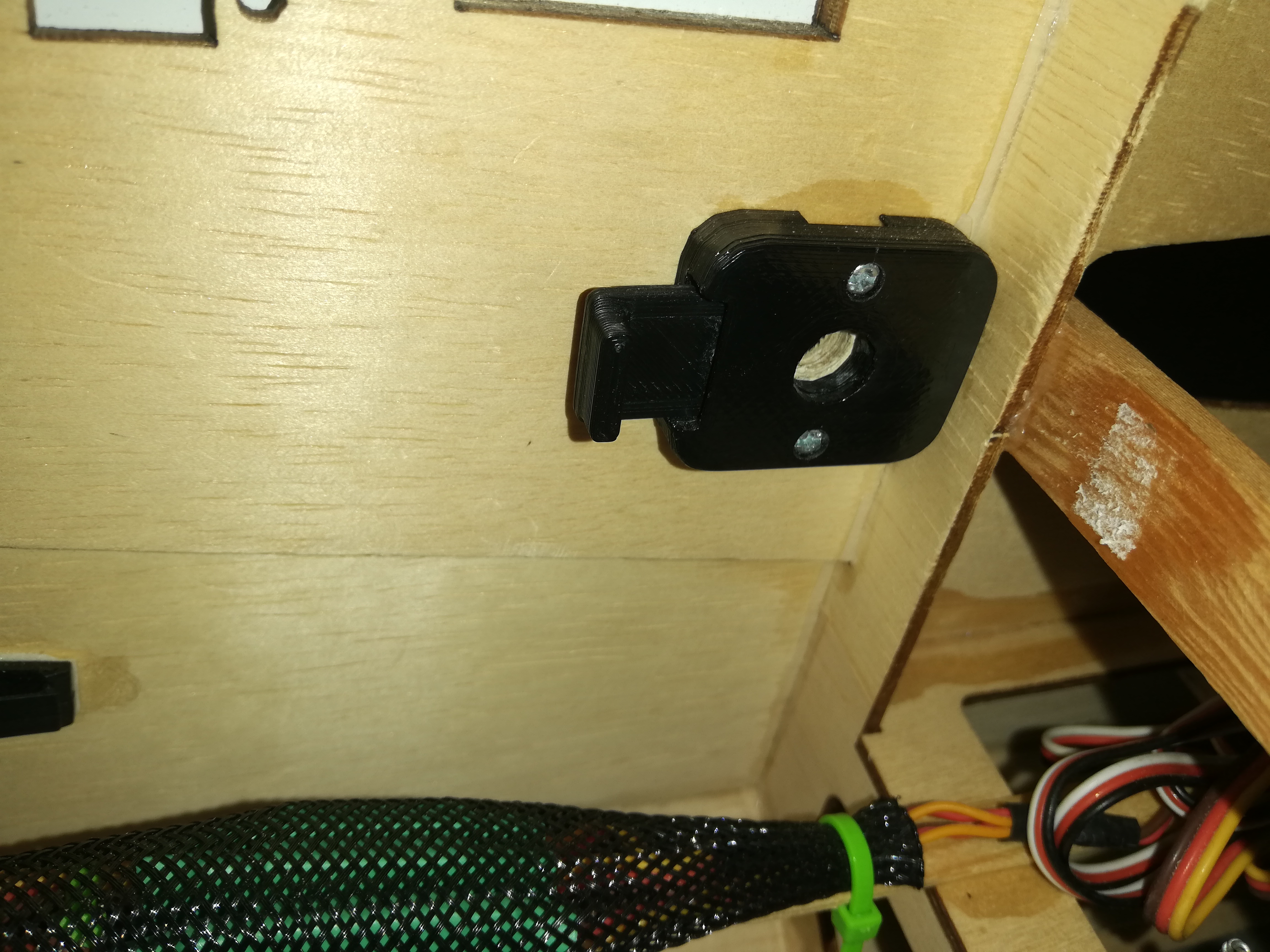 Y luego en el fuselaje, he montado el cierre con blocante sobre el taladro existente. Dos piezas impresas en ABS, con PLA tambíen valdría.