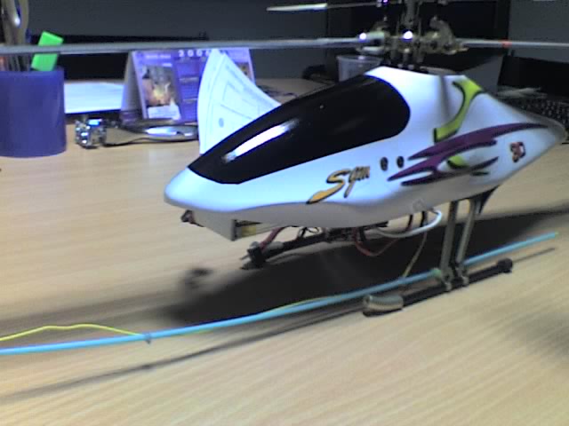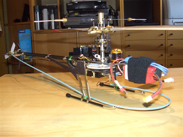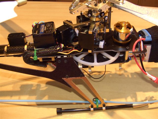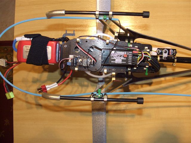 Le montamos el gyro variador y demás y esta listo para volar. El primer vuelo serio lo hicimos en un pequeño polideportivo y la verdad esque muy bien, con el piñon mediano, se le veia un poco falto de potencia a la hora de las trepadas, pero para ese polideportivo y primeros vuelos es más que suficiente. Los compis que lo vieron me dijeron que para volar en exterior se me iba a quedar pequeño de motor. Me quede con las ganas de meterle el piñon grande.