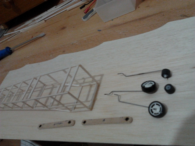 Pues Ya empecé con el fuselaje y me he apañado unas ruedillas de un coche de juguete y una especie de rodillos de goma que había dentro de un radio casette antigüo y van al pelo.