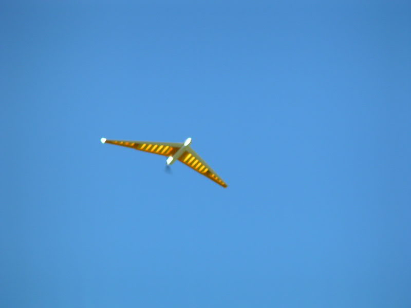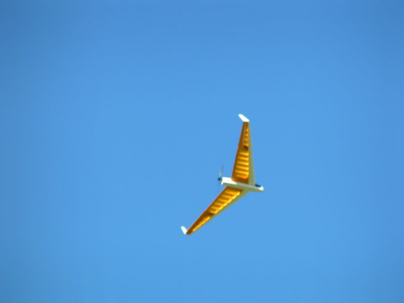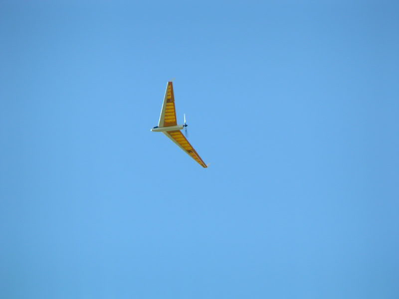 En cuanto al vuelo, y por motivos evidentes, no se puede aplicar motor hasta que el modelo esté ya en vuelo. A este respecto, la primera prueba hace un par de semanas resultó un "fracaso" ya que pedí a un compañeero del club que me lanzara el modelo y él, acostumbrado a lanzar modernos y potentes veleros, lanzó el ala con gran impulso pero un ángulo de no menos de 45º,..... resultado: el modelo metió limpiamente el ala izquierda a unos 3 metros de altura (por lo que preferí no aplicar motor para no empeorar las cosas) pegándose el modelo un gran impacto contra el suelo; increiblemente solo se rompió el engranaje del servo del ala izquierda que fue lo primero que tocó el suelo......¡a casa a reparar el servo!.