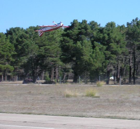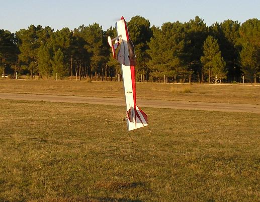 En cuanto 3d es una gozada, gracias a sus superficies de mando puede realizar todo tipo de figuras, no obstante para aplanar las barrenas invertidas es necesario la máxima deflexión del mando de profundidad y aun así no se consigue aplanarla del todo. Sin embargo la barrena a cuchillo la realiza sin problemas. Ahí os dejo unas fotos para veáis lo que hace este avión, la cámara de fotos era muy mala por lo que algunas fotos salen bastante mal.