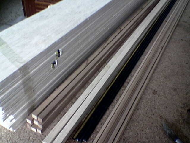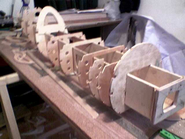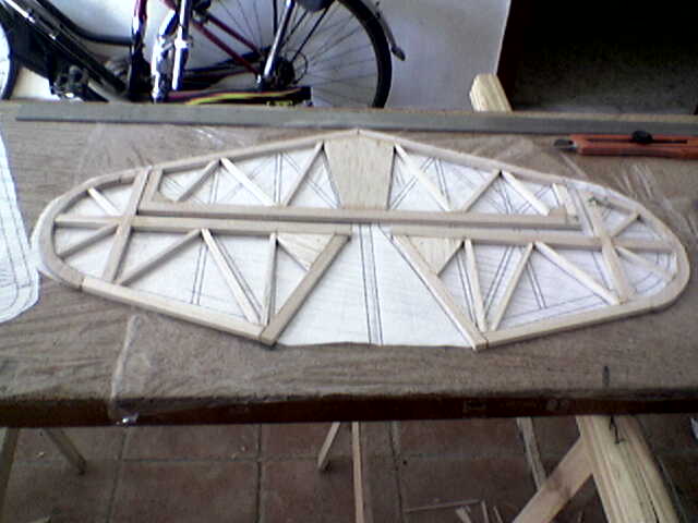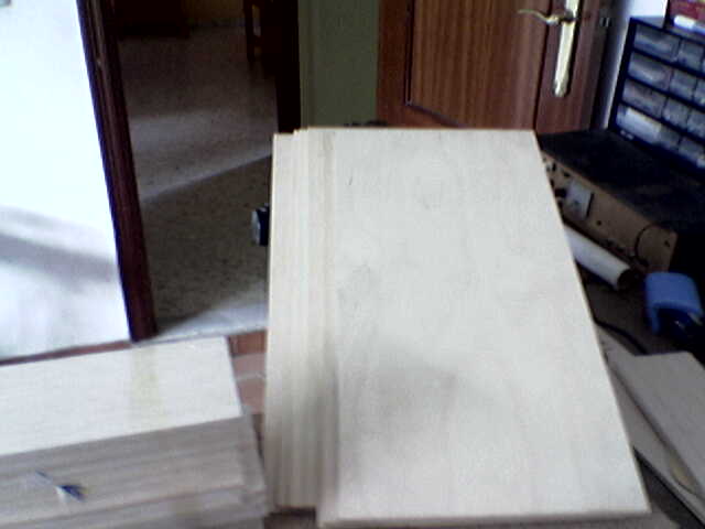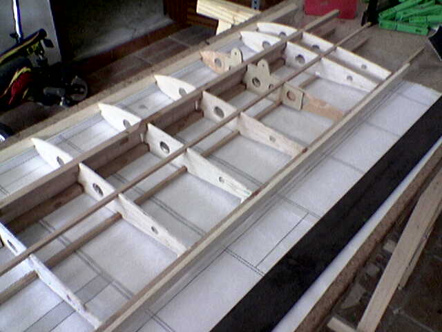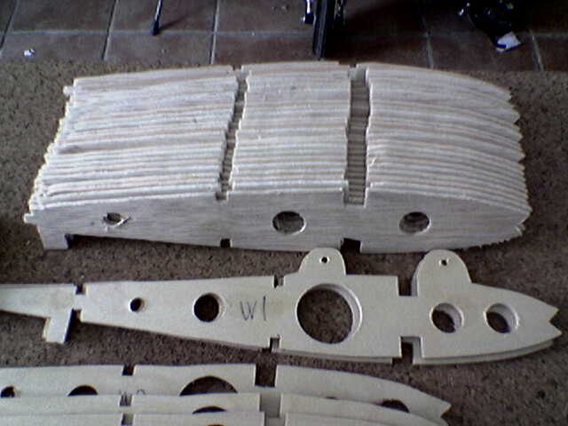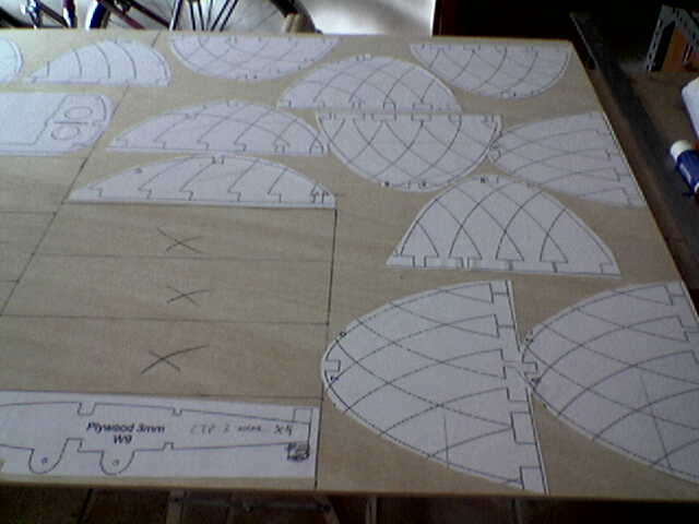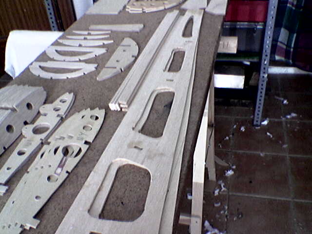 En el diseño original se usa principalmente contrachapado de 3 mm. para cuadernas, latrerales del fuselaje, algunas costillas, etc. y balsa de 1.5, 2, 3 y 10 mm. en el resto de piezas. El contrachapado multicapa en muy pocas piezas y refuerzos. Para mi modelo he pensado que el contrachapado (en adelante ctp) de 3 mm. es poco espesor, al menos a mi se me rompe en las manos, asi que lo he sustituido por 5 mm. y para ello he tenido que redibujar algunos encastres de cuadernas etc., nada dificil. Asimismo los laterales del fuselaje los he reforzado en ctp multicapa de 2 mm. y unos listones de pino de 5x5 desde el final del refuerzo de ctp hasta la cola, con lo que ya he quedado satisfecho en cuanto a su consistencia. Los planos de cola, segun el plano, se hacen en celosia de balsa de 10 mm, pero buscando mas solidez (soy muy maniatico en esto) y teniendo en cuenta el "sobrepeso" que supone el 3w, los voy a construir con celosia de 6 mm y enchapado por las dos caras en balsa de 2 mm. para, al final, llegar a los 10 mm. pero con algo mas de peso, evidentemente. Hay algunos pequeños errores en el plano, en concreto la pieza F9 (soporte las alas, que no indica con que material hacerlo, la he hecho con ctp multicapa (en adelante ctpm) de 5 mm., la costilla W9 que tiene dibujado el soporte de alineacion en el lado contrario a donde debe estar y la cuaderna F9 que no tiene dibujados los encastres de los listones en su parte inferior. Aparte de esto, voy a modificar la sujecion del ala superior en su parte central y un poco algunas costillas, ya que la bayoneta que voy a usar no es la prevista en el plano. En fin, me dejo muchas cosas en el tintero que ya ire poniendo, pero es que el "tocho" tiene ya un tamaño importante. Os pongo fotos, que nos gustan a todos, pero os advierto que la calidad no es la mejor ya que estan hechas con el movil, no tengo camara