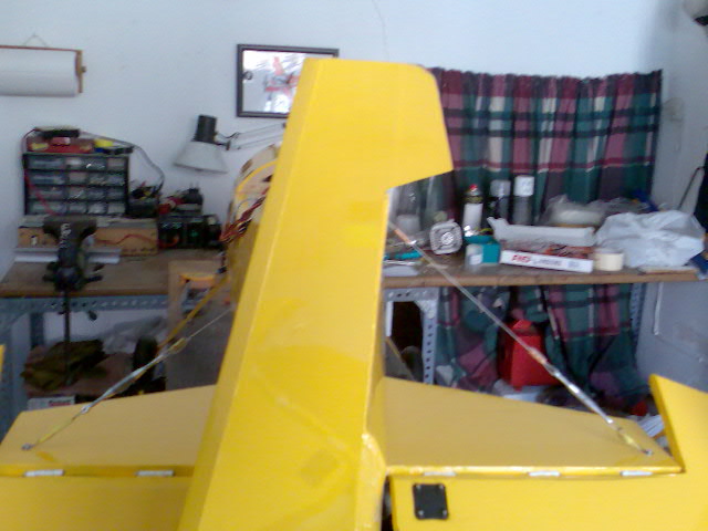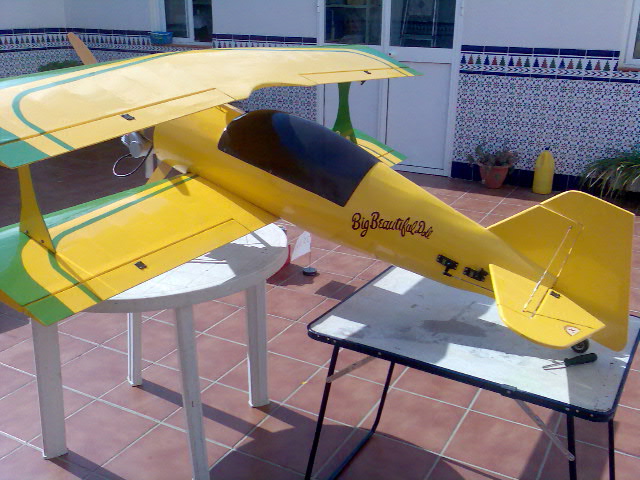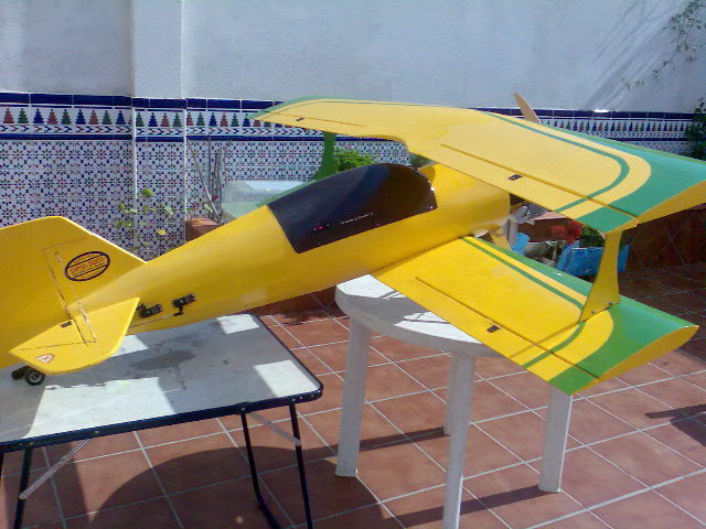 Hola a todos de nuevo. Os cuento los progresos que ha habido en estos dias: :D :D He estado decorando el "parato" y me queda pendiente el carenado de motor para acabarlo del todo. Este carenado no lo puedo terminar hasta que este aqui el escape, que espero recibir en esta semana. Despues de ponerlo y rodar el motor, sera el estreno :D Aparte he estado pòniendo servos, transmisiones, cables, etc. Falta por decidir la situacion de las baterias, que sera al final para centrar el modelo, sin lastre, espero. Para las transmisiones de las superficies de mando he usado varilla de acero de 2.5 mm., Kwick-links de metrica 3, horns de gran escala de Du-bro y rotulas en los servos, quedando absolutamente rigidos, suaves y libres de holguras todos los mandos :) . La instalacion electrica (de los servos y alargadores) esta hecha con cable trenzado de 0.35 mm. para que no haya perdidas de voltaje ni señal. Para el corte de encendido he puesto un ZS-3 (interruptor electronico optoacoplado :shock: ), todo ello a traves de la centralita. En cuanto al peso, a falta de confirmarlo 100 % cuando acabe, esta en este momento en 9.5 kgs., con lo que he conseguido que no pasara de los 10 kgs. que me puse como tope :) . En fin, no os aburro mas, os pongo fotos de lo nuevo. Hasta pronto, un saludo a todos.