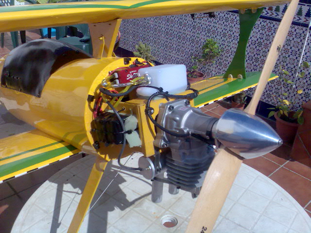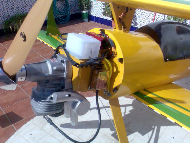 Hola de nuevo, os comento que ya casi estamos al final, la decoracion, salvo pintura del carenado de morro, ya esta acabada. :D La instalacion de todo el equipo de a bordo, tambien. :D Ademas, he arrancado el motor y... musica; una sensacion de potencia enorme (preguntadle a mi pobre hijo mayor con el empenaje de cola marcado en los tobillos :( ) y, al conectar el humo, bueno... el remate. :D con la particularidad de que el liquido que he usado, de la marca 3W, huele a fresa (no es broma), asi que al poner humo huele a puesto de golosinas :shock: :shock: . Bueno, os dejo fotos nuevas y cuando pinte el carenado de morro, os las pondre tambien. Hasta entonces, un saludo a todos.